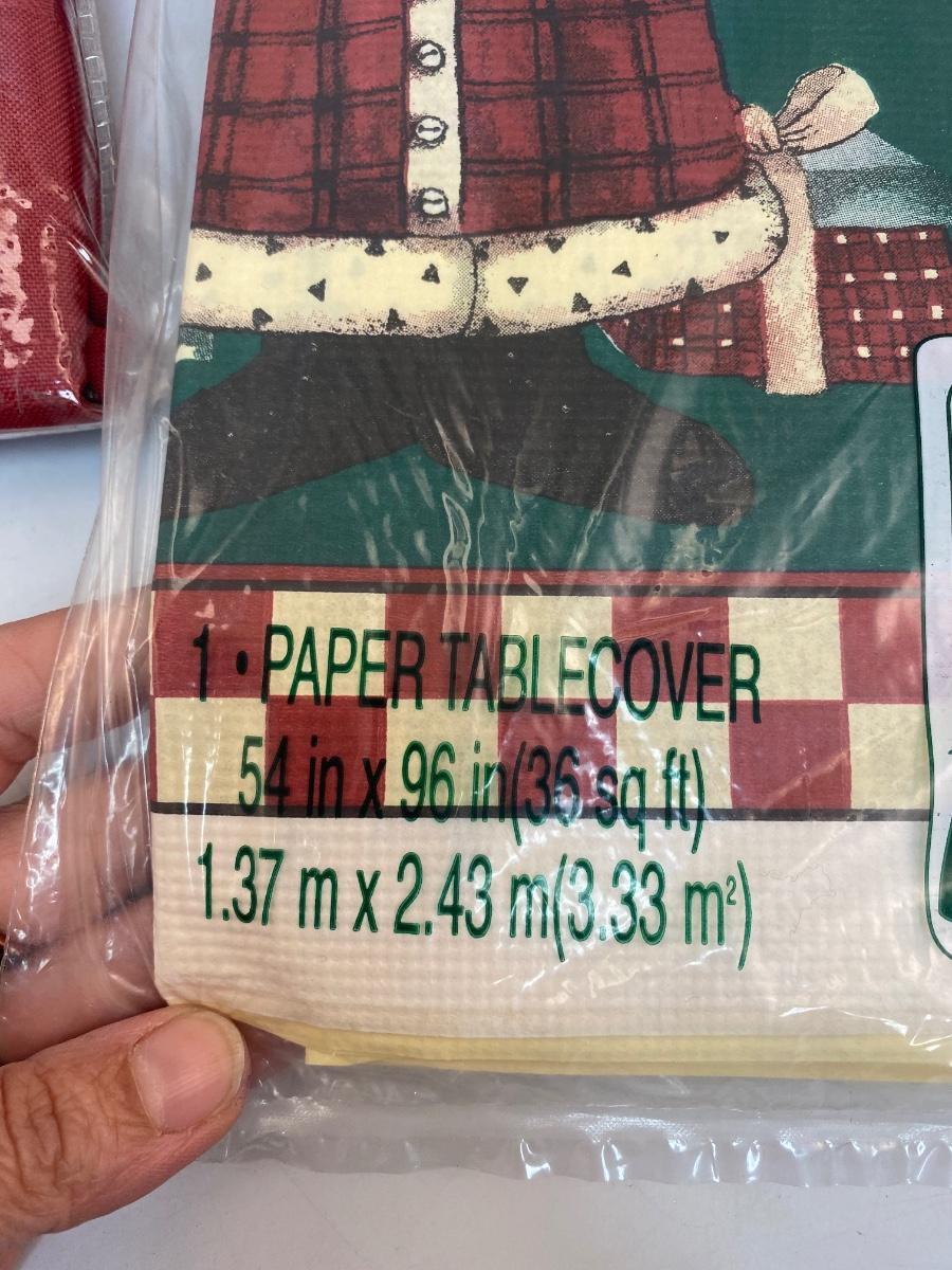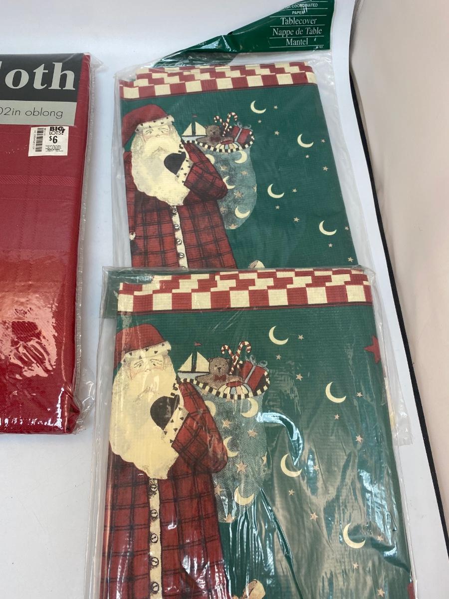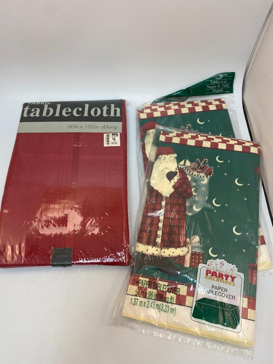 Set of 3 New in Package Table Coverings. The red one is fabric while the holiday prints are paper.