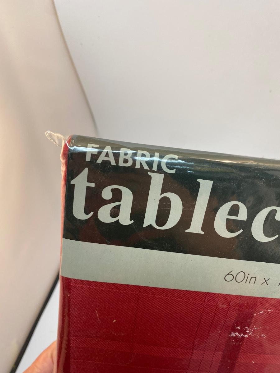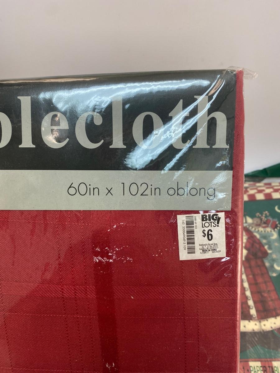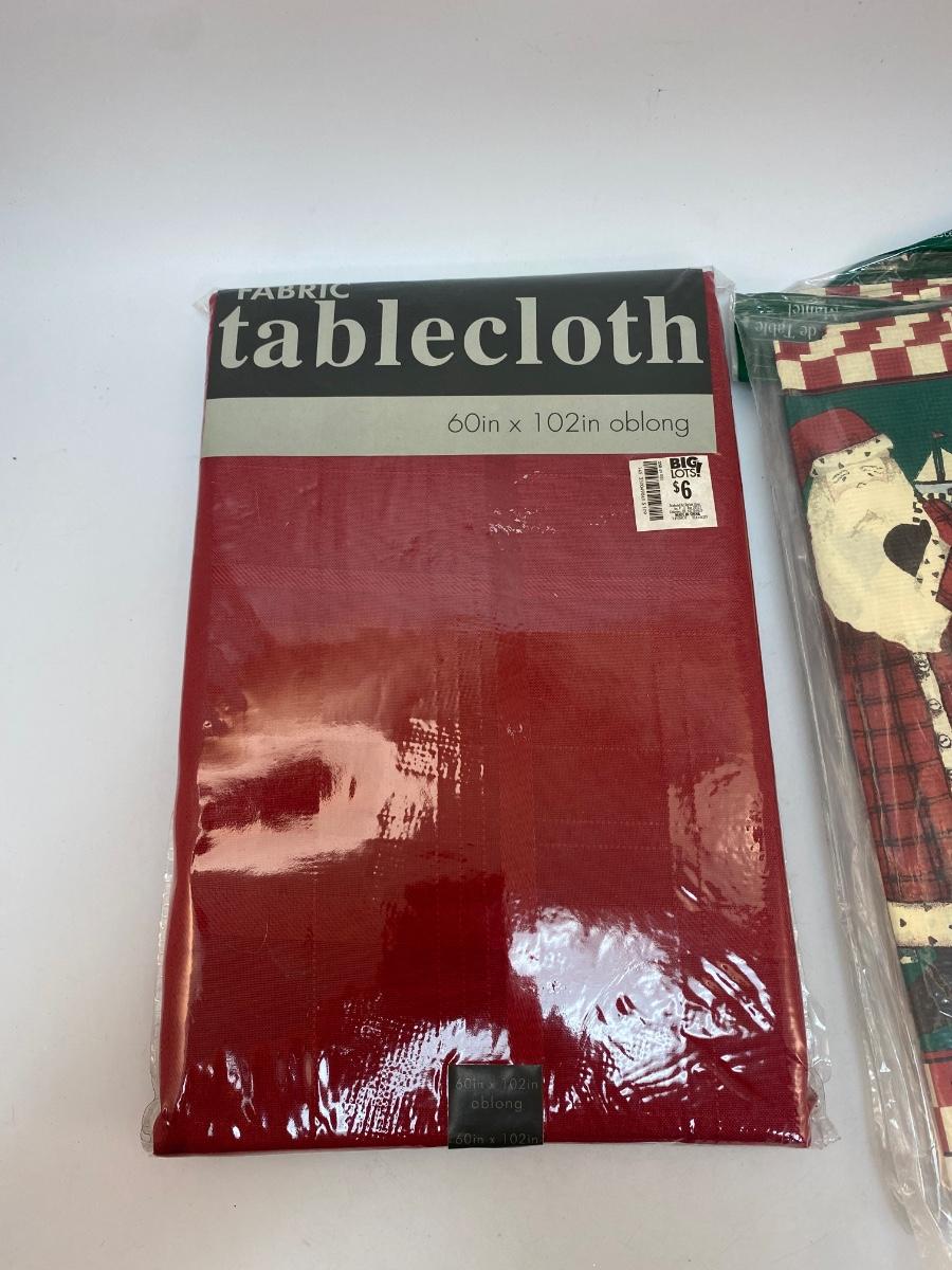 Set of 3 New in Package Table Coverings. The red one is fabric while the holiday prints are paper.