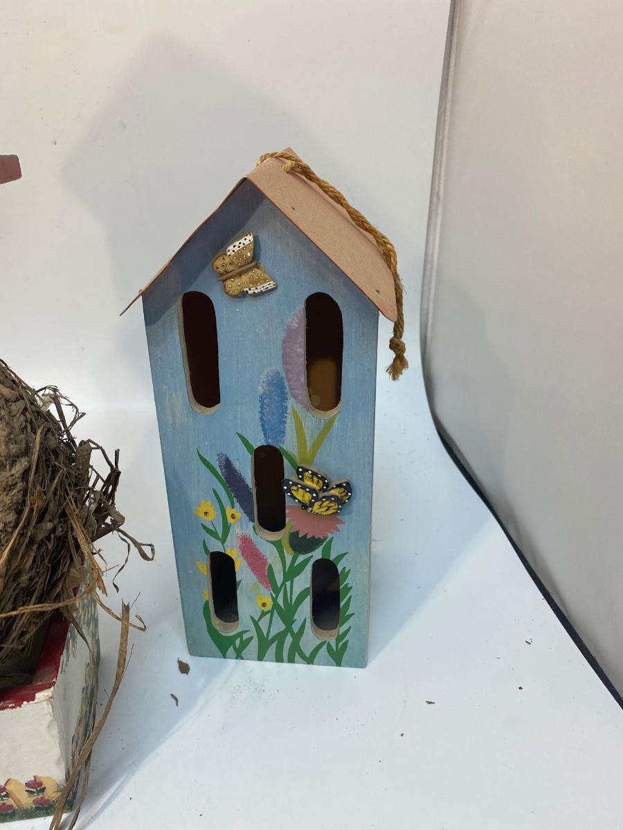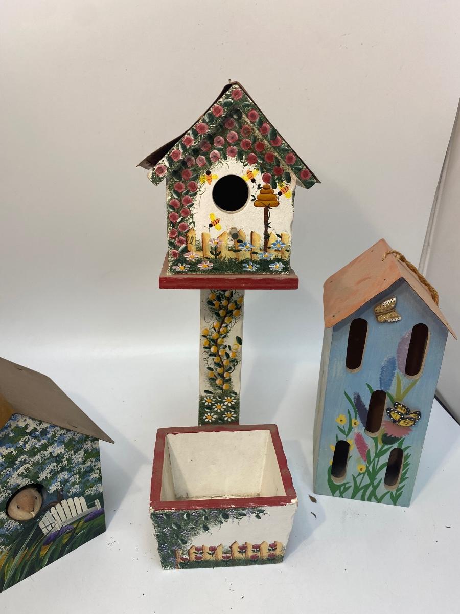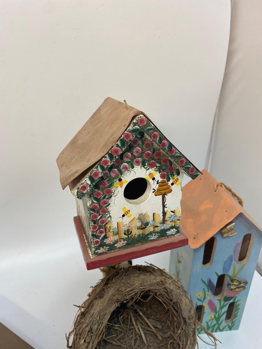 Set of 3 Painted Birdhouses Feeders Garden Yard Art & Real Bird Nest