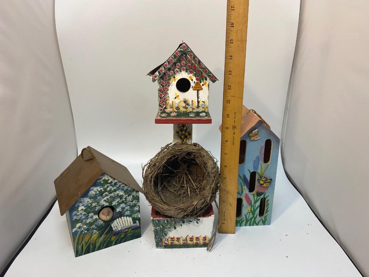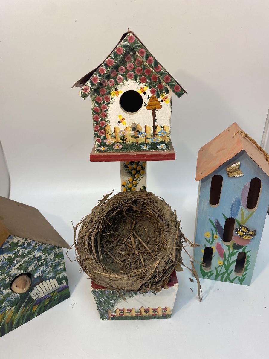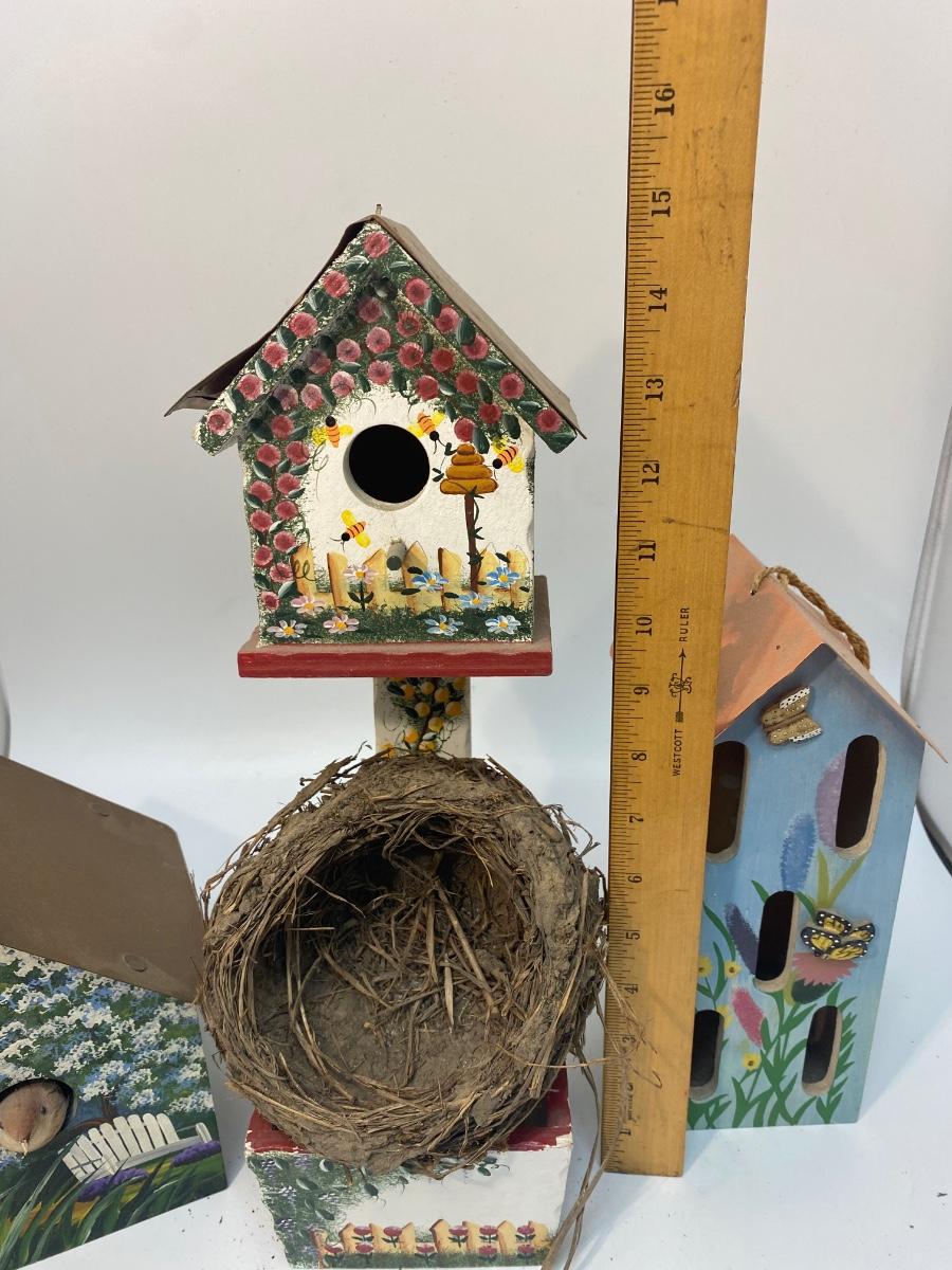 Set of 3 Painted Birdhouses Feeders Garden Yard Art & Real Bird Nest. Houses are in good condition, a little weathered from being outside. The nest does look to be a real bird's nest not a hobby store faux nest.