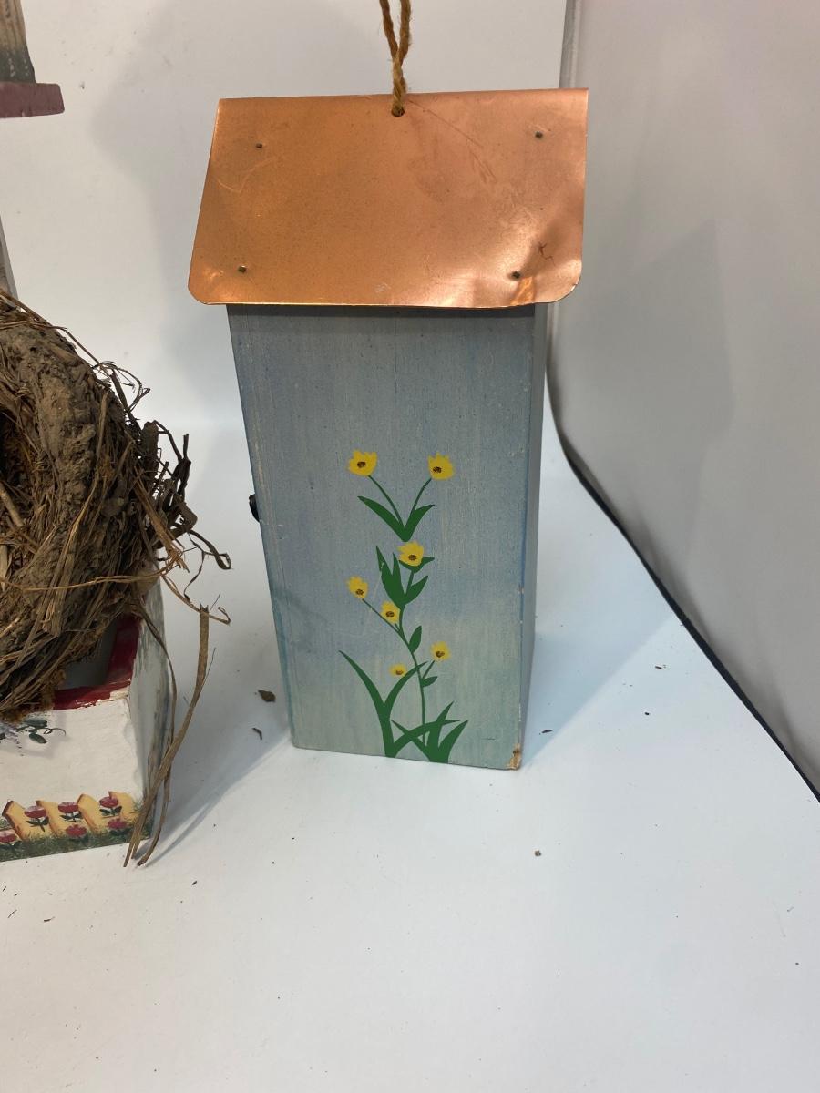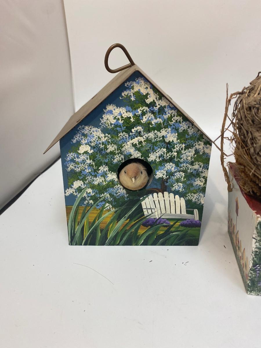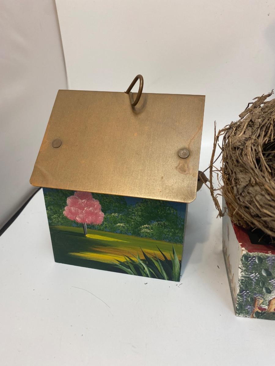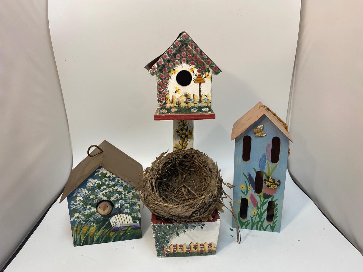 Set of 3 Painted Birdhouses Feeders Garden Yard Art & Real Bird Nest. Houses are in good condition, a little weathered from being outside. The nest does look to be a real bird's nest not a hobby store faux nest.