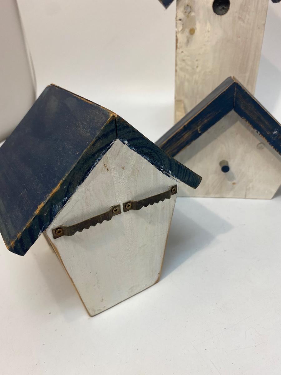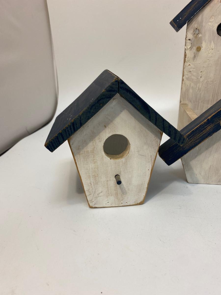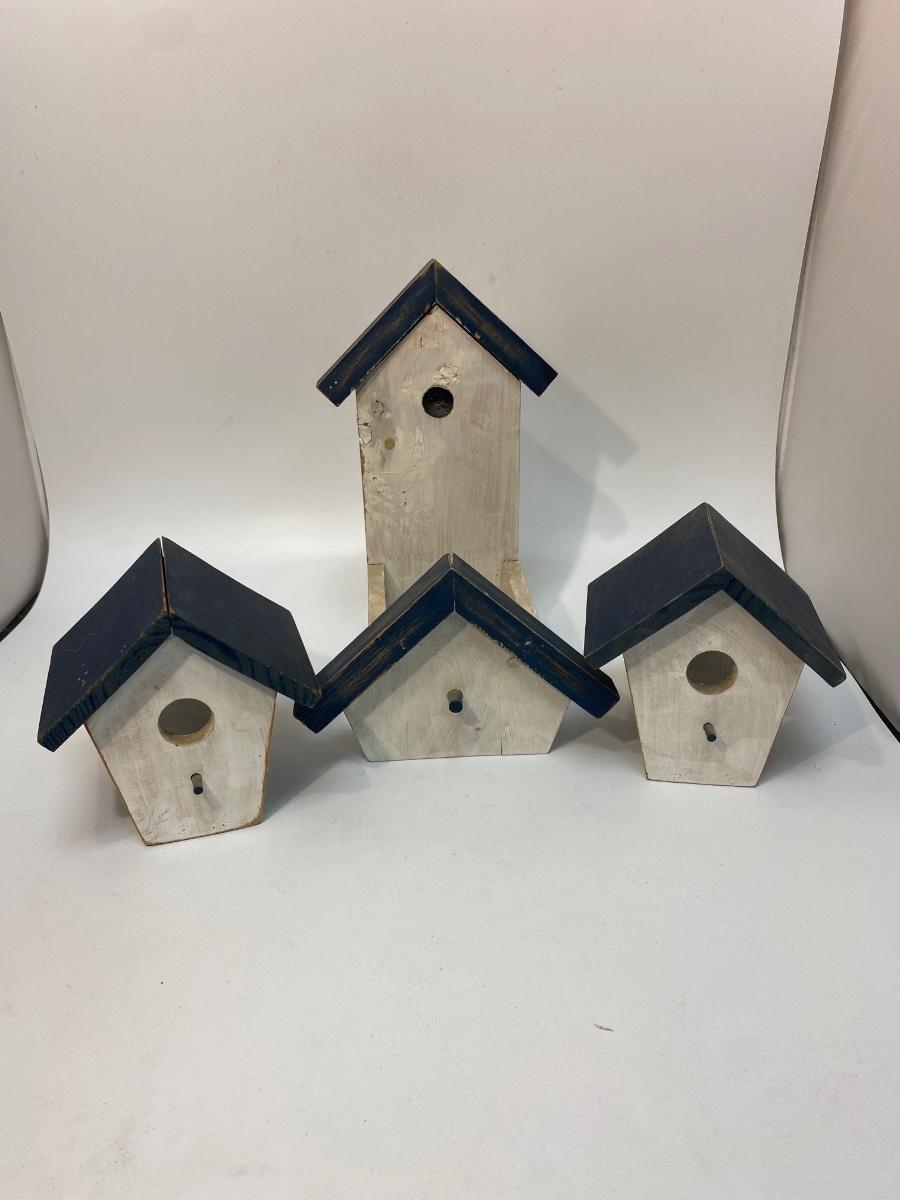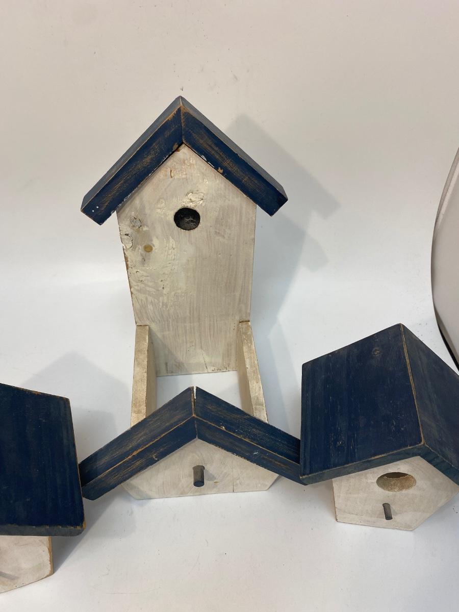 Set of 3 Painted Wood Bird Houses Garden Yard Art. Can be repainted if desired. Have brackets on back for hanging.