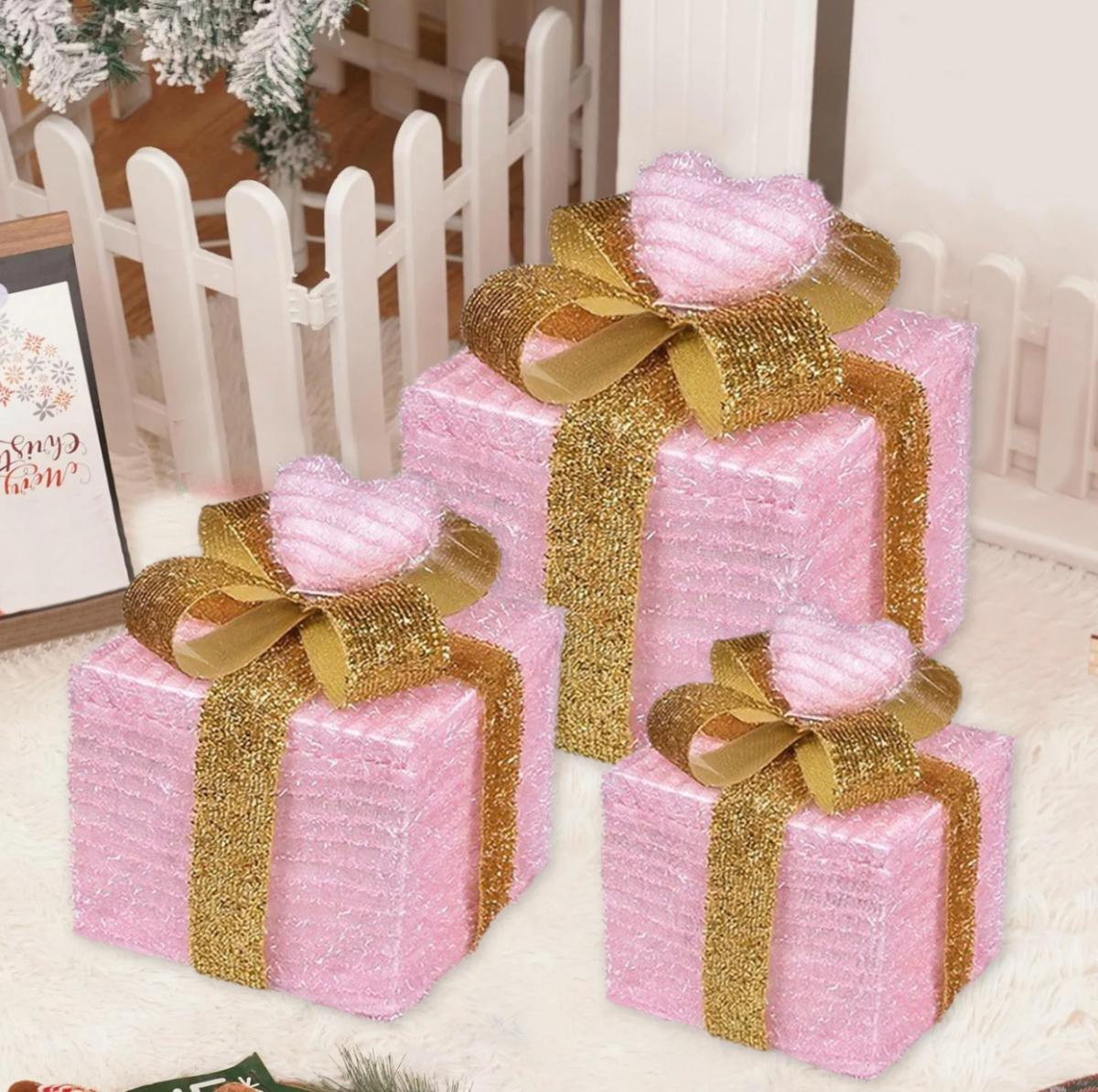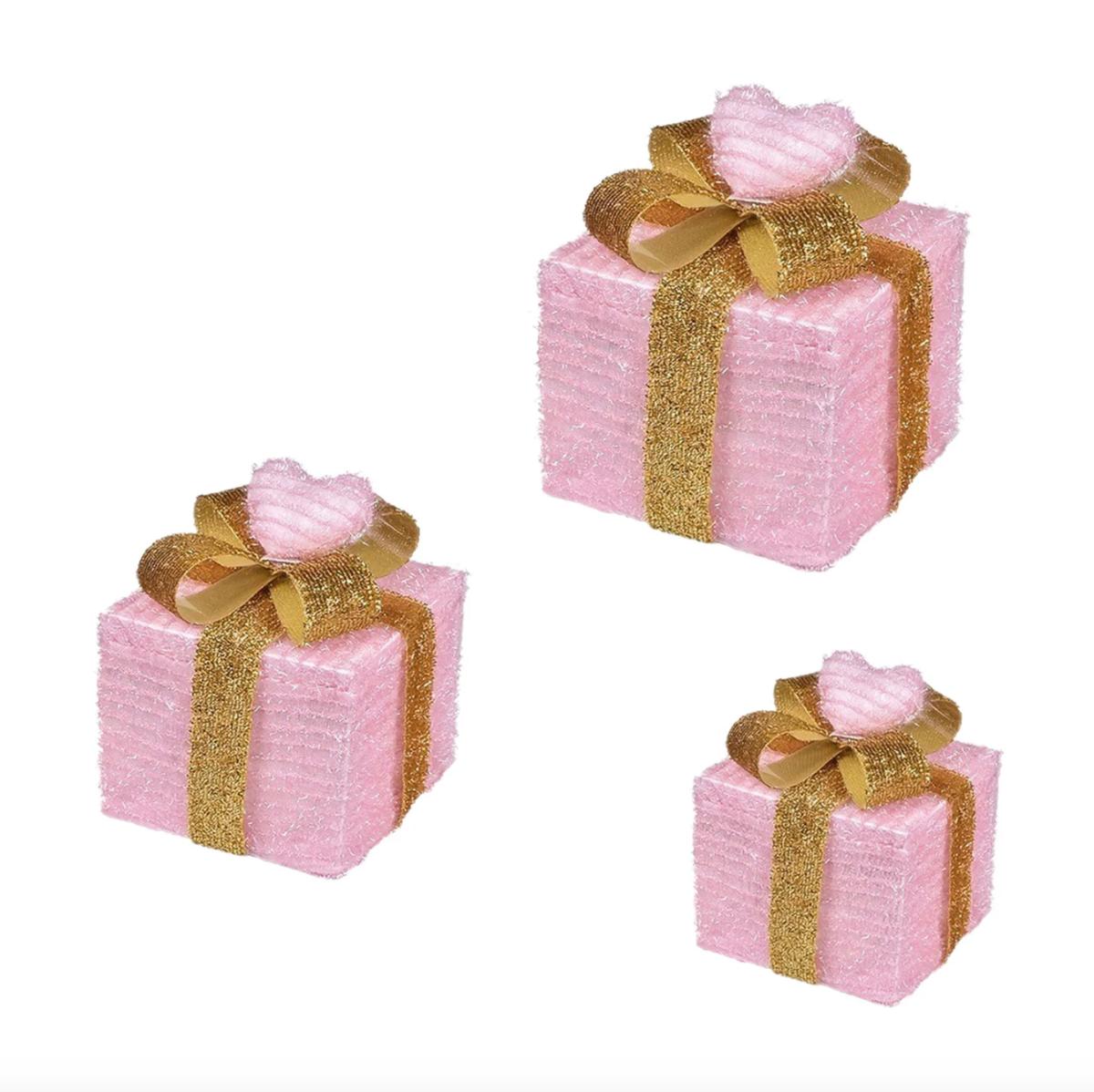 Set of 3 Pink & Gold Glitter Heart Motif Lighted Gift Box Decorations - Foldable 3PCS Present Ornament Boxes with Pre-lit LED Mini Bulb, Light Up Gift Box for Indoor Outdoor