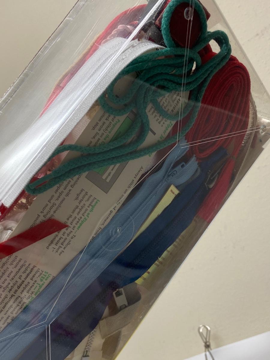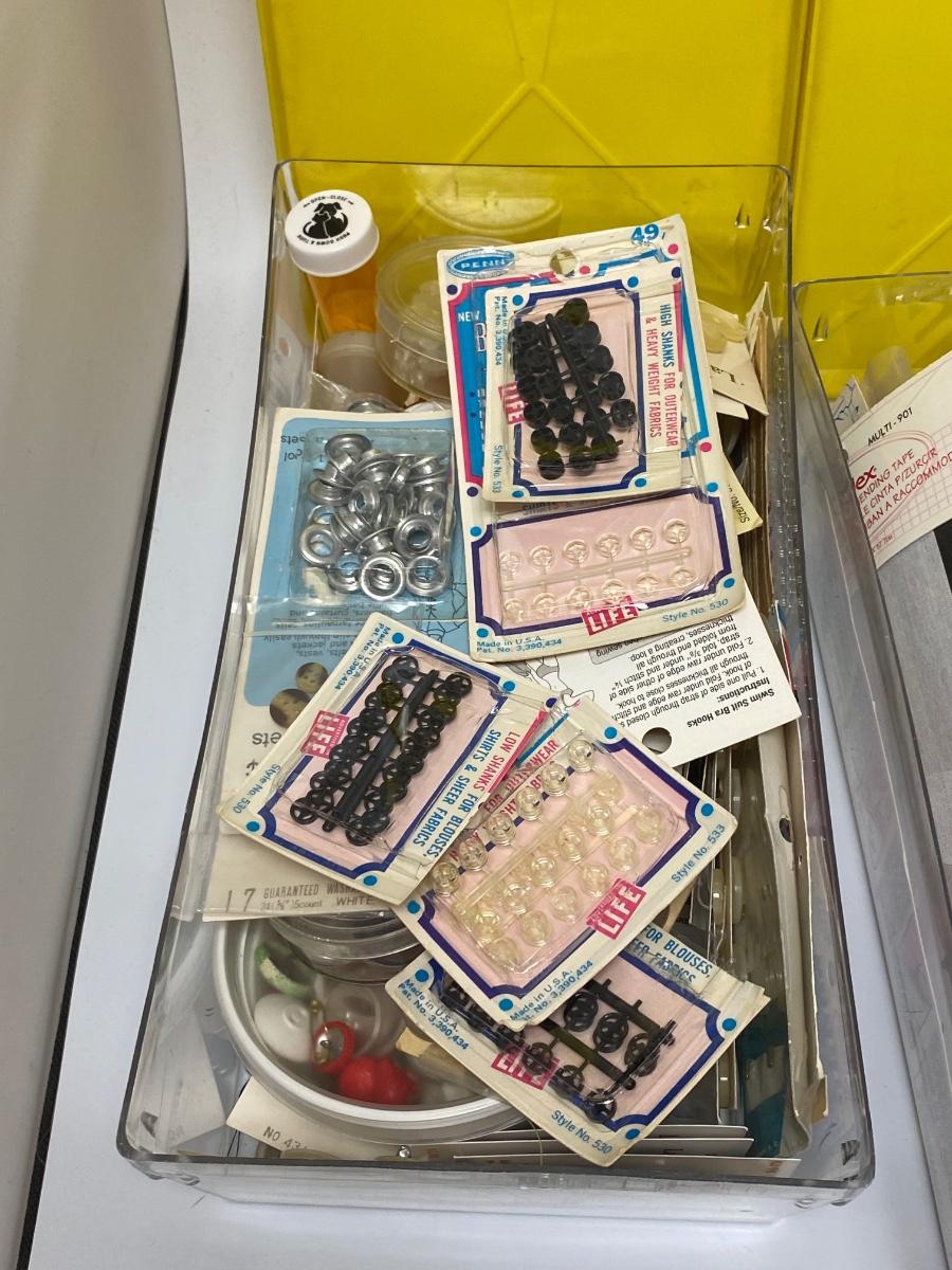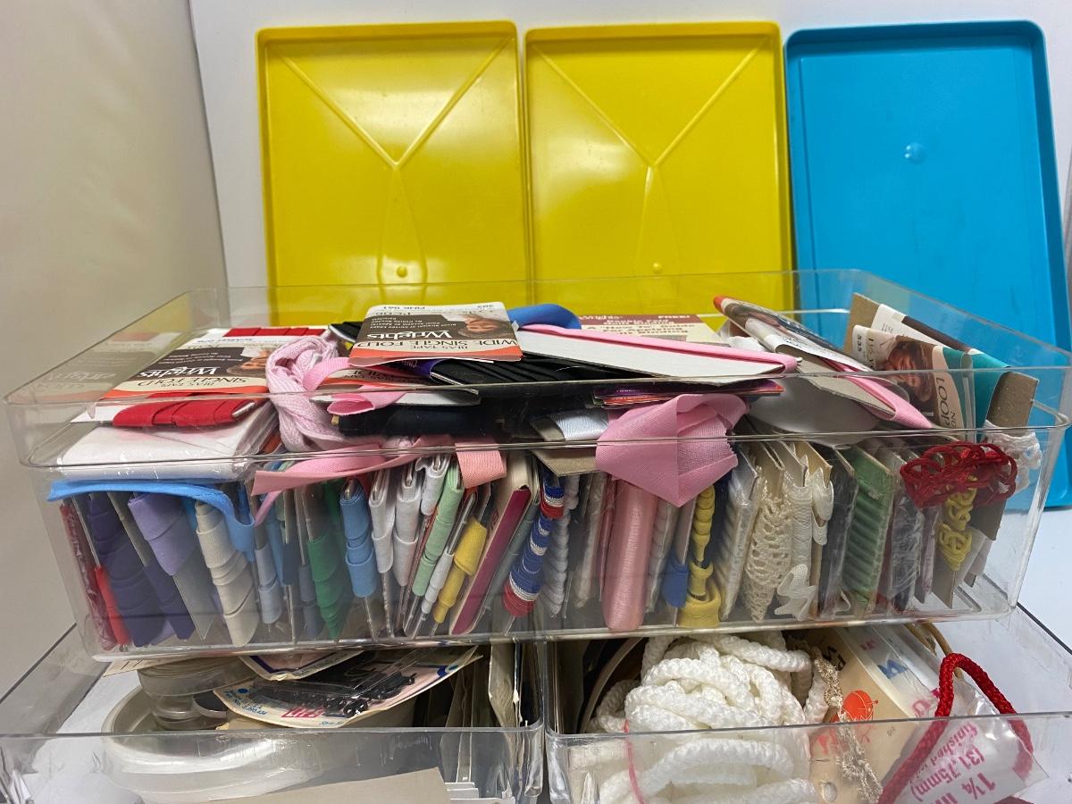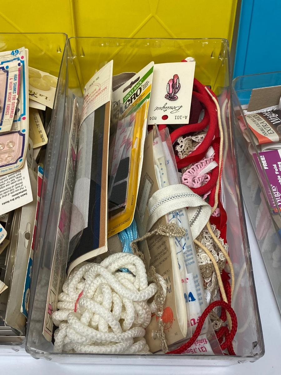 Set of 3 plastic shoe boxes filled with sewing & craft notions. Buttons, snaps, zippers, bias tape, and more.