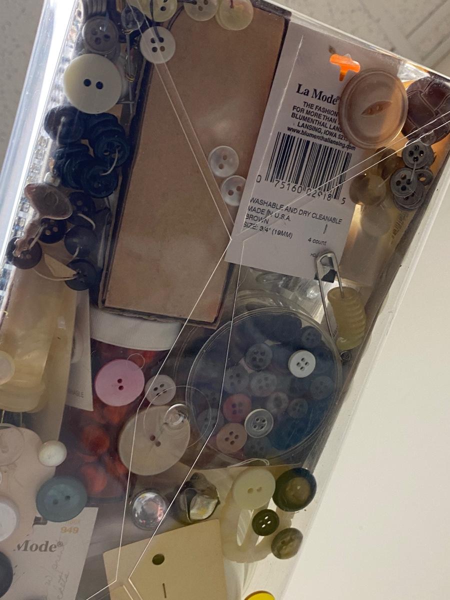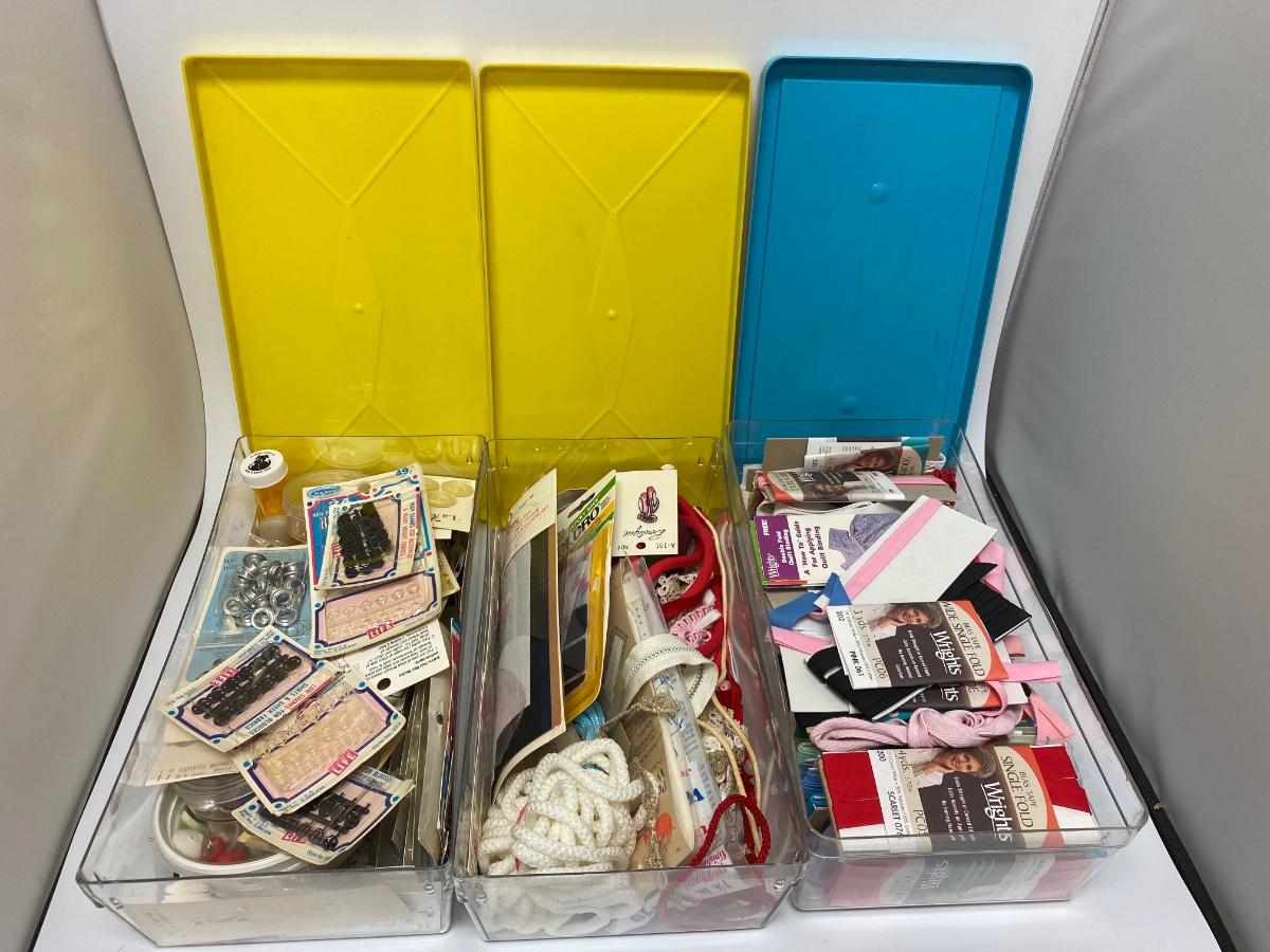Set of 3 Plastic Shoe Boxes Filled with Sewing Notions Buttons Craft Supplies