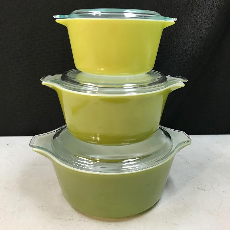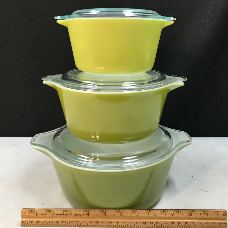 Set of 3 Pyrex Lidded Casserole Dish Bowls Verde Green 473, 474-B, 475-B