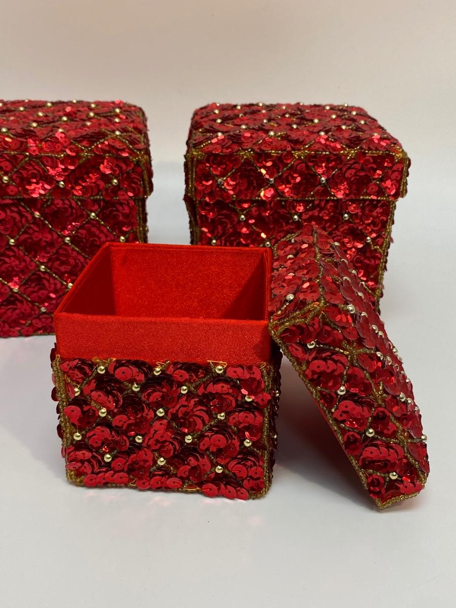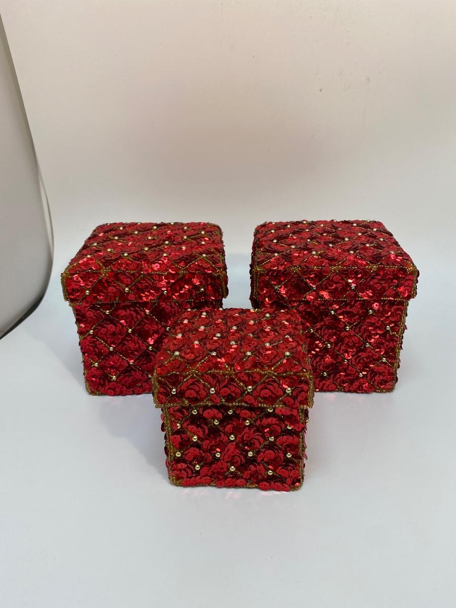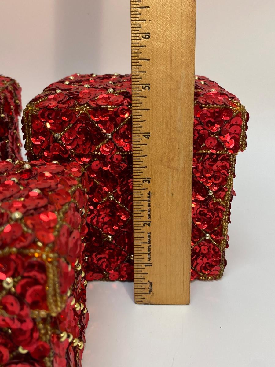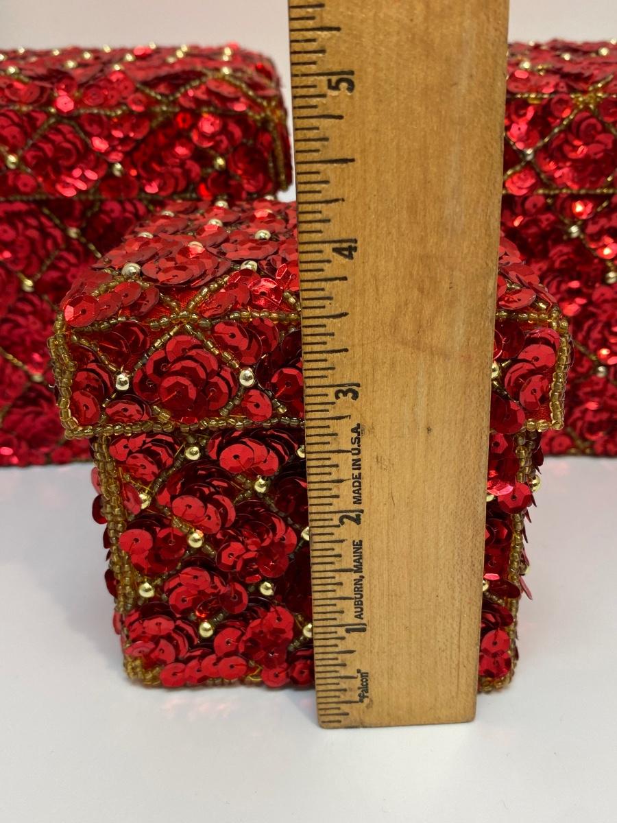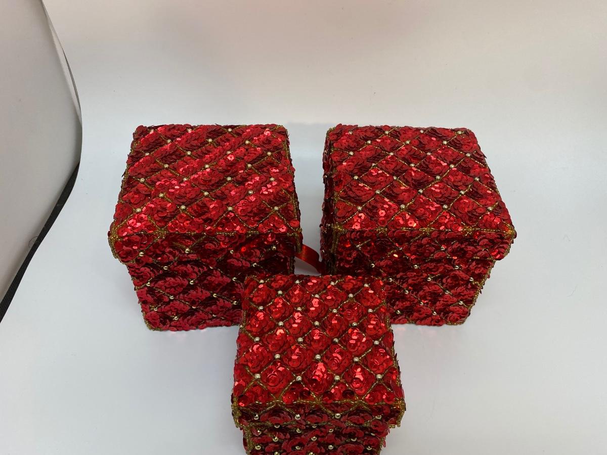 Set of 3 Red Sequin Gift Boxes. Two are the same size with one smaller. In good condition. Good for gifts or holiday decor.