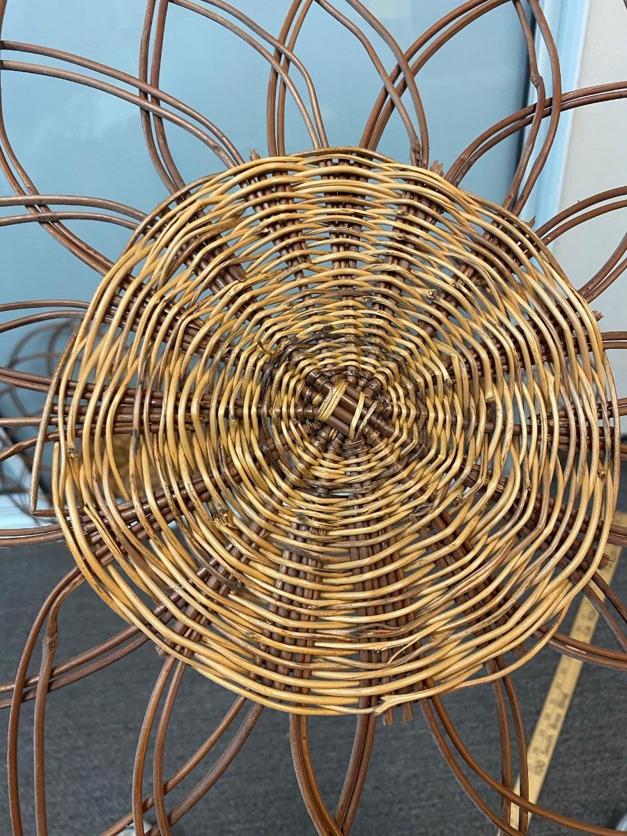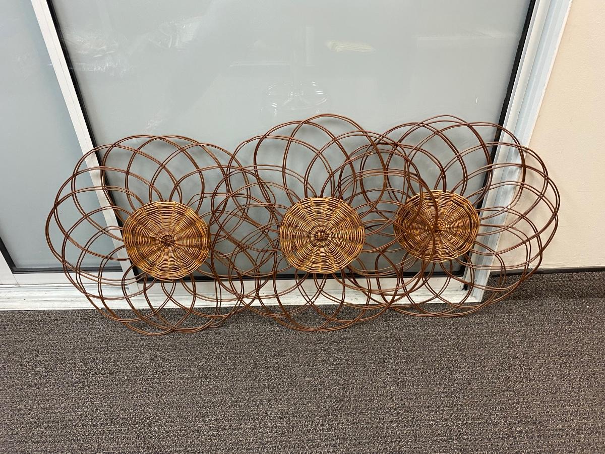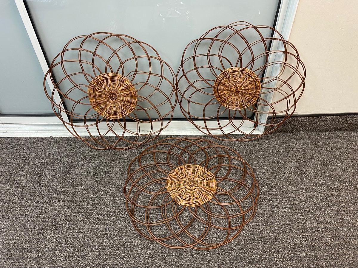 Set of 3 Retro Twisted Woven Reed Rattan Wall Hanging Flower Mandala. In good condition. Identical, all are about 20" size.
