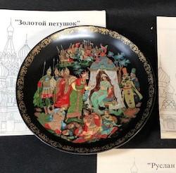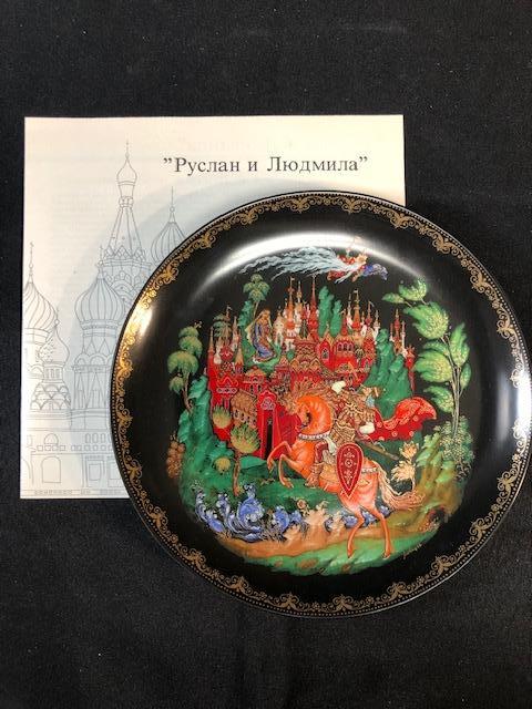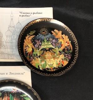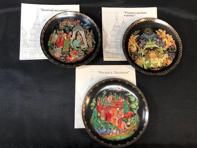 3 Russian Collector's Plates. Black background. Colorfully painted Medieval scenes. Each comes in original box and has COA. Great condition.