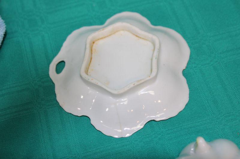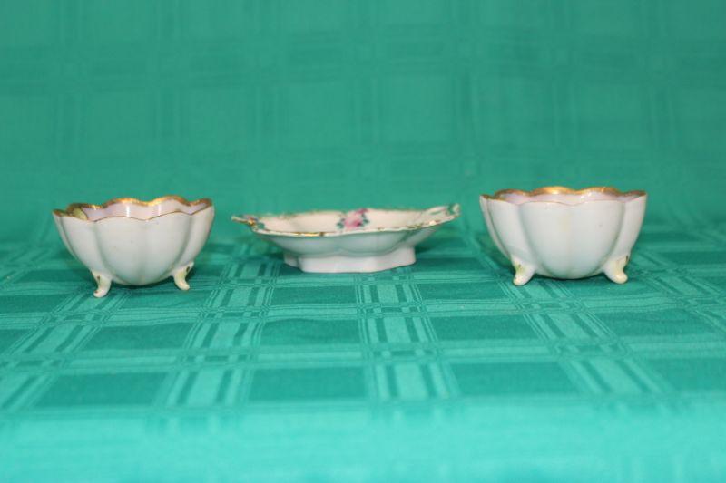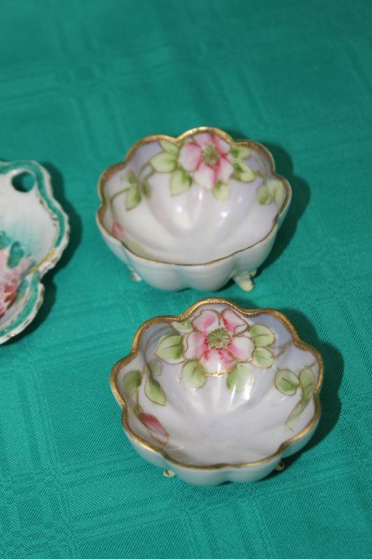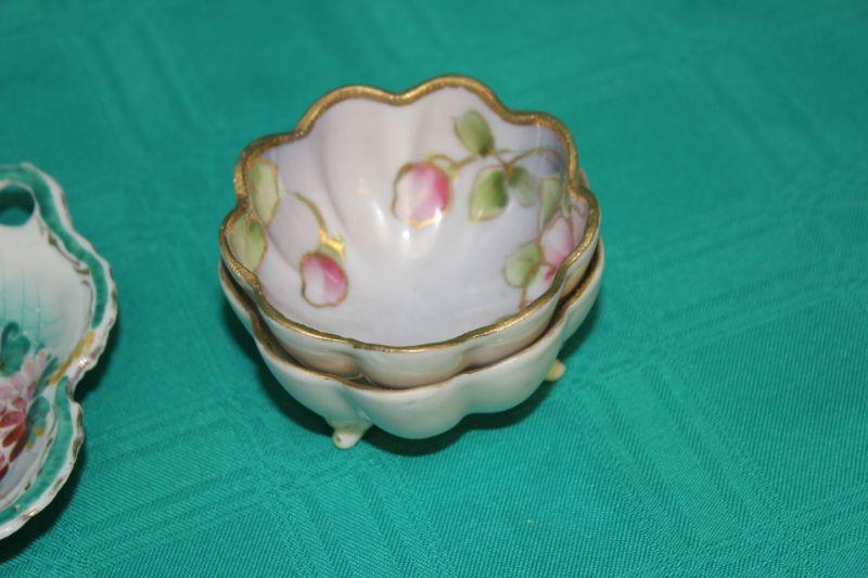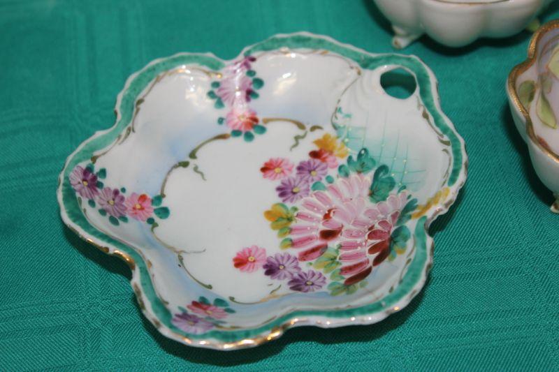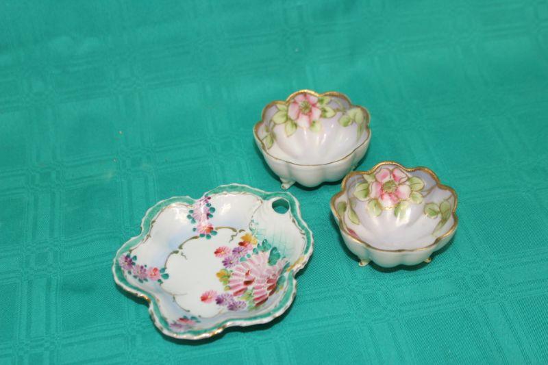 Set of 3 trinket dishes. Two are matching pattern and shape. The other is different. The matching ones are hand painted Nippon. No chips.
