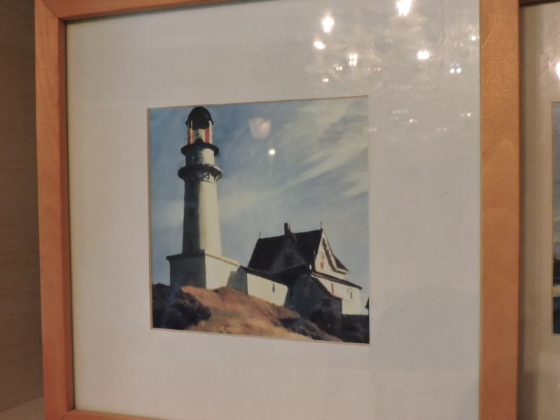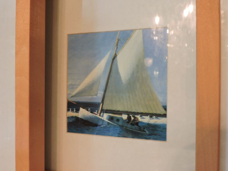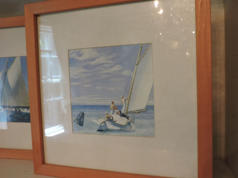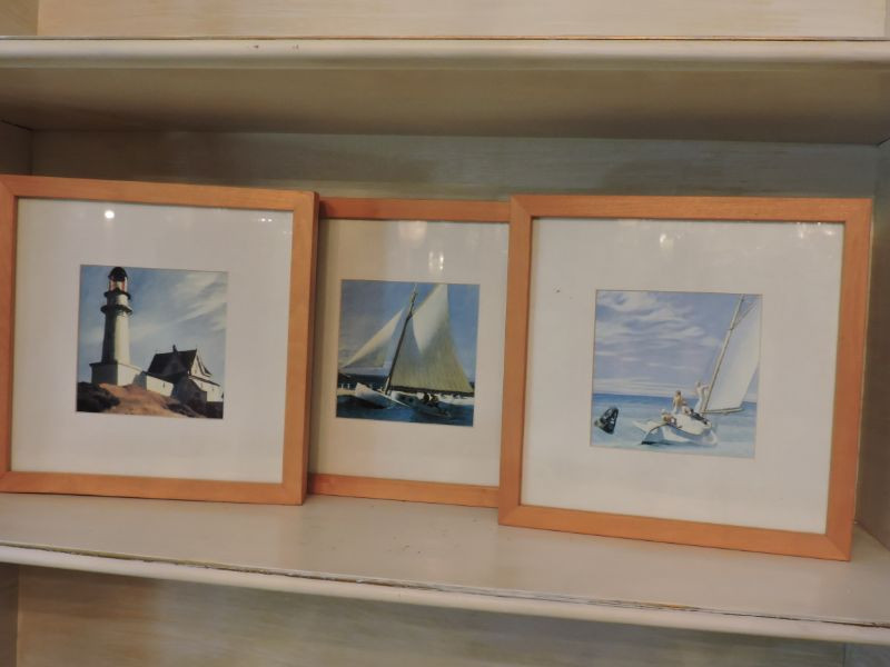 Set of three small framed beach prints. Matted in white with square oak wood frames -10”x10” (print 4.5”x4.5”)