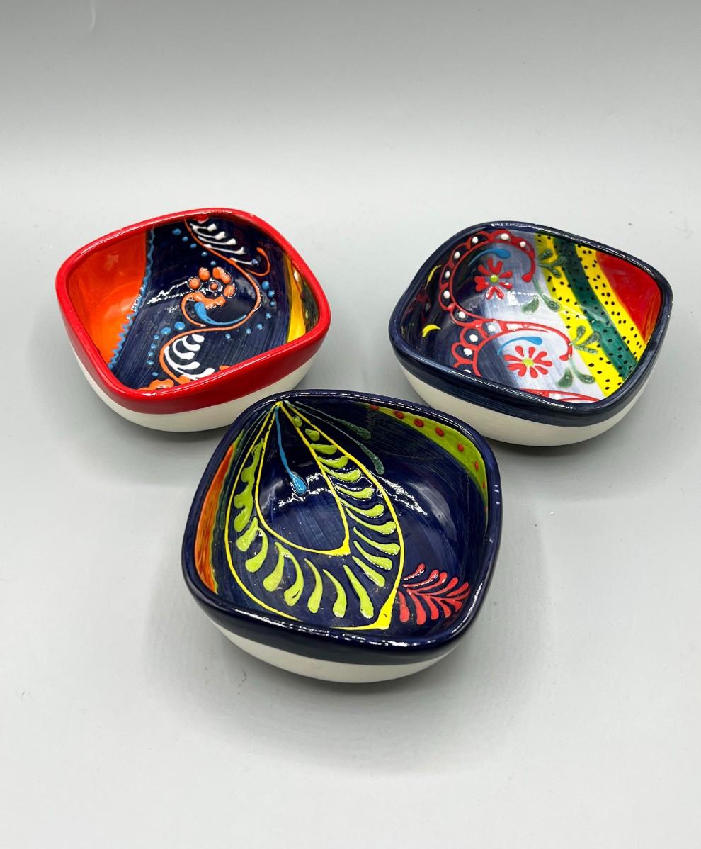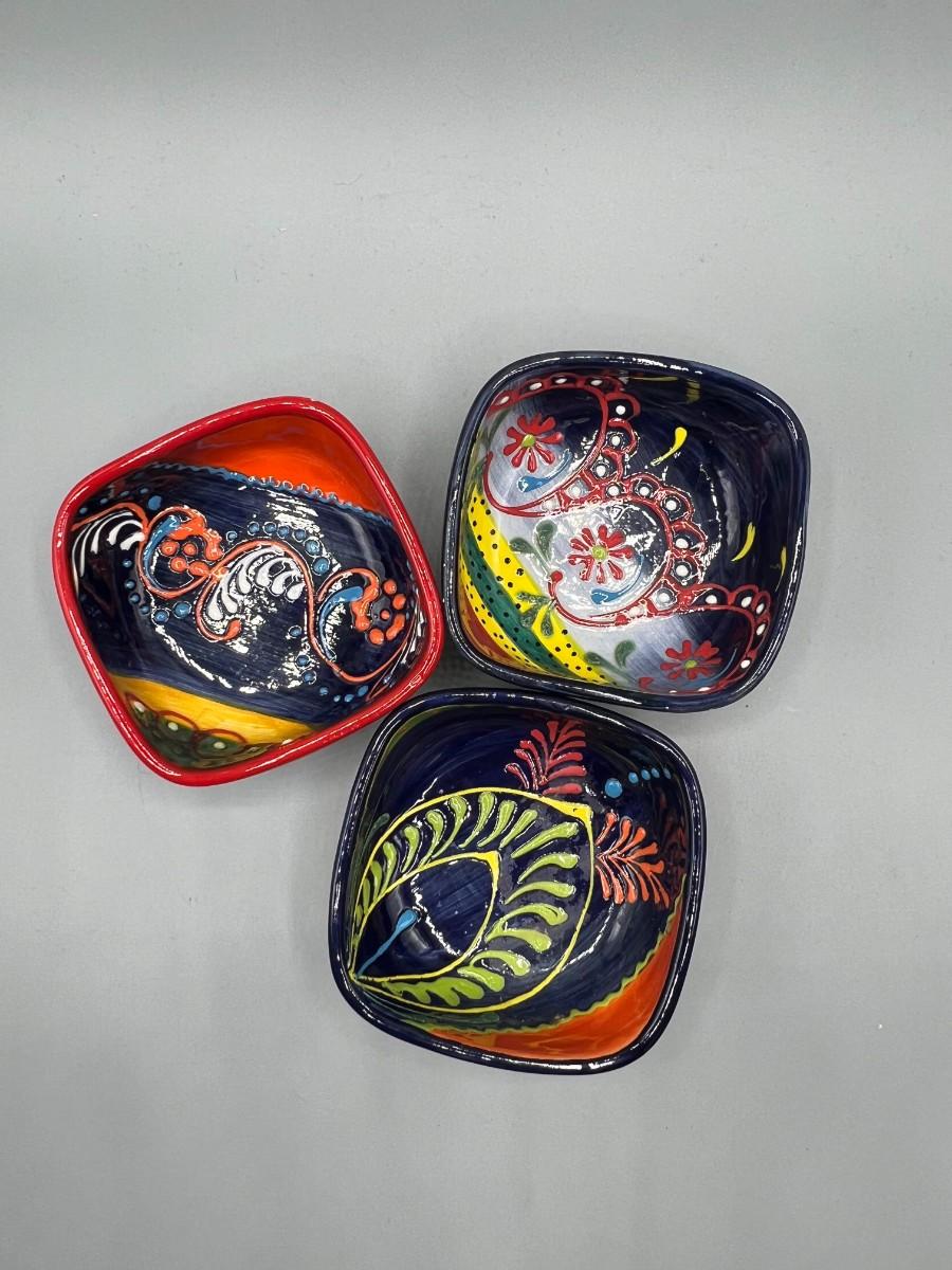 Set of 3 Del Rio Salado small square bowls. Each one has a different hand painted design. Great for fruit, dessert, relishes, or trinket dishes. About 3" size. Made in Spain.