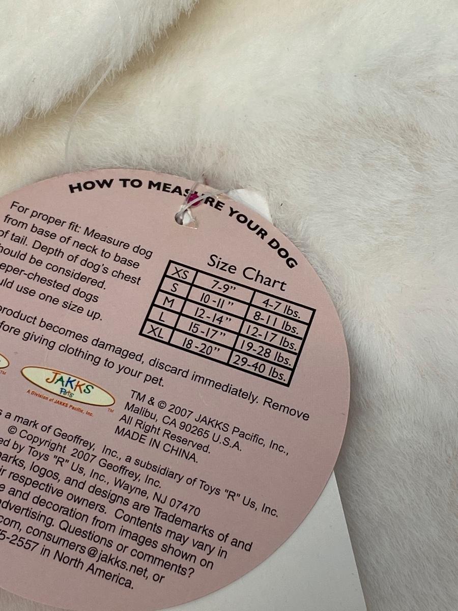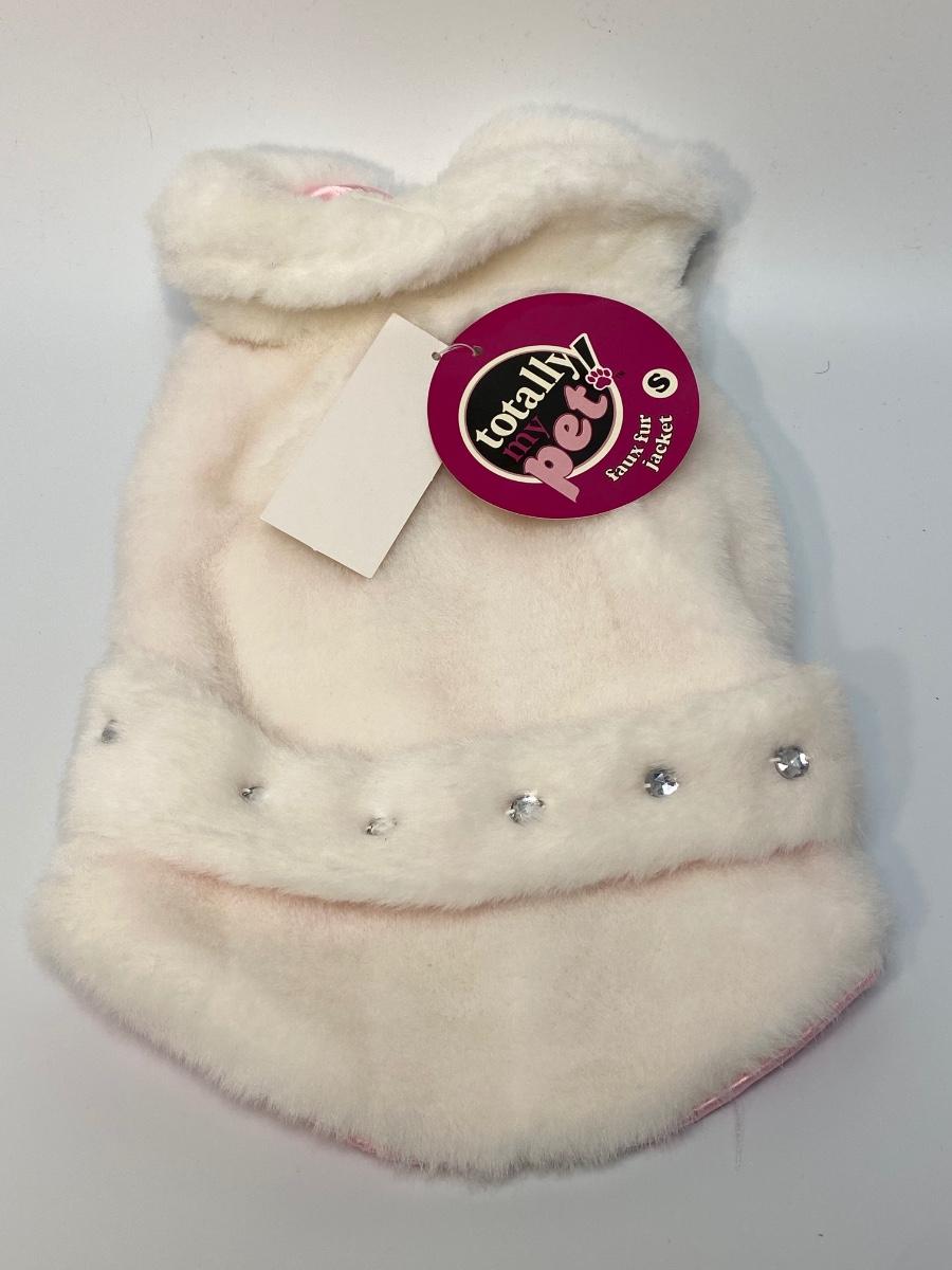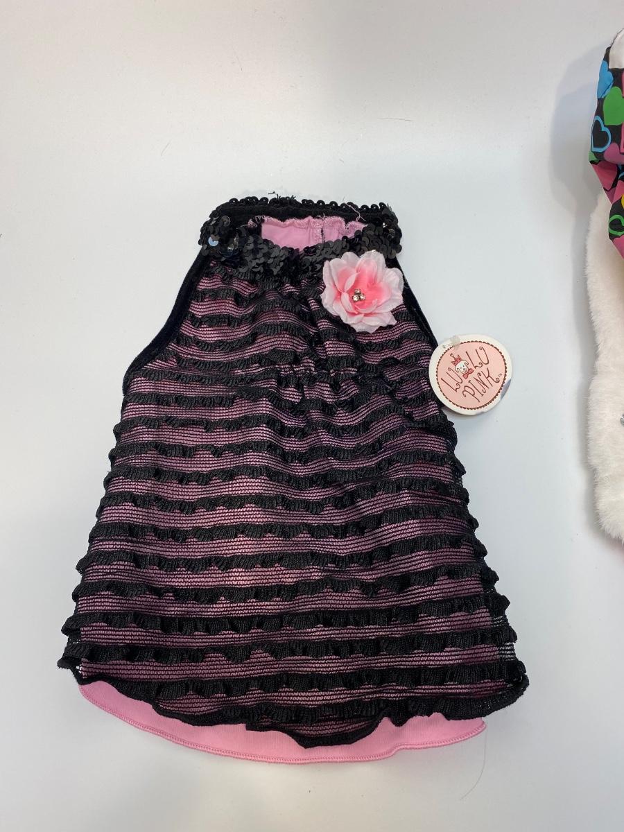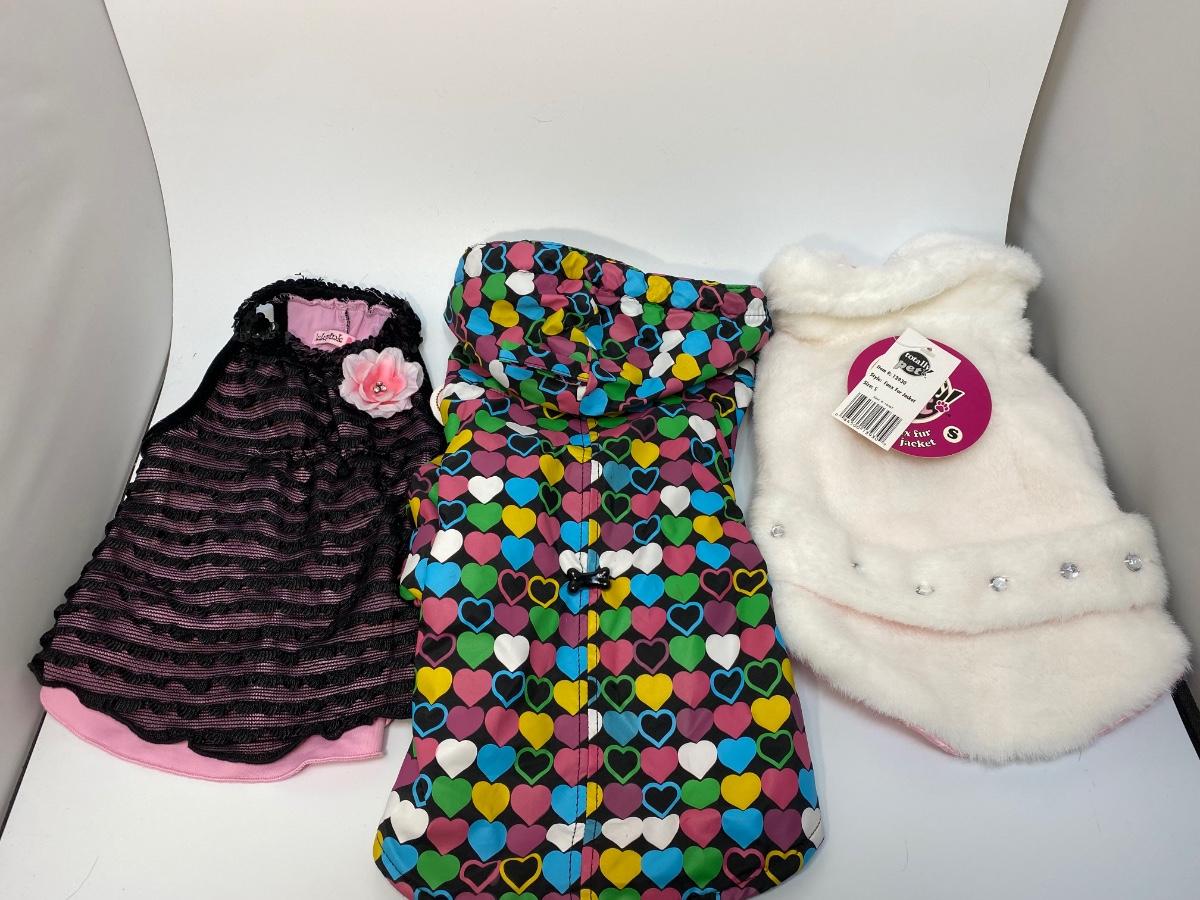 New with tags. Set of 3 small dog clothing items. Fancy dress, a raincoat, and a faux fur coat. The raincoat does not have hang tags attached but looks unused.