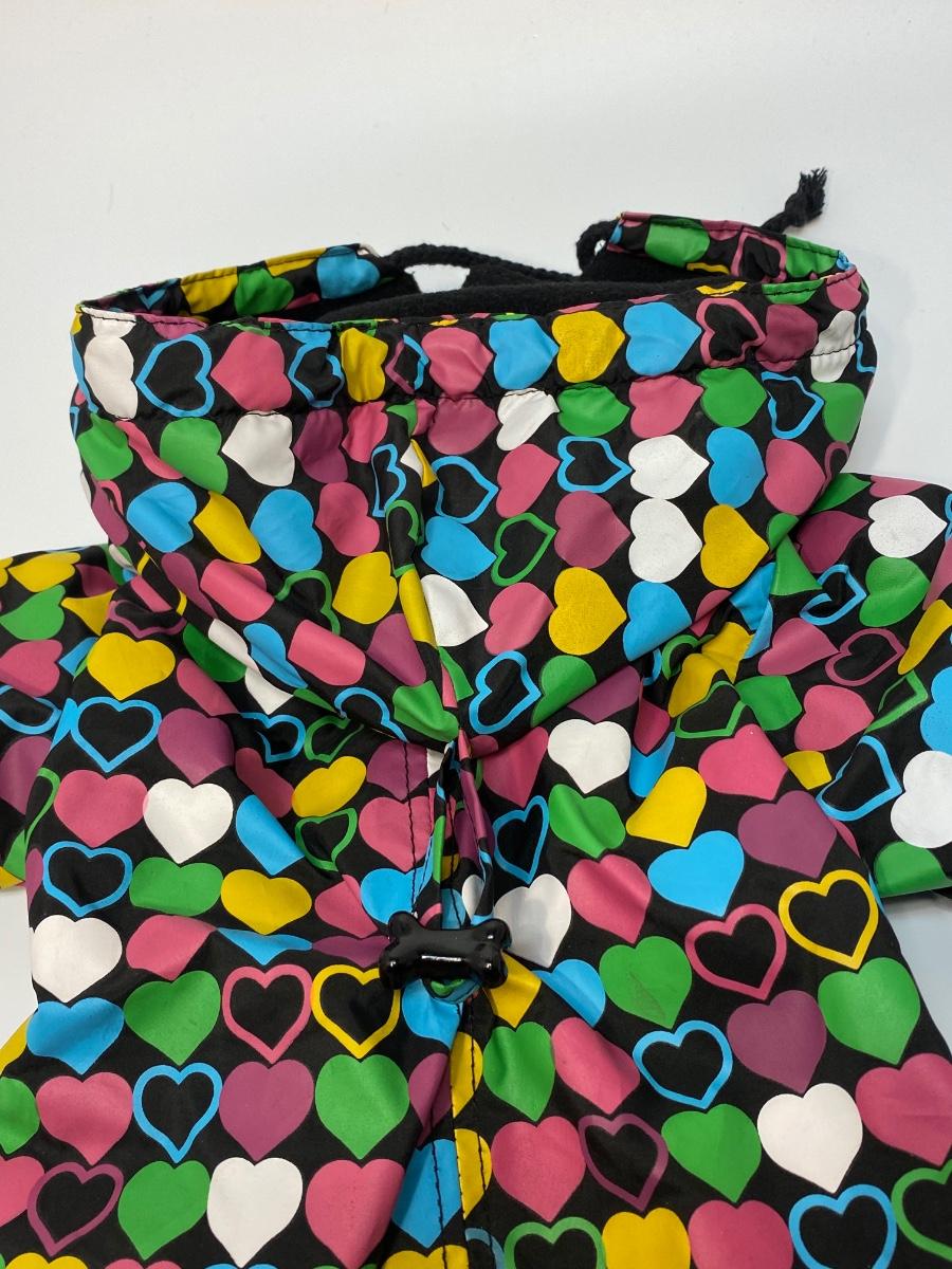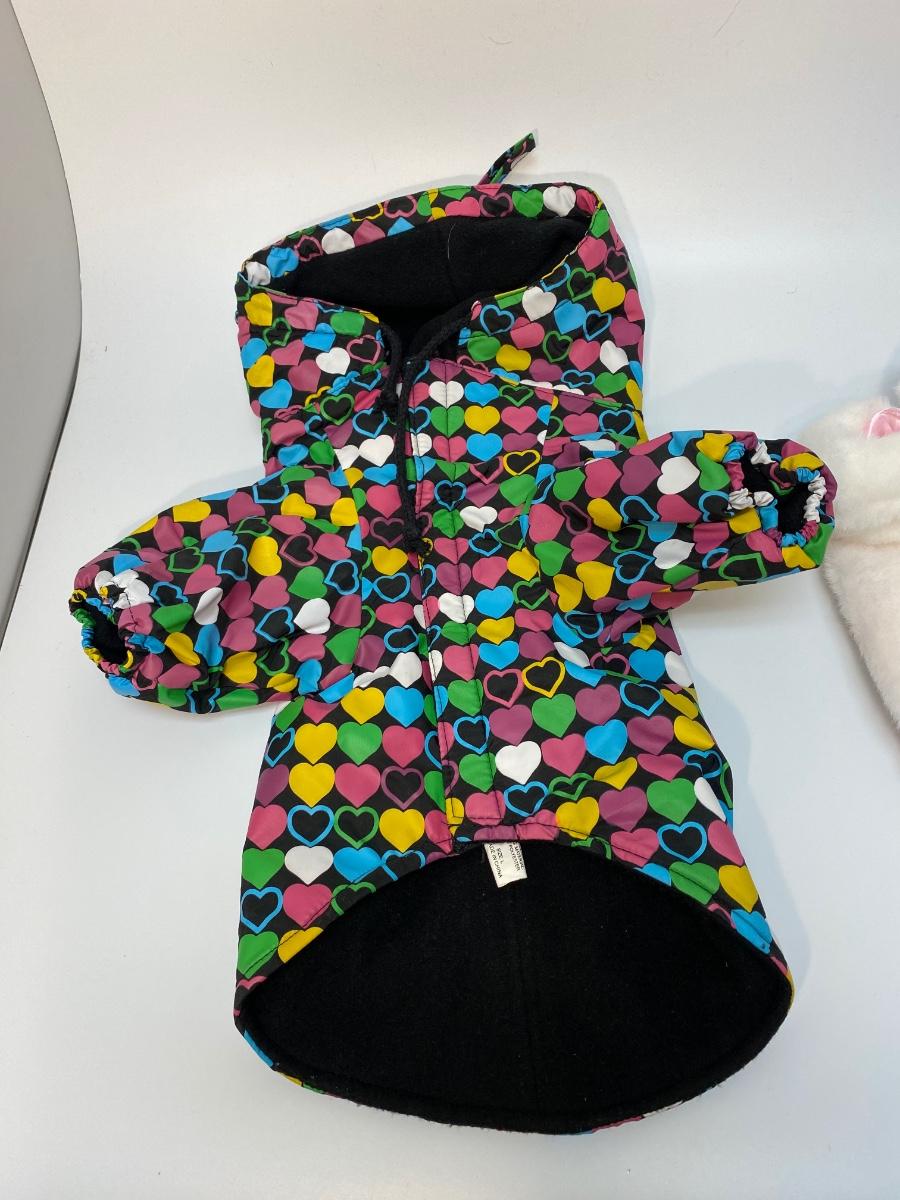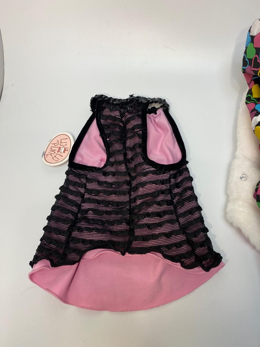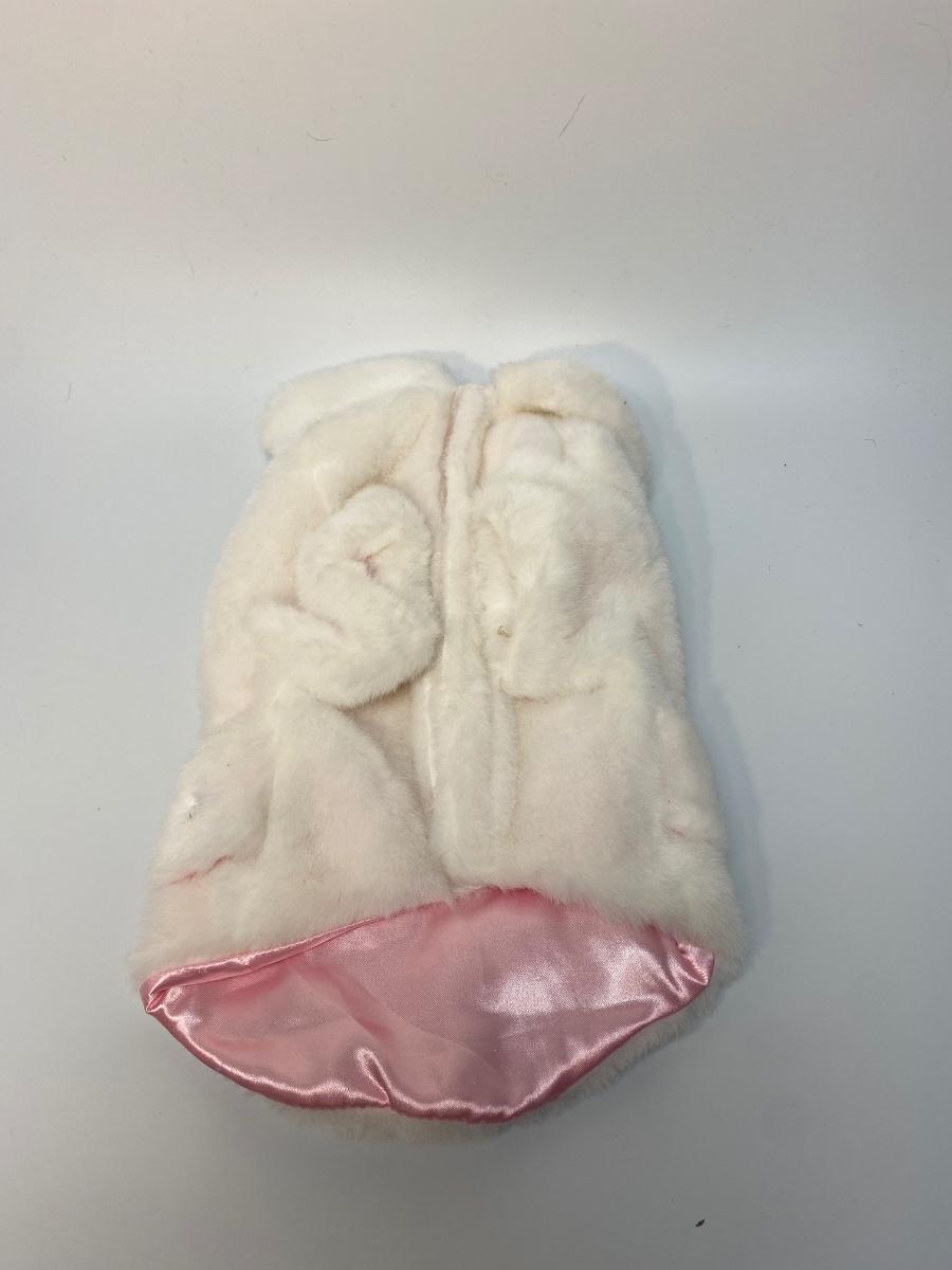 New with tags. Set of 3 small dog clothing items. Fancy dress, a raincoat, and a faux fur coat. The raincoat does not have hang tags attached but looks unused.