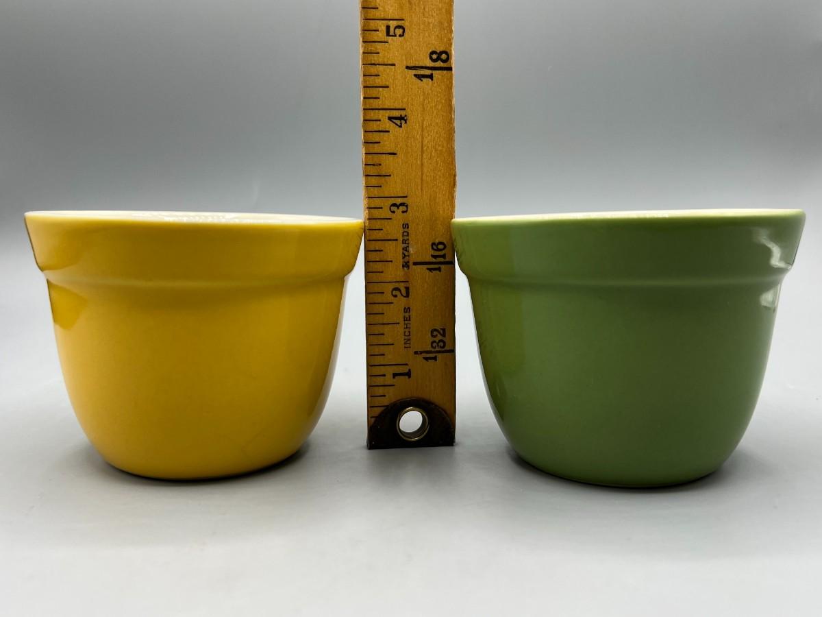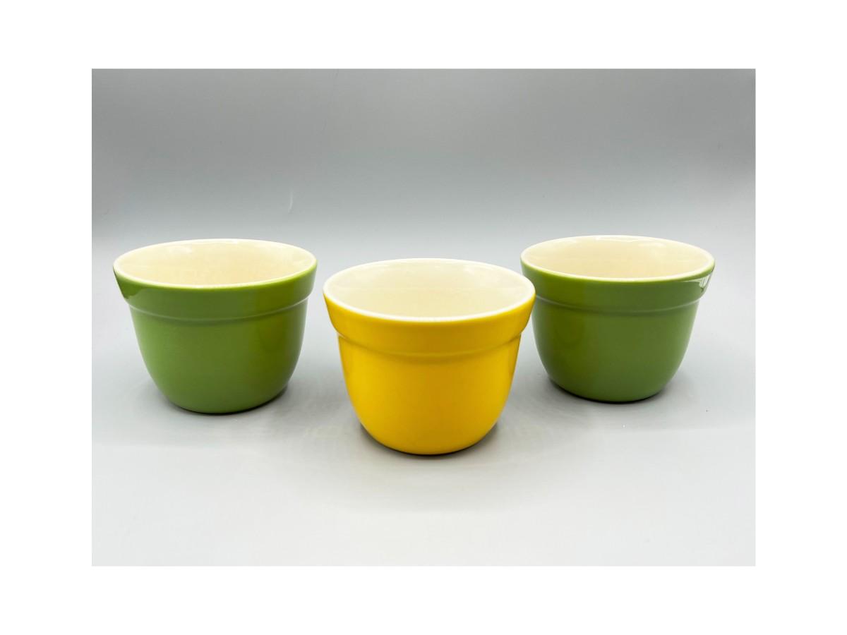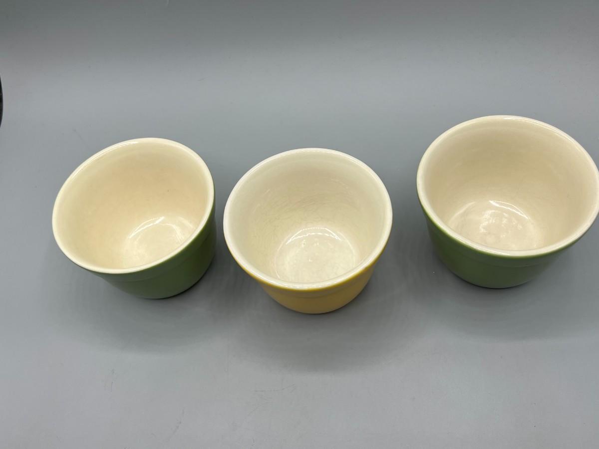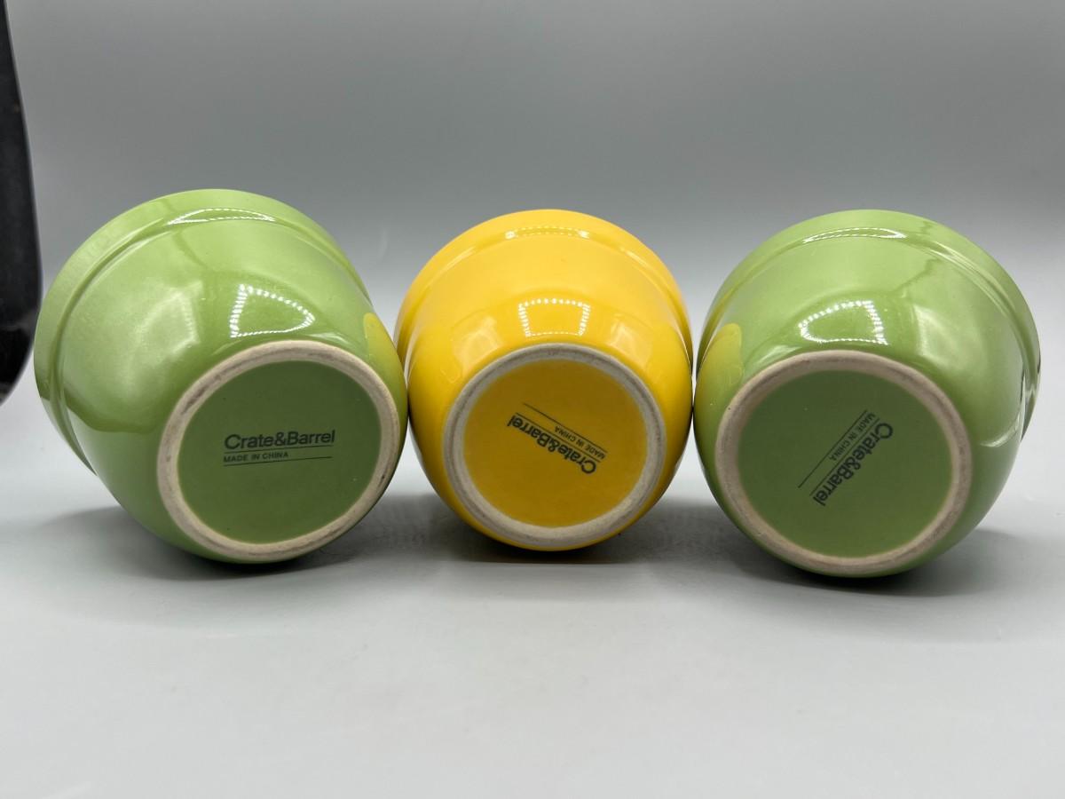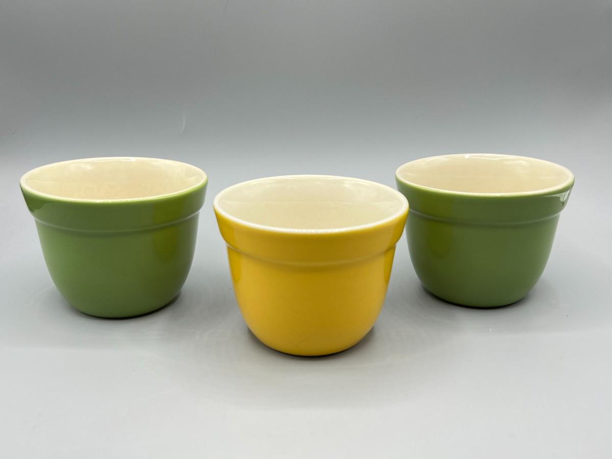 Set of 3 small pottery ramakin style bowls from Crate & Barrel. Two green and one yellow. Good condition, about 3".