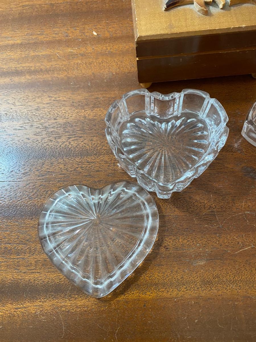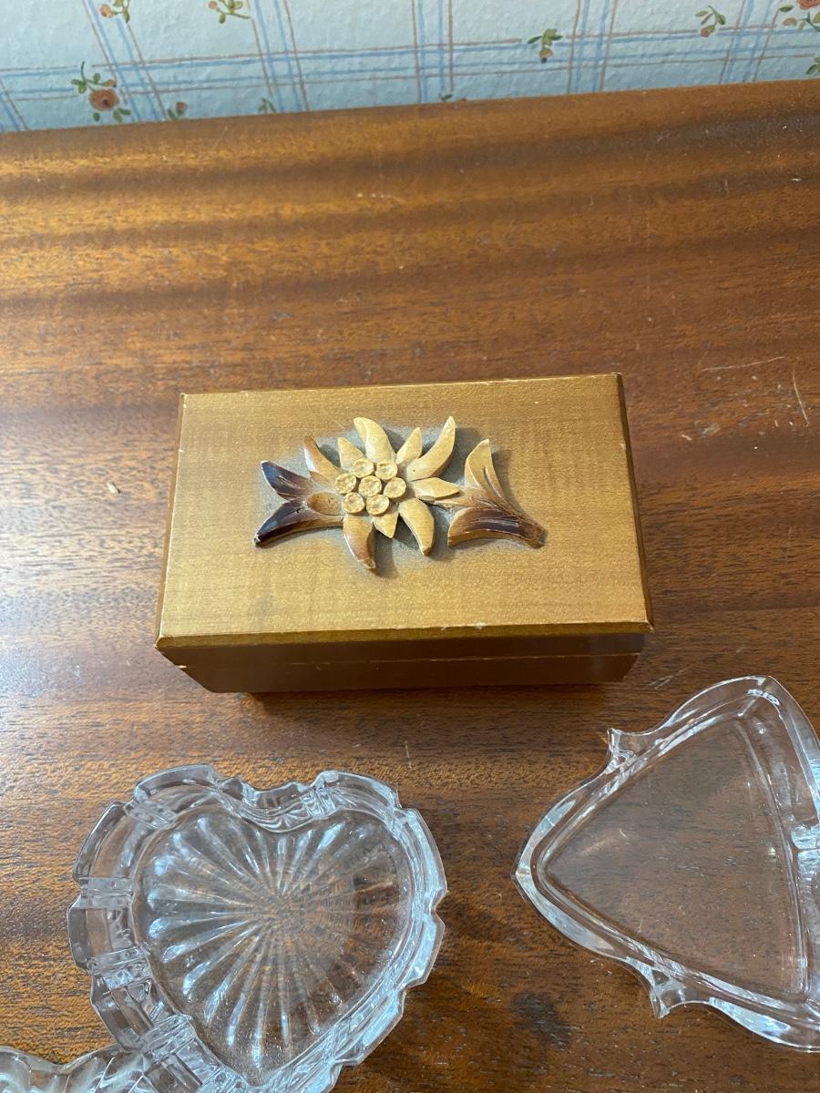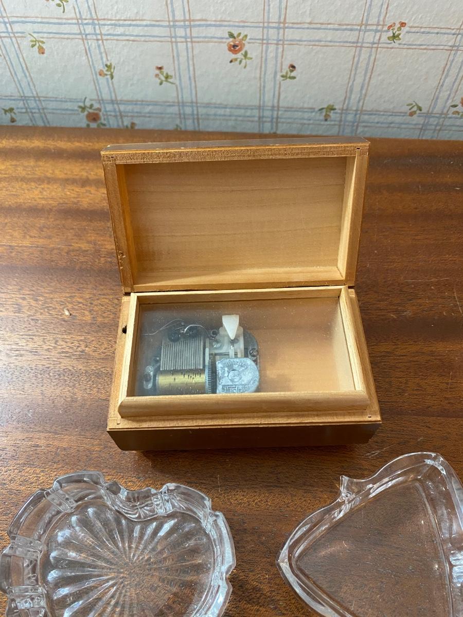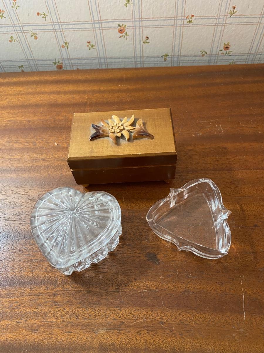 Set of 3 Small Trinket Boxes Dish - Wood Music Box, Glass Dishes. All in good vintage condition. Music box works.