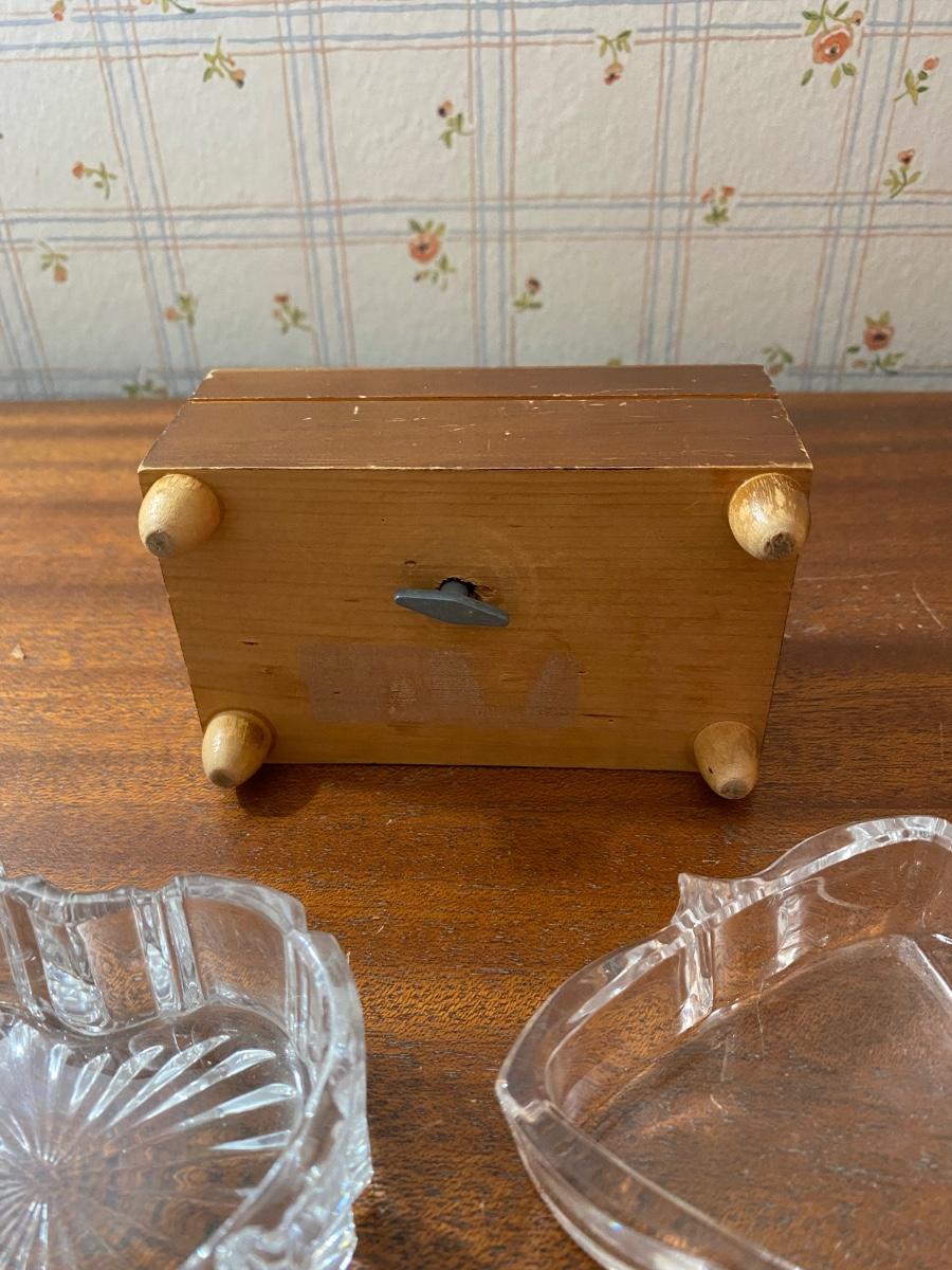 Set of 3 Small Trinket Boxes Dish - Wood Music Box, Glass Dishes. All in good vintage condition. Music box works.