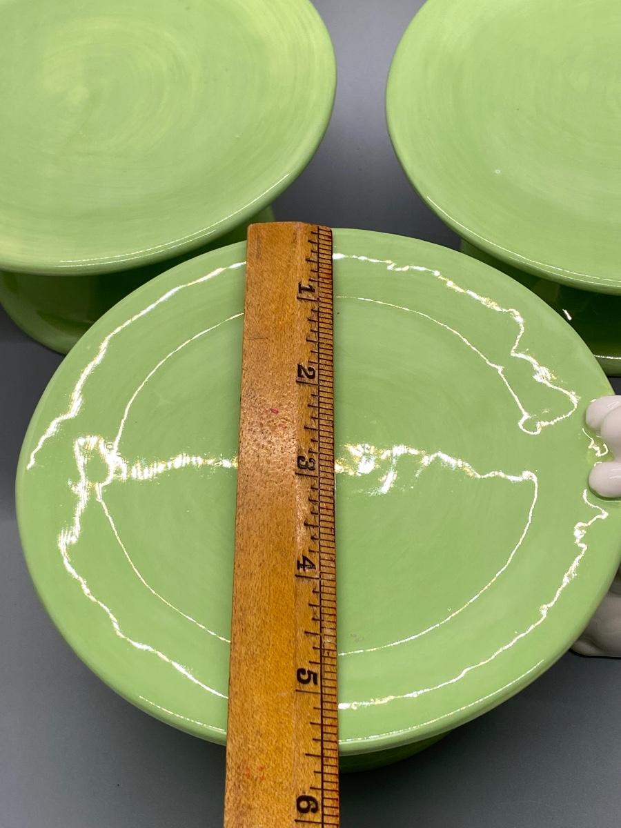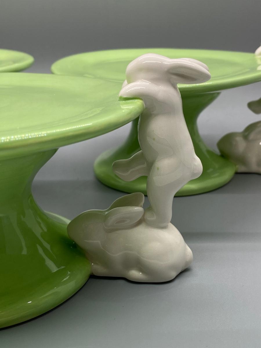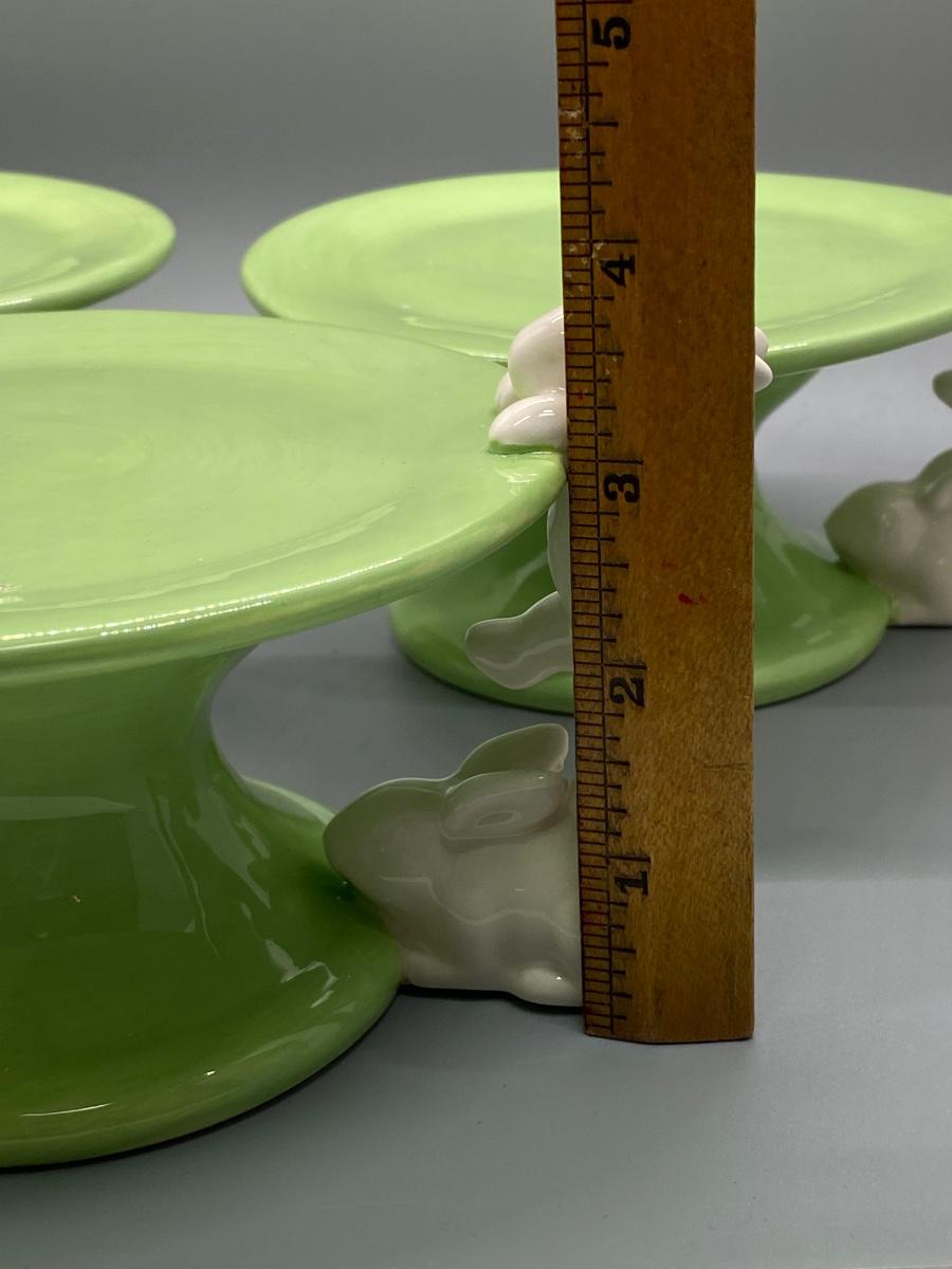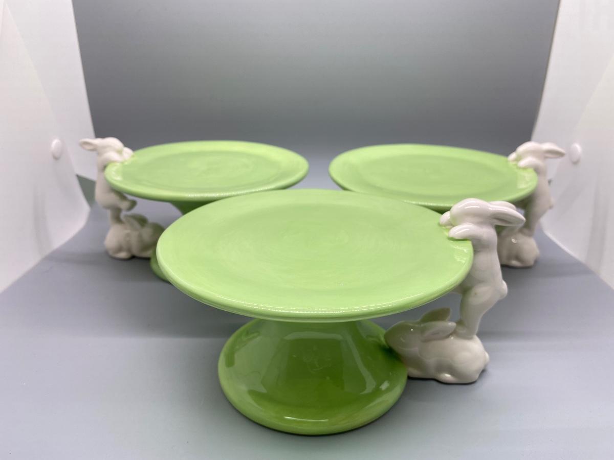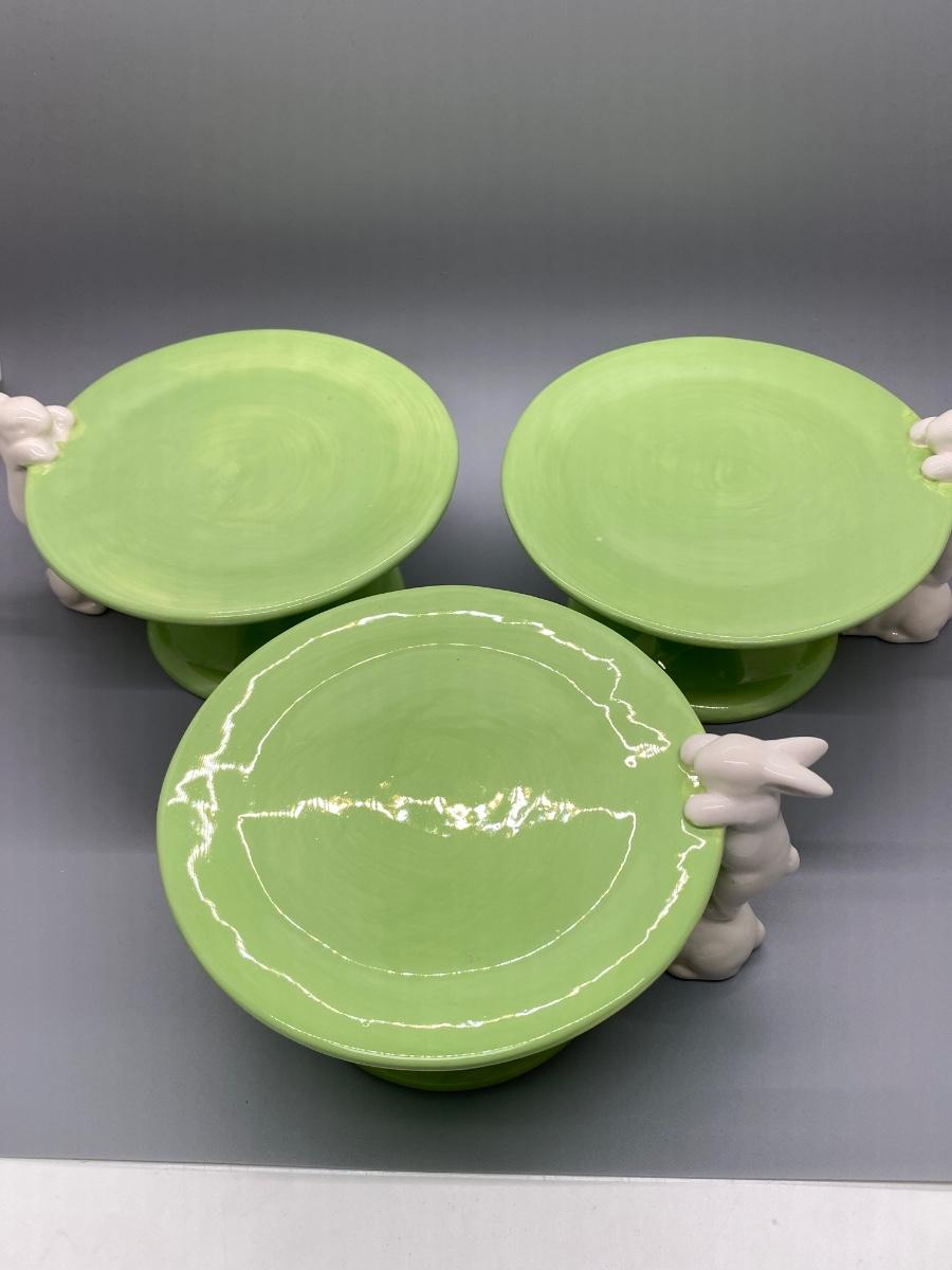 Set of 3 pastel green springtime Easter dessert pedestal plates. Little white bunnies adorn the side. About 3" tall and 6" wide. Good condition.
