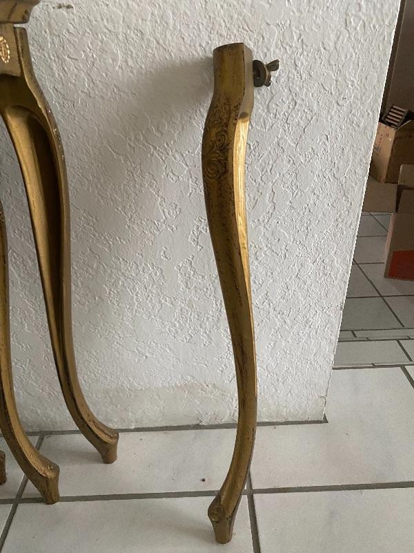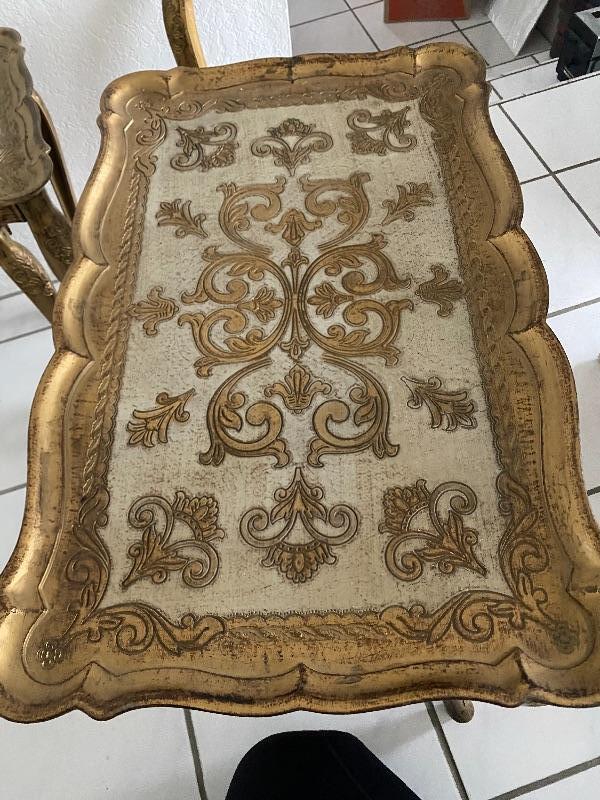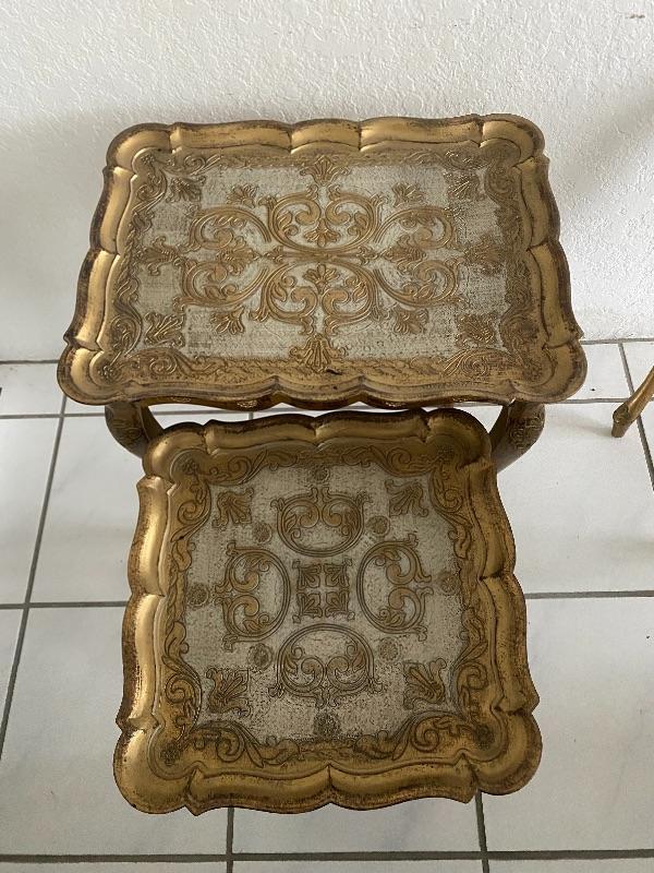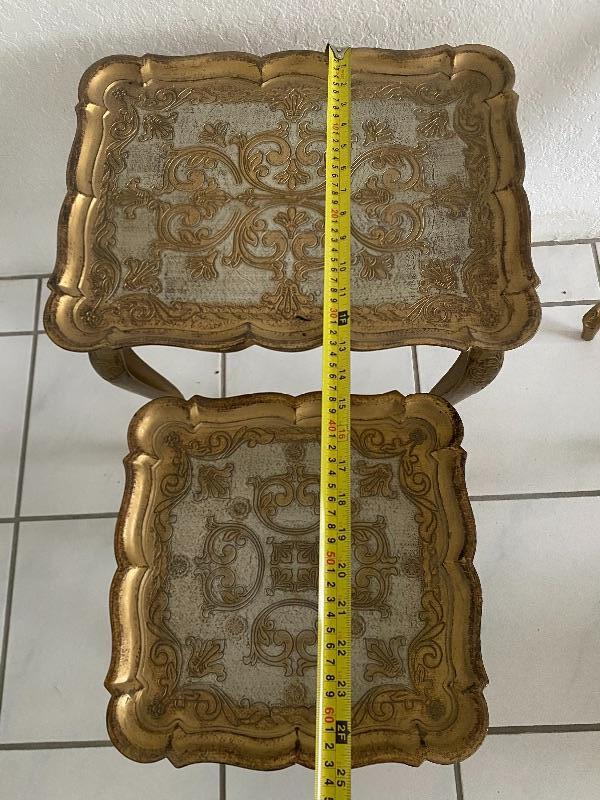 Set of 3 vintage plastic nesting tables. Gold and cream colored. The large table has a broken piece so the leg can bot be attached, would make a great tray with legs off. Other two tables are in good condition. Made in Italy.