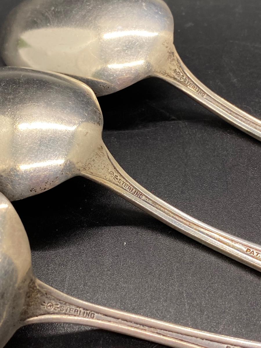 Set of 3 sterling silver serving spoons. Floral handle with a monogrammed W. Marked sterling on the back. About 8" size.