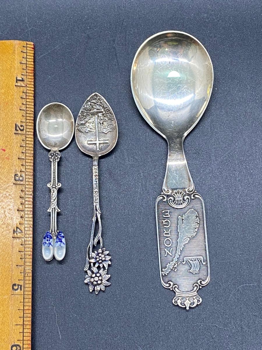 Set of 3 European vacation souvenir collector spoons. Sterling silver, marked on the back. Under 5" size.
