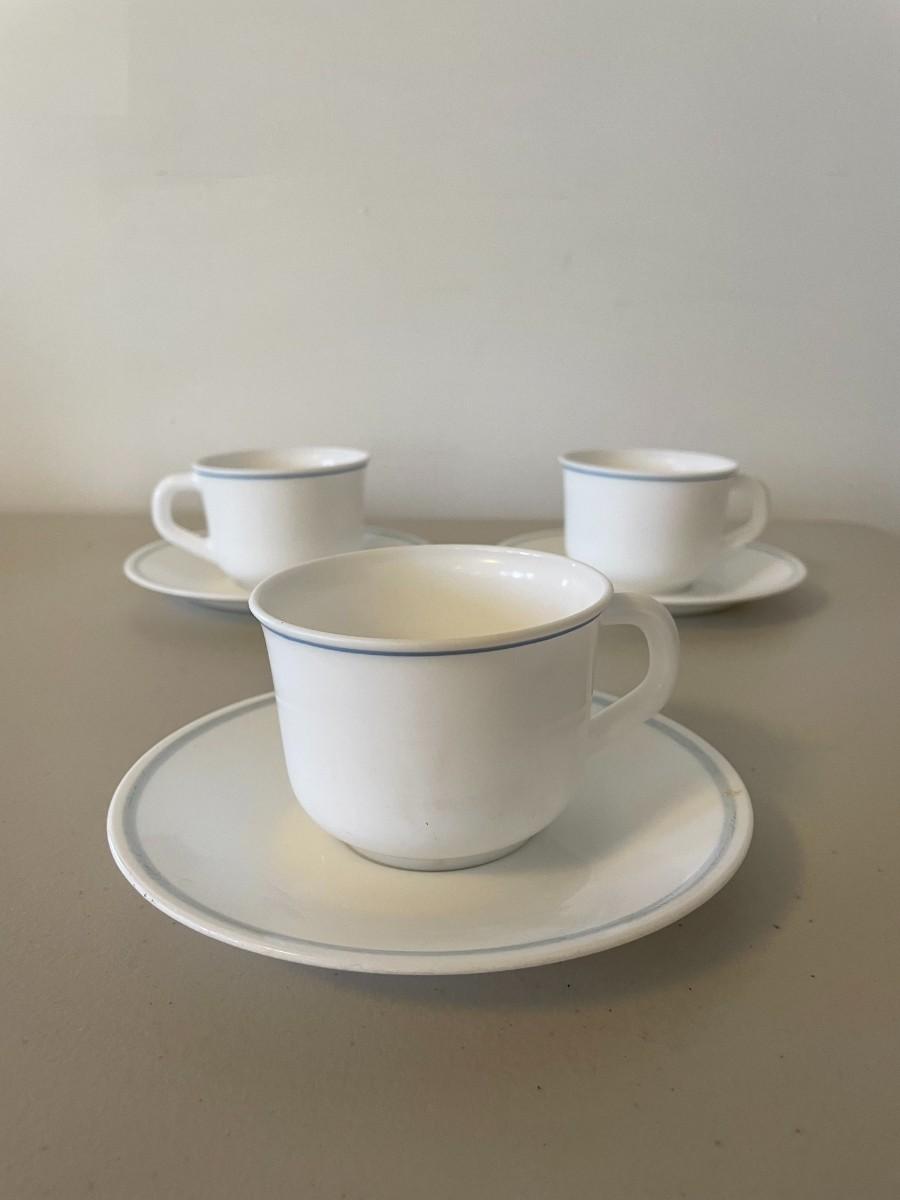 Cups have a blue stripe at the top and the saucers have a grey stripe.