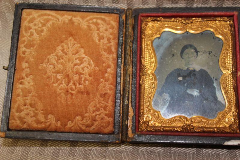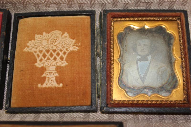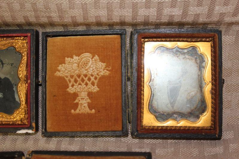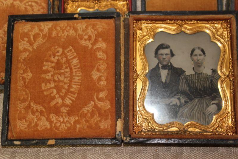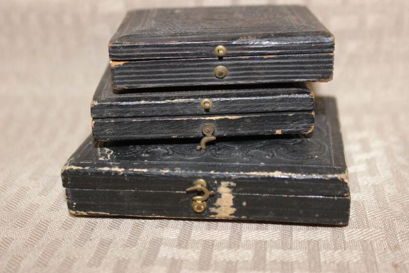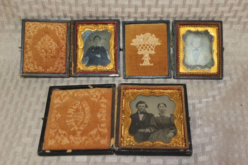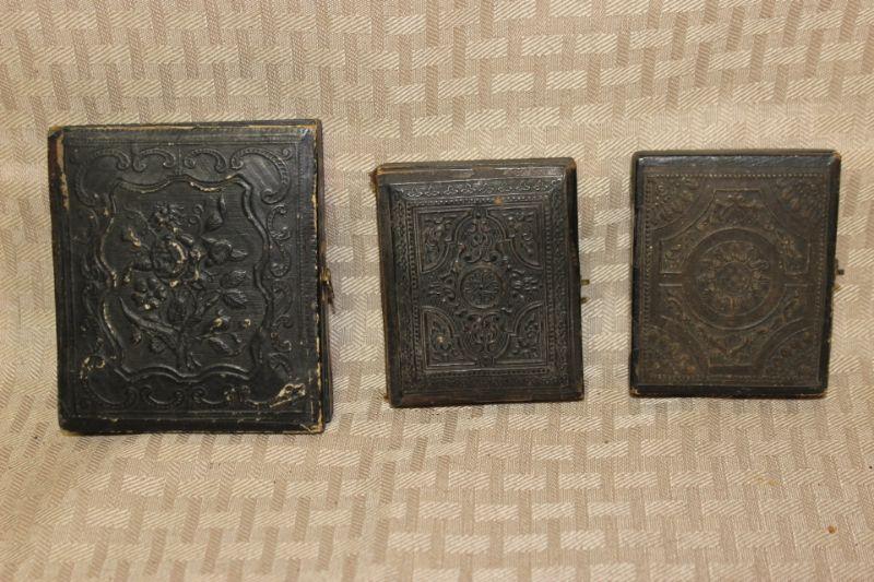 3 Tintype Photos in Cases. Antique leather cases, one with working latch. Looks like a married couple, 2 individual photos and one of them together. The individual one of the man has faded quite a bit. The one of the pair has some color added to the cheeks. Smaller tintypes are similar to wallet size photos.