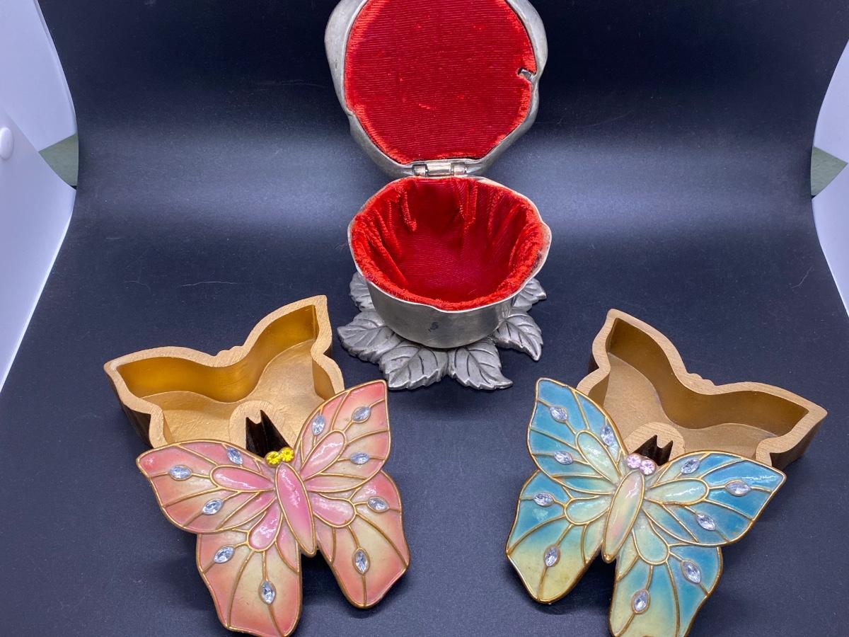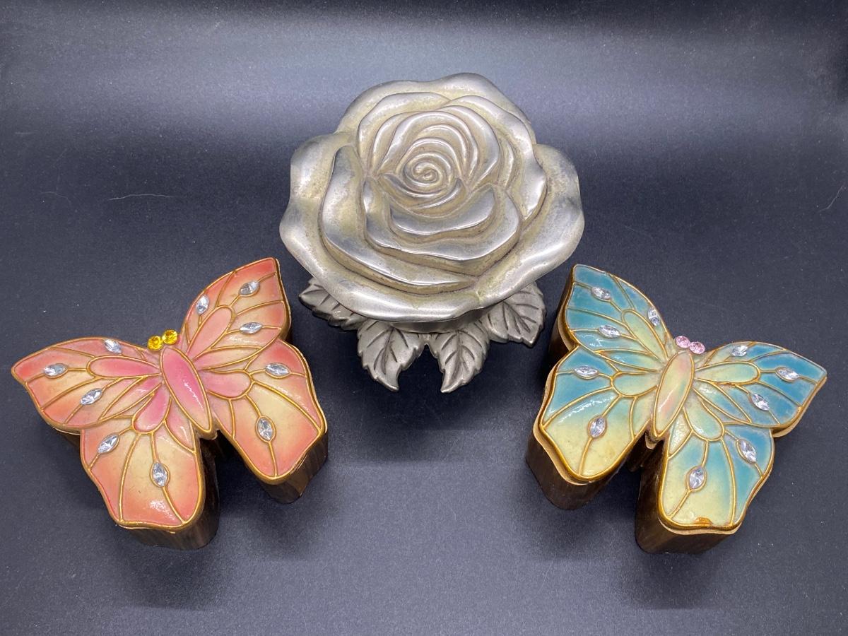 Set of three small jewelry trinket boxes. Hinged lid rose with red lining and two butterfly boxes. Good, displayed condition,