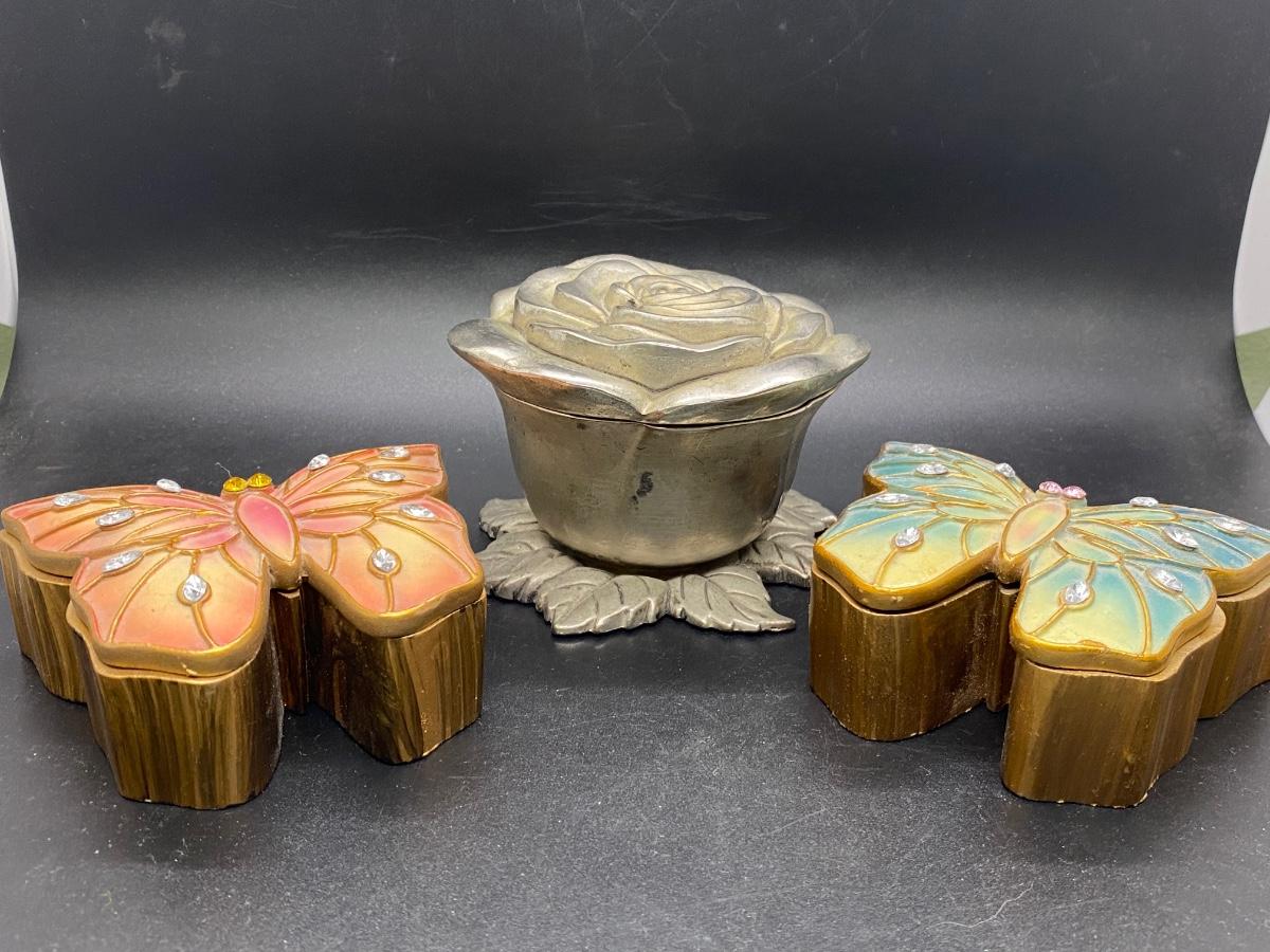 Set of 3 Trinket Jewelry Boxes Rose and Butterflies