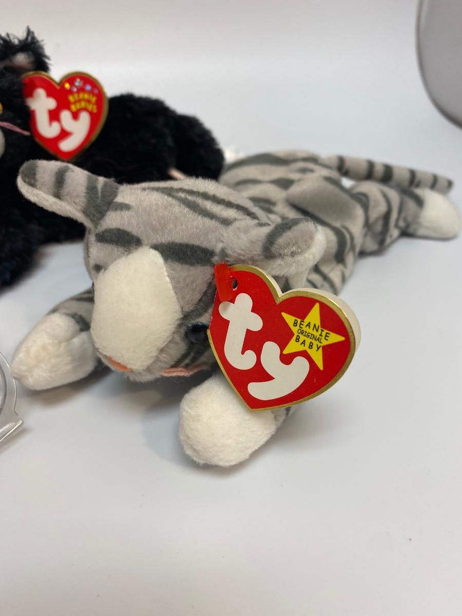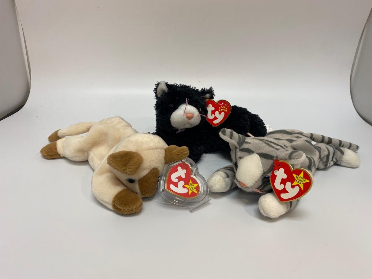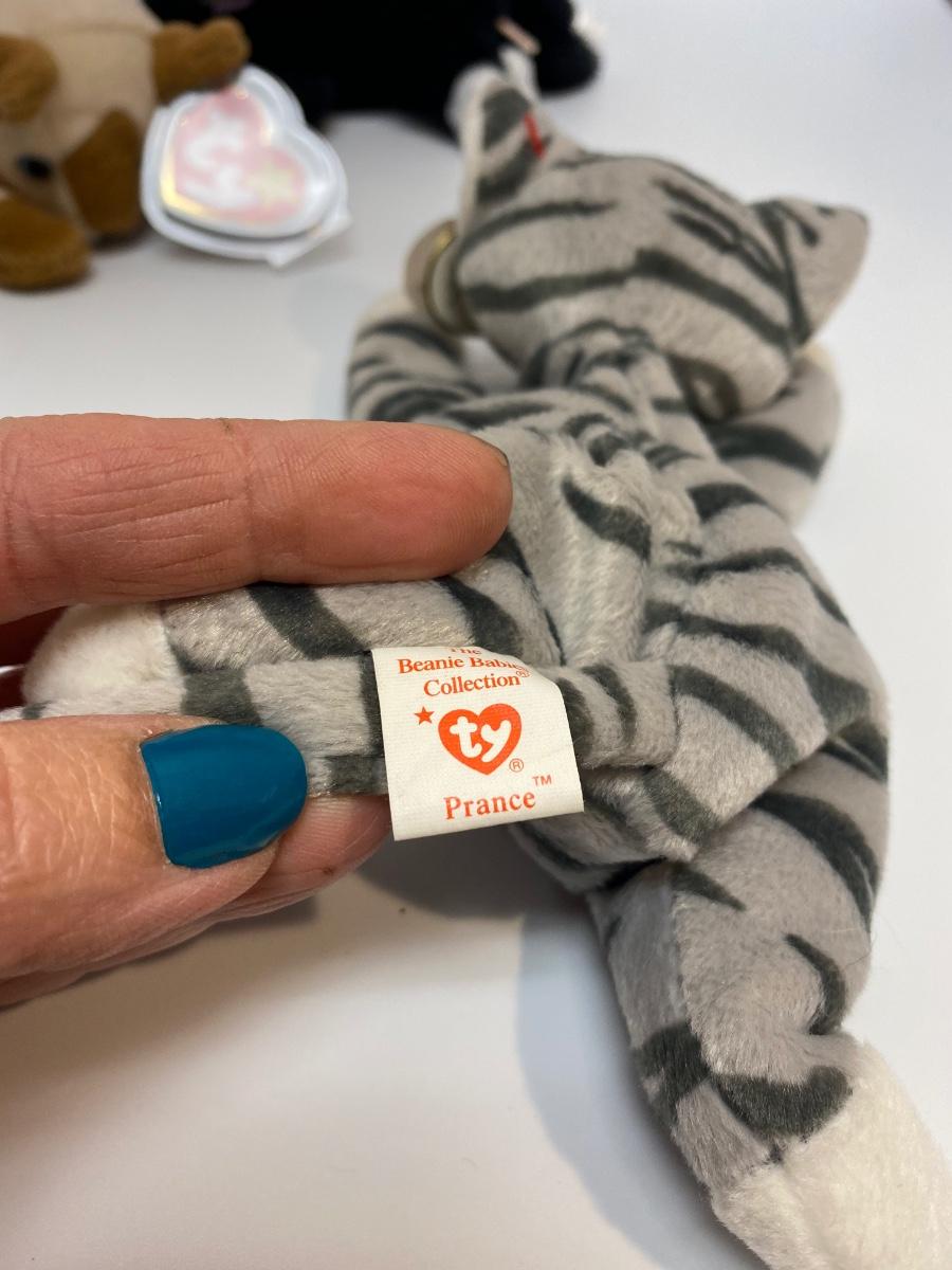 Set of 3 TY beanie baby plush cats. All have hang tags attached. Includes black & white cat "Booties", grey striped cat "Prance", and siamese cat "Snip". All in good condition. Snip has a hang tag protector on it.