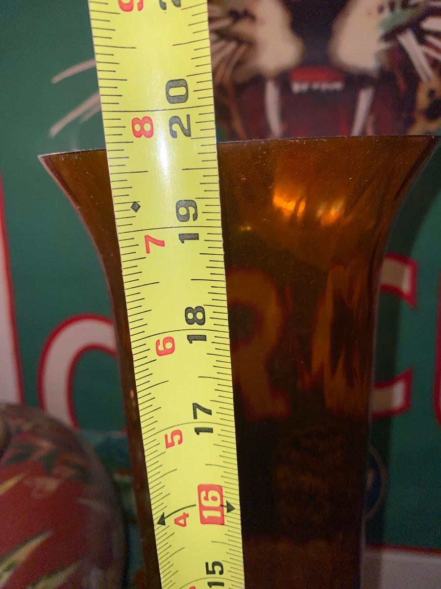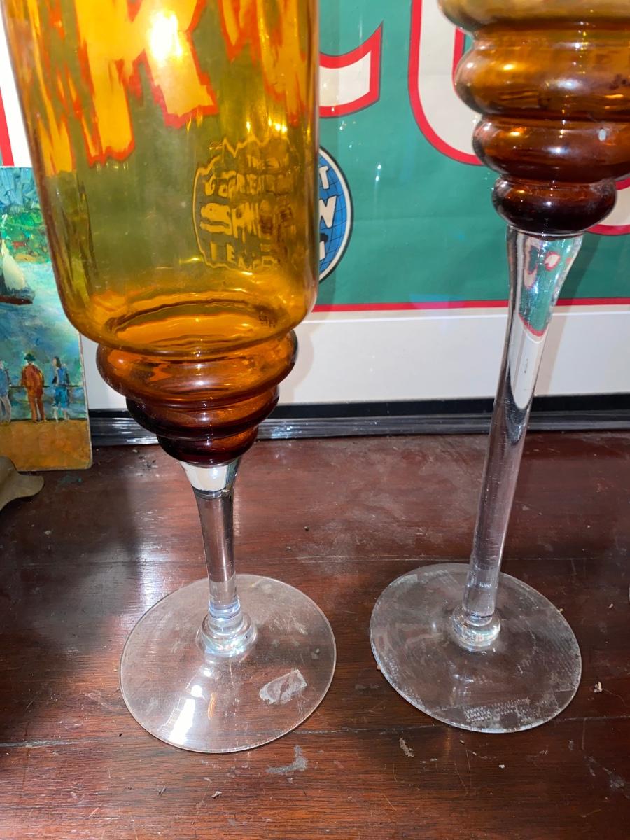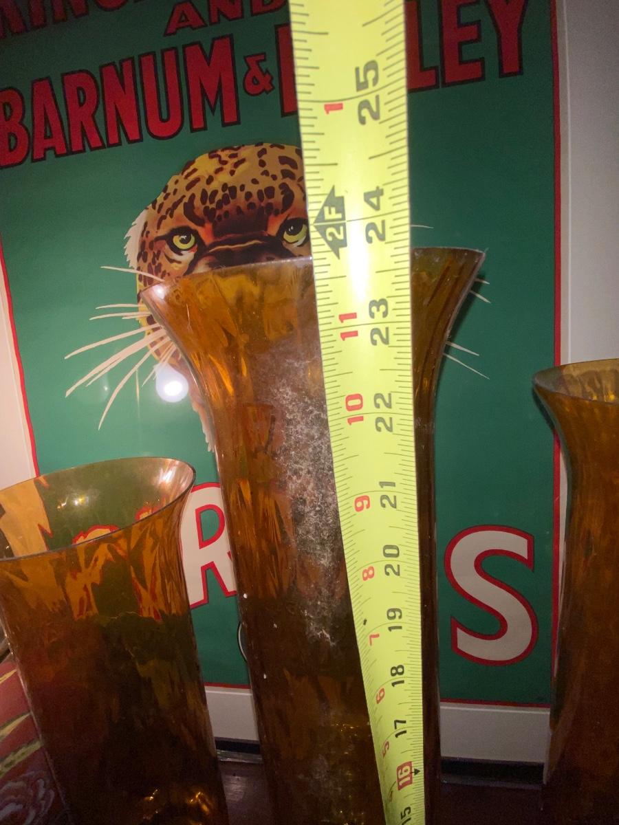 Set of 3 amber glasses, stemmed art glasses approx heights 20", 22" and 24". Would look beautiful in front of a large window or on a mantle.