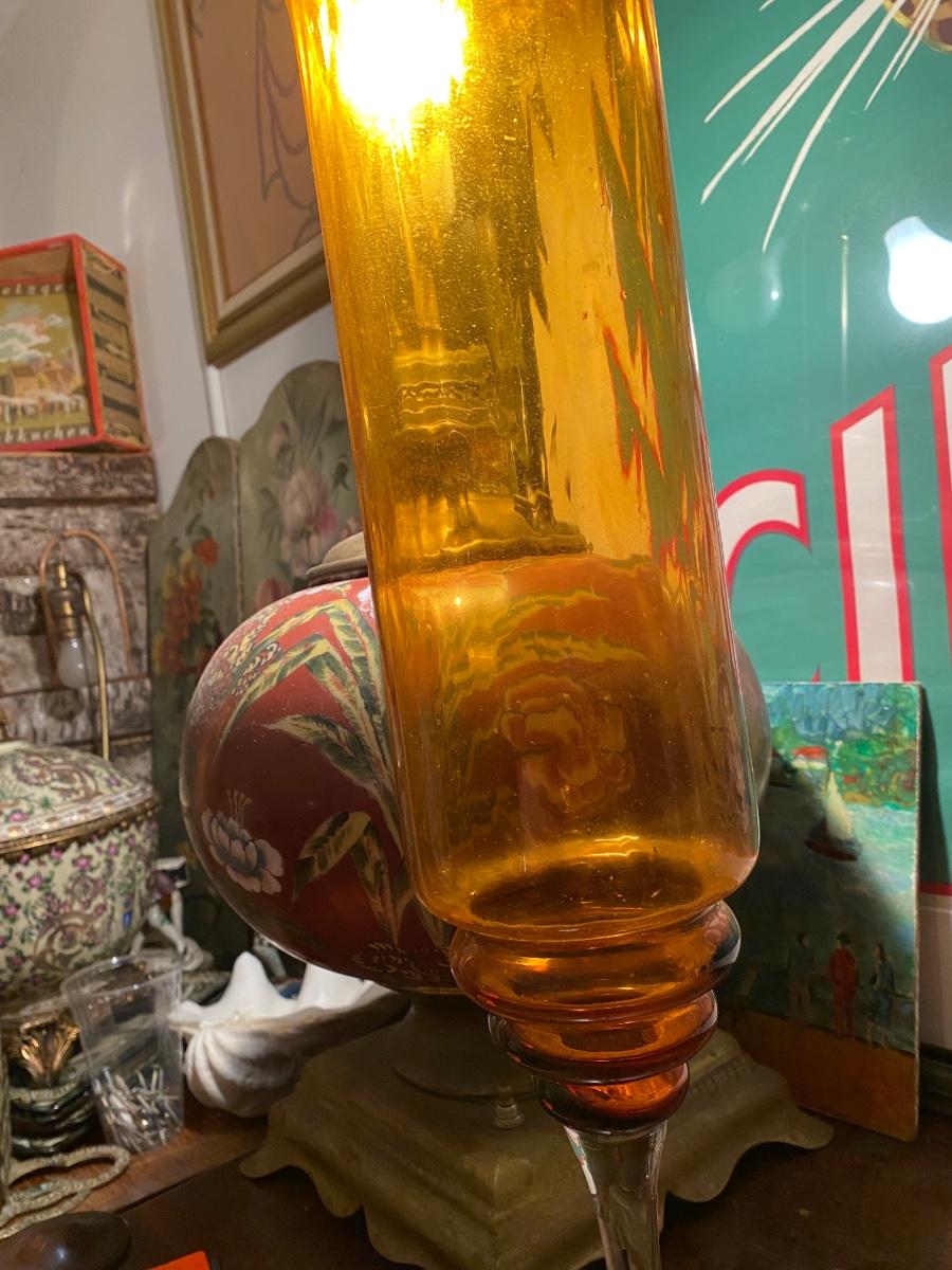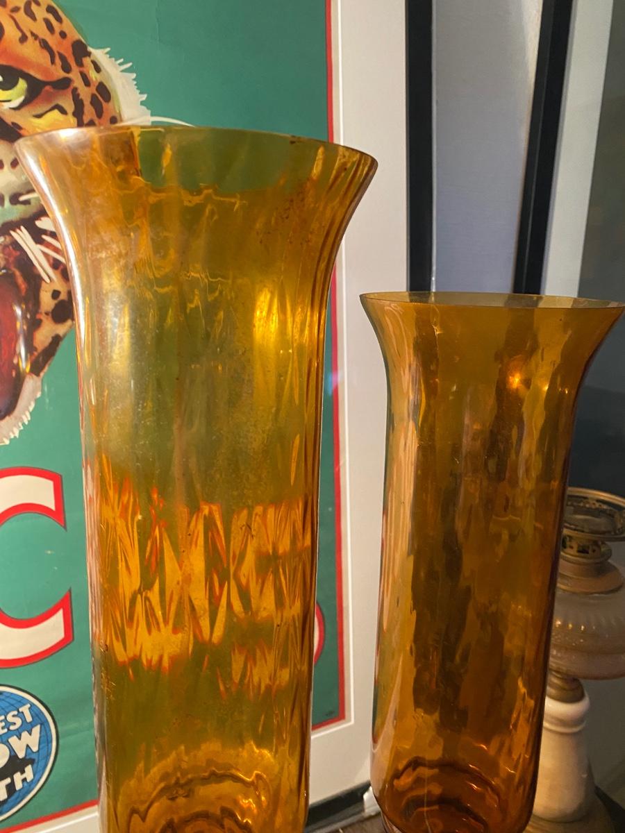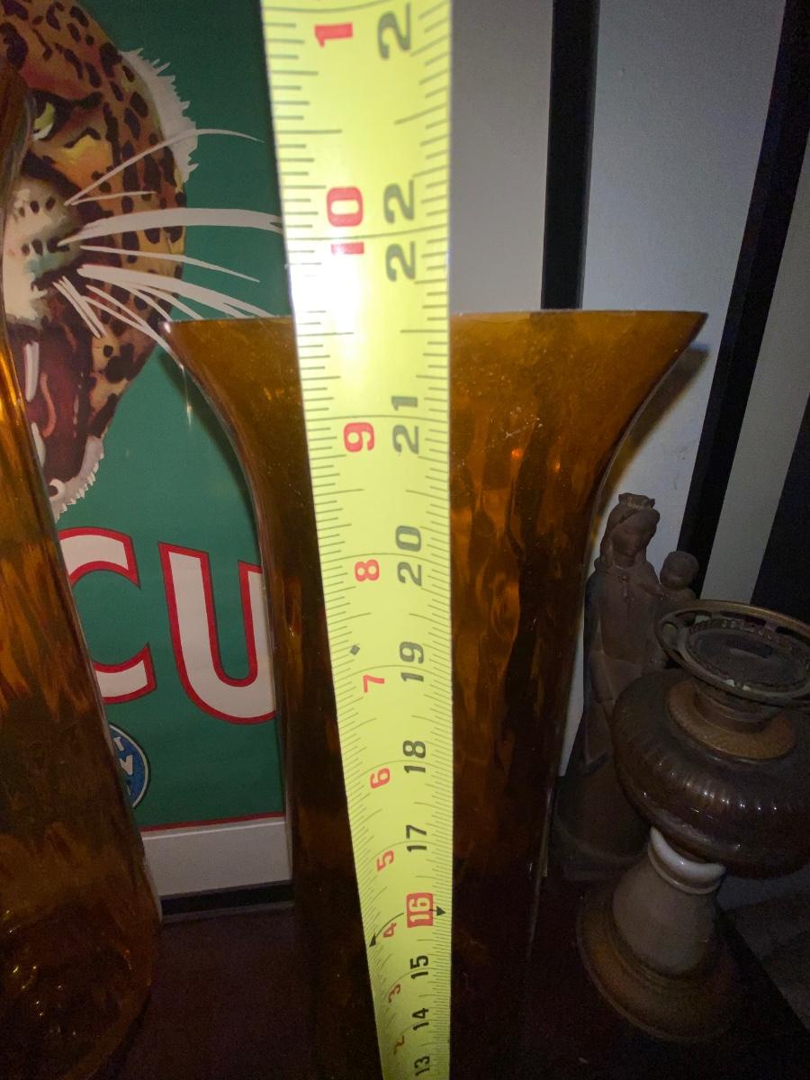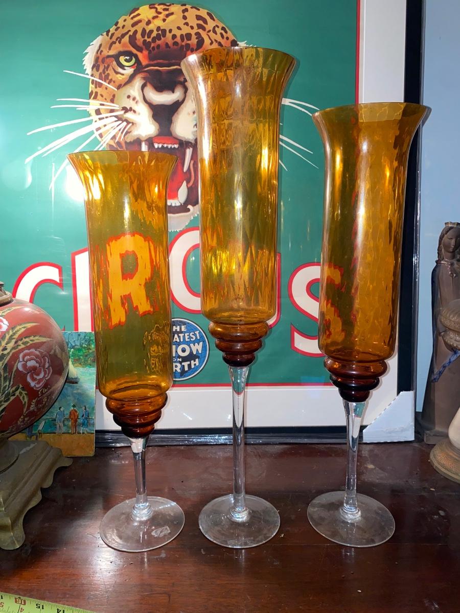 Set of 3 amber glasses, stemmed art glasses approx heights 20", 22" and 24". Would look beautiful in front of a large window or on a mantle.