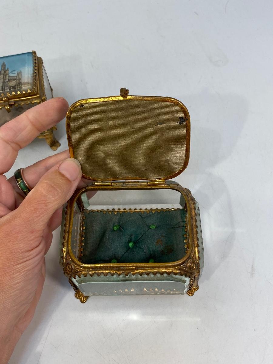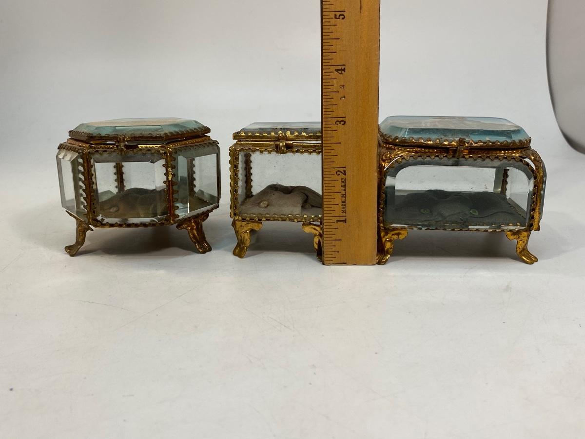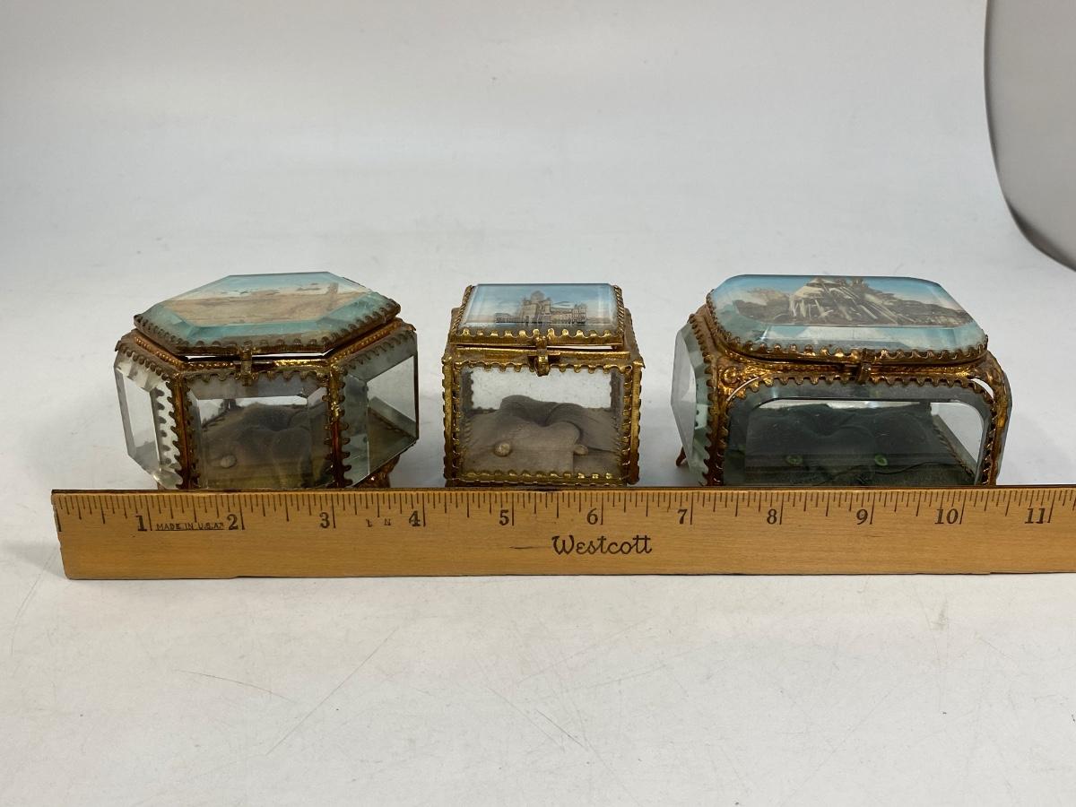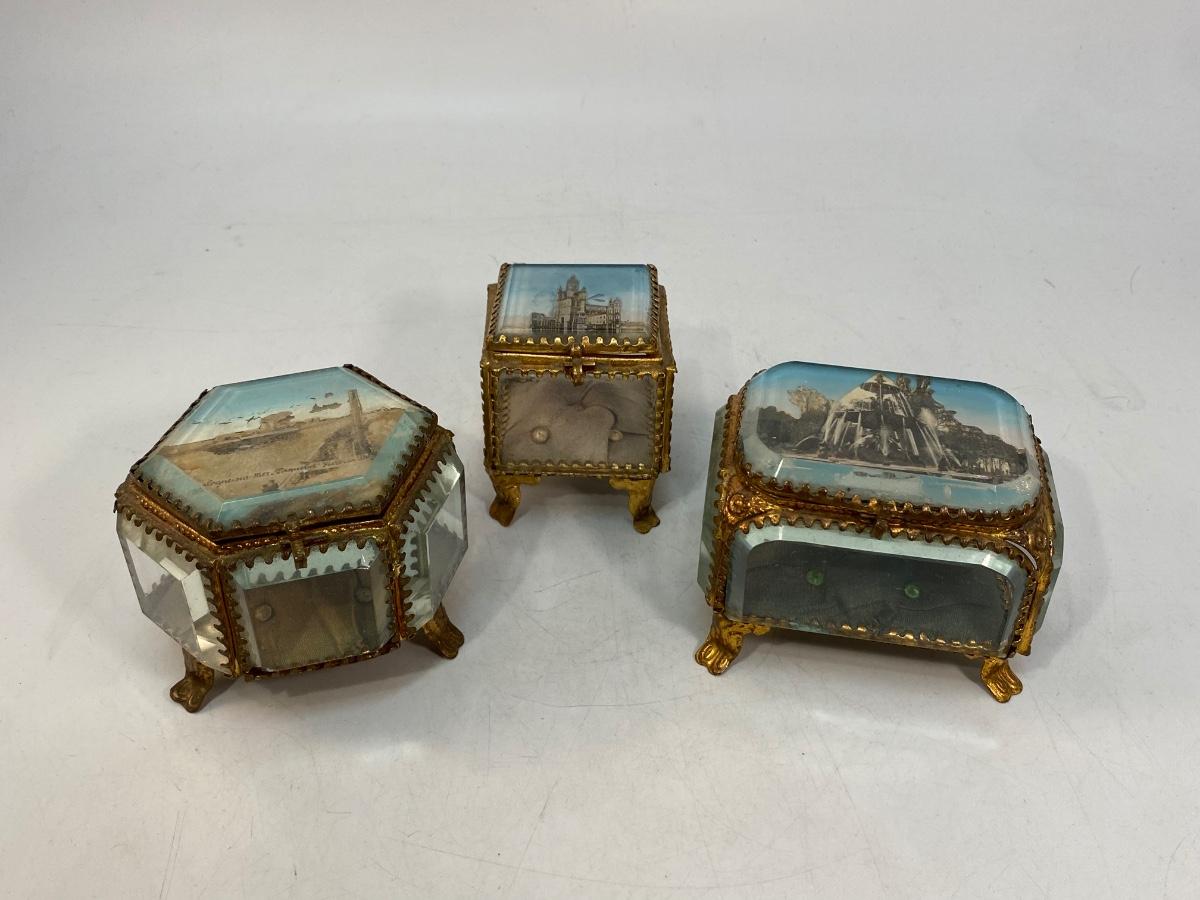 Set of 3 Vintage Antique Glass Side Jewelry Casket Trinket Boxes