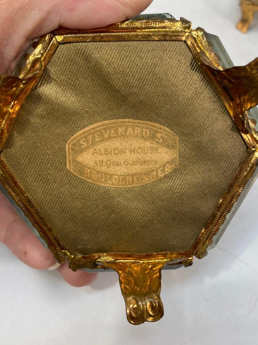 Set of 3 Vintage Antique Glass Side Jewelry Casket Trinket Boxes. Good vintage condition, some signs of age. Small bits of inlay abalone in the tops. One has a maker stamp label on the bottom. Under 4" size.