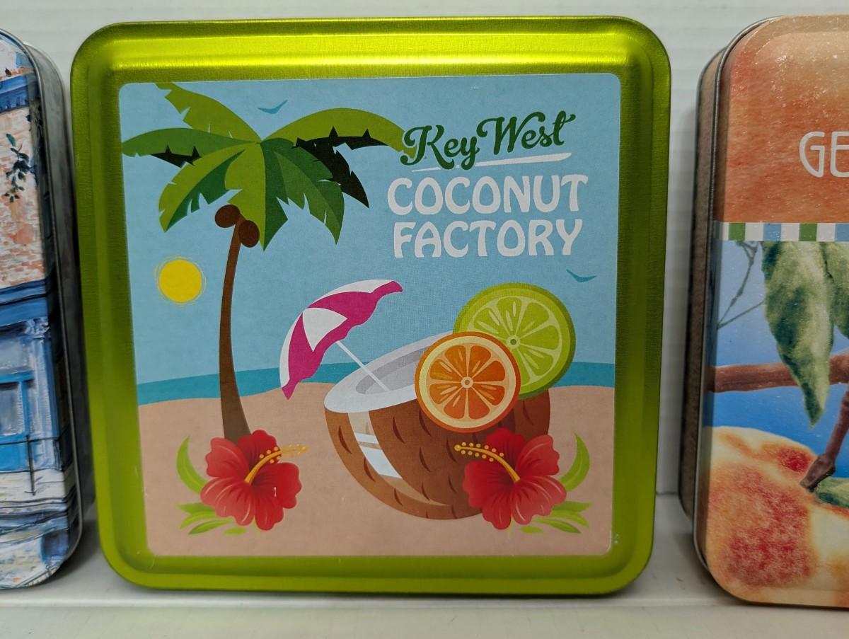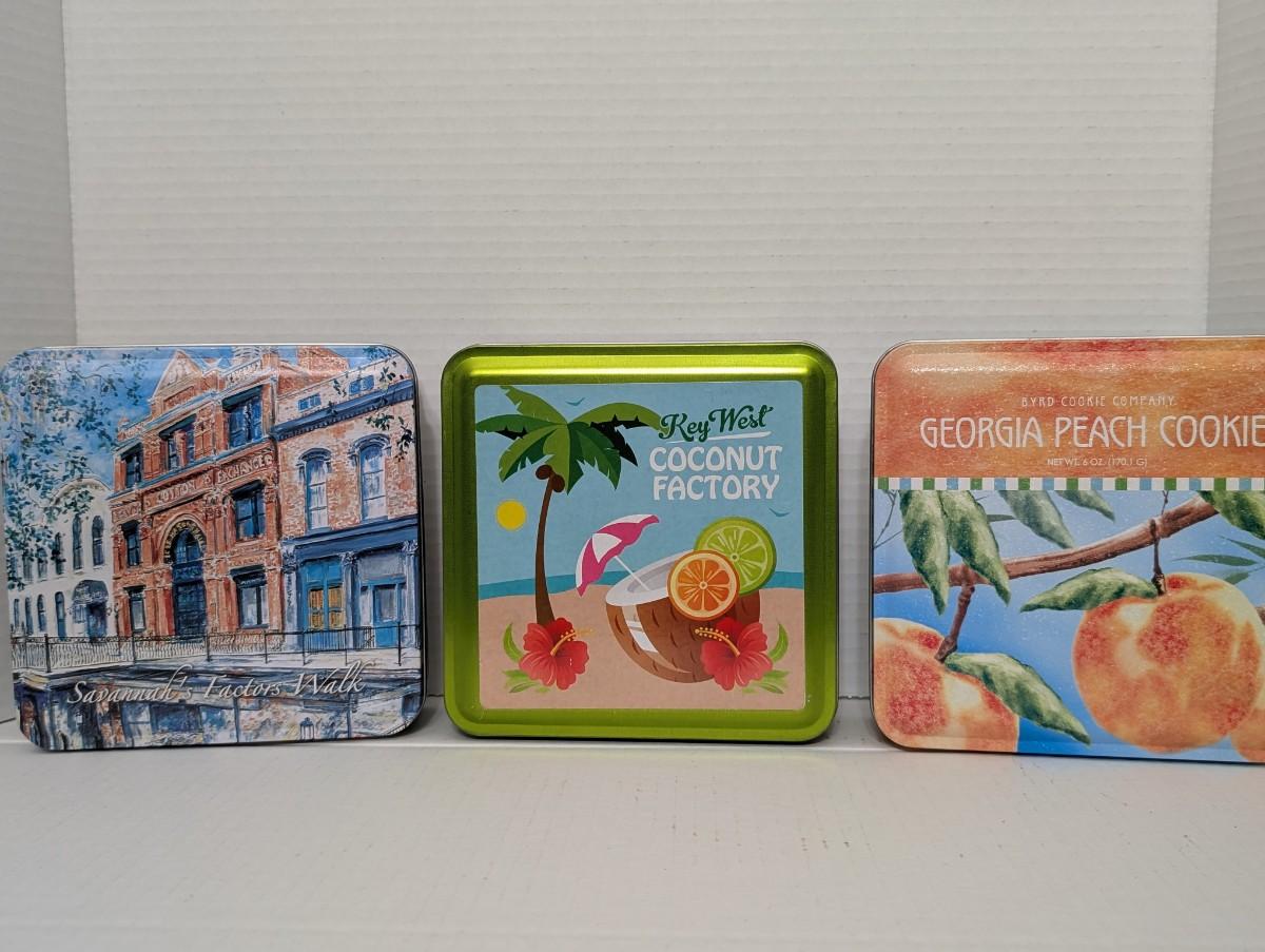 vintage cookie tins, Savannah Factors Walk tin, Key West Coconut Factory, Georgia Peach Cookie tin, Byrd Cookie Company collectible, Southern kitchen decor, retro storage tins, advertising cookie tins, vintage food containers, Florida Georgia collectibles