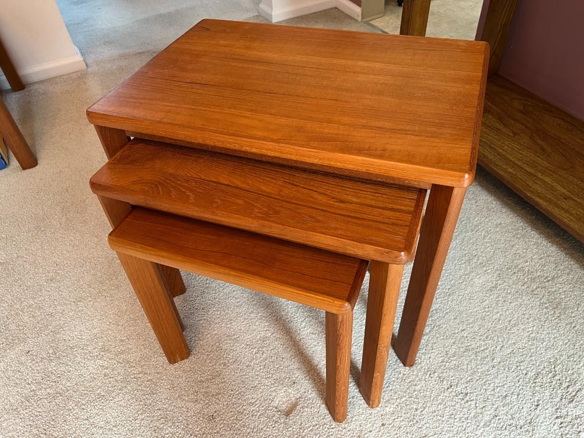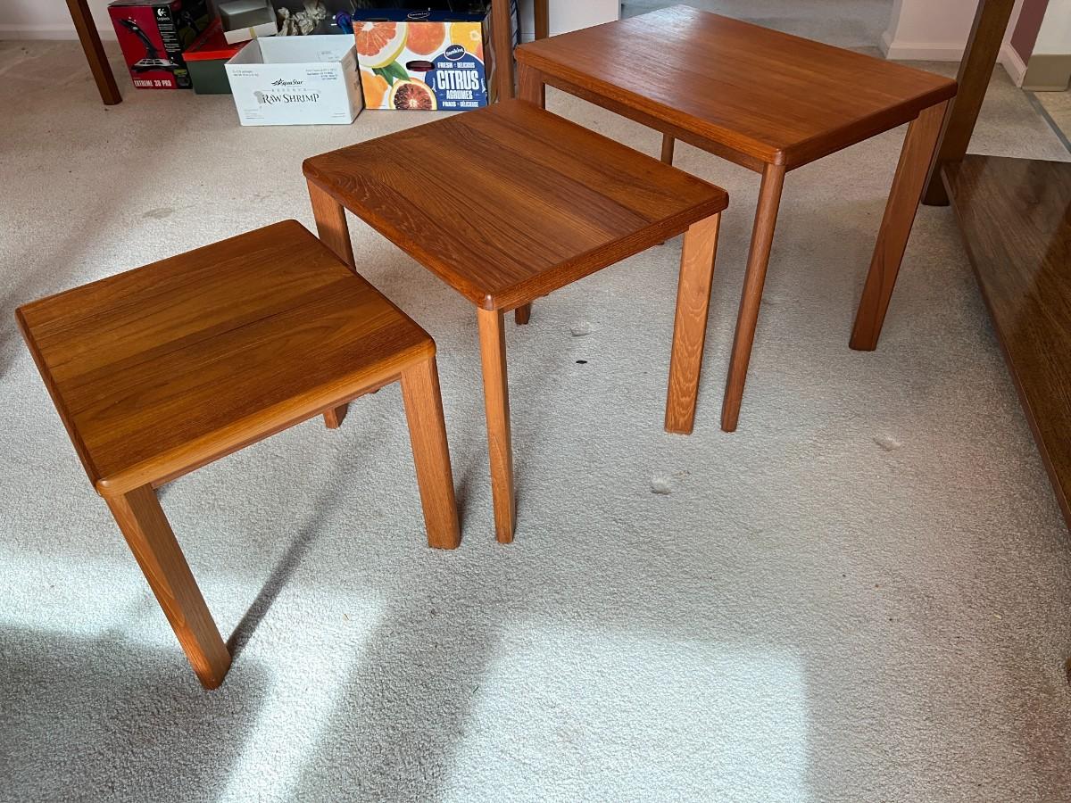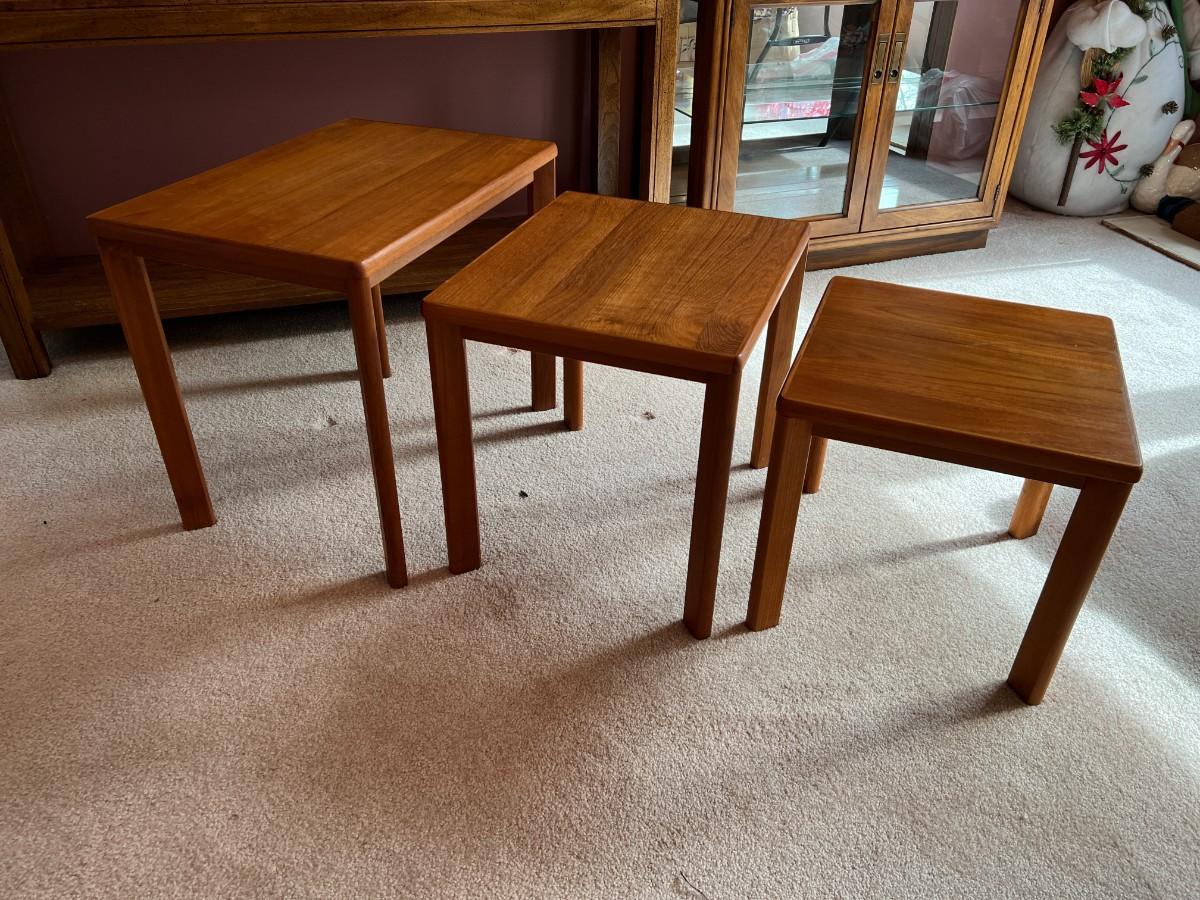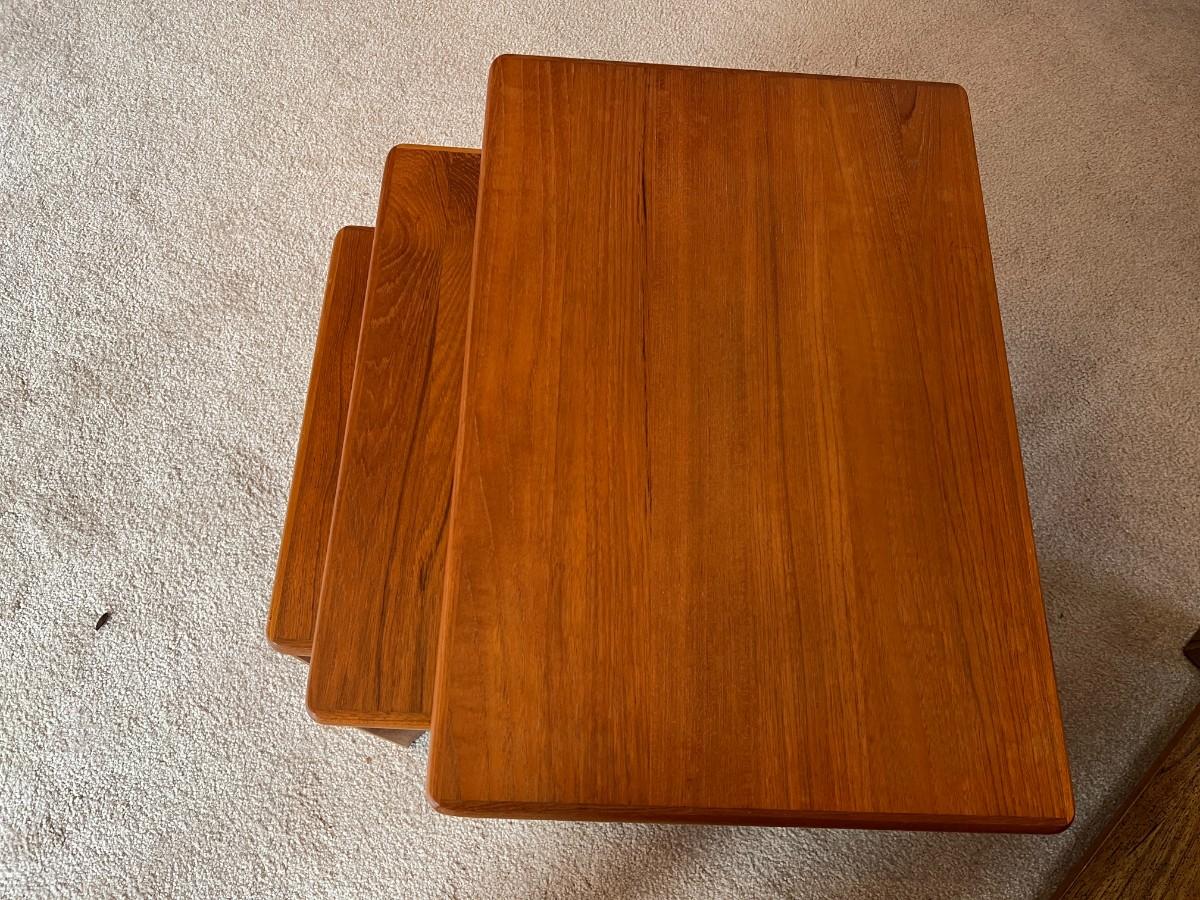 Gorgeous and rare set of wood nesting tables, Mid-Century Danish teak tables. Stamp on bottom of table says "Made in Denmark by Mobelfabrikken Toften". In good condition, as shown.