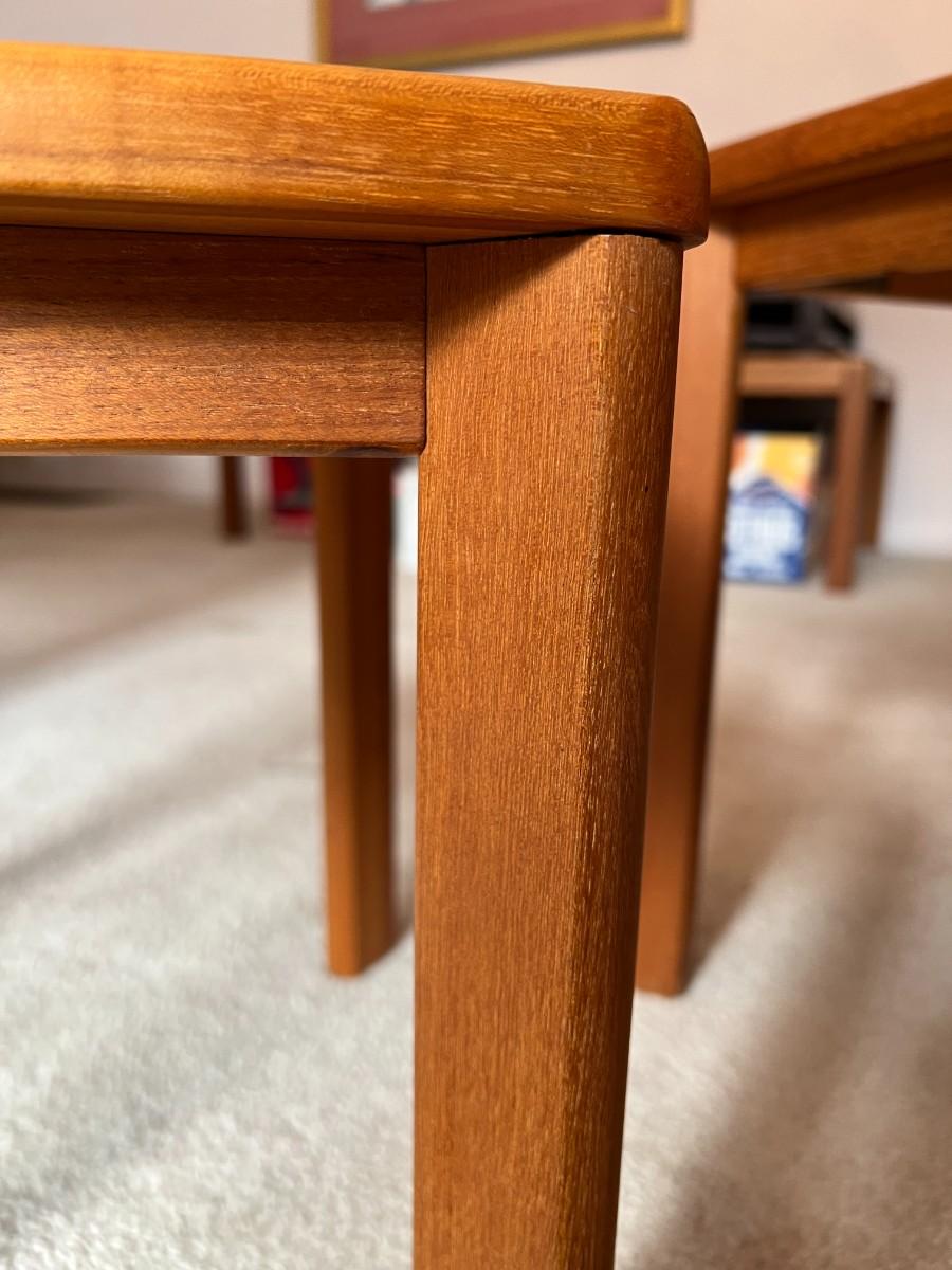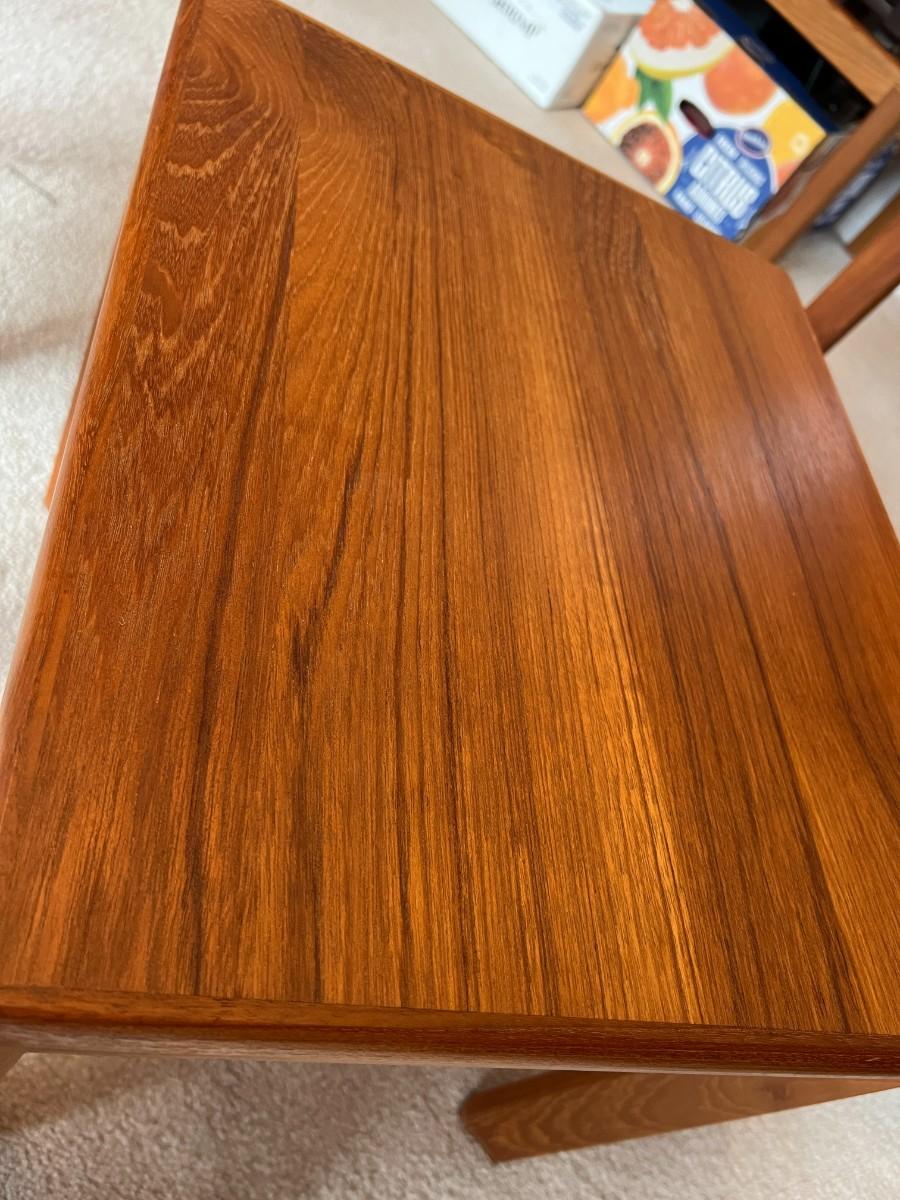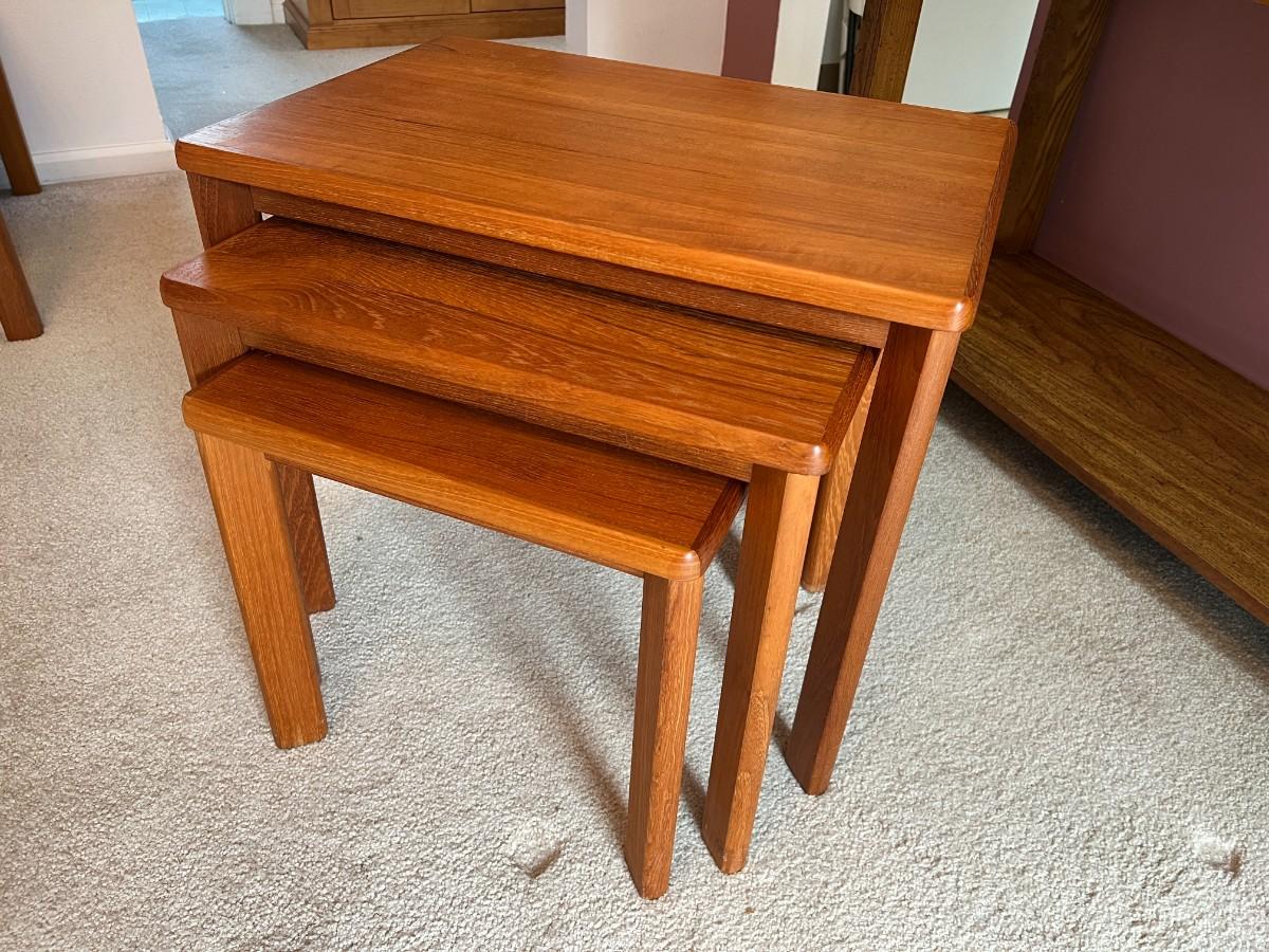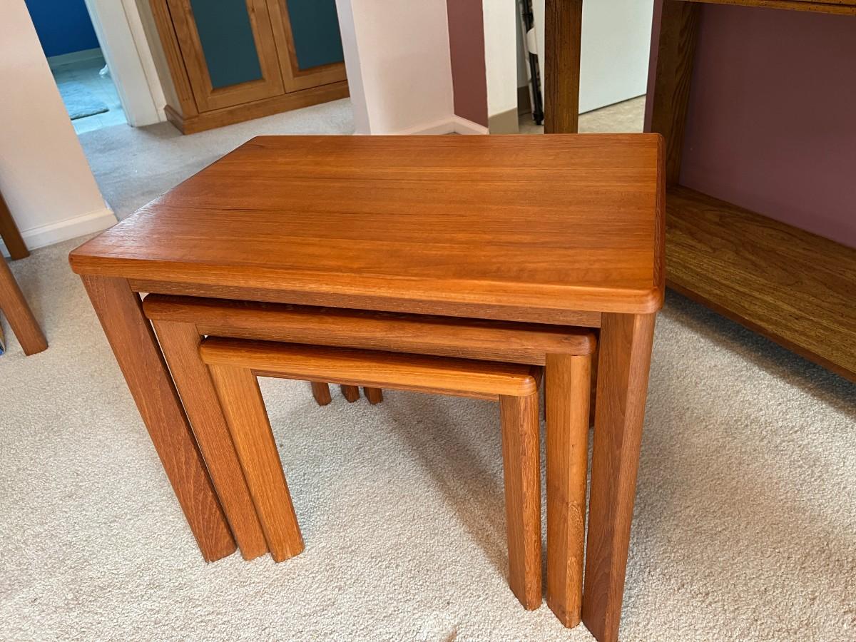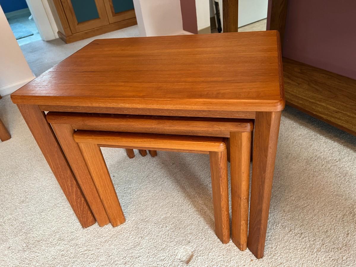 Gorgeous and rare set of wood nesting tables, Mid-Century Danish teak tables. Stamp on bottom of table says "Made in Denmark by Mobelfabrikken Toften". In good condition, as shown.