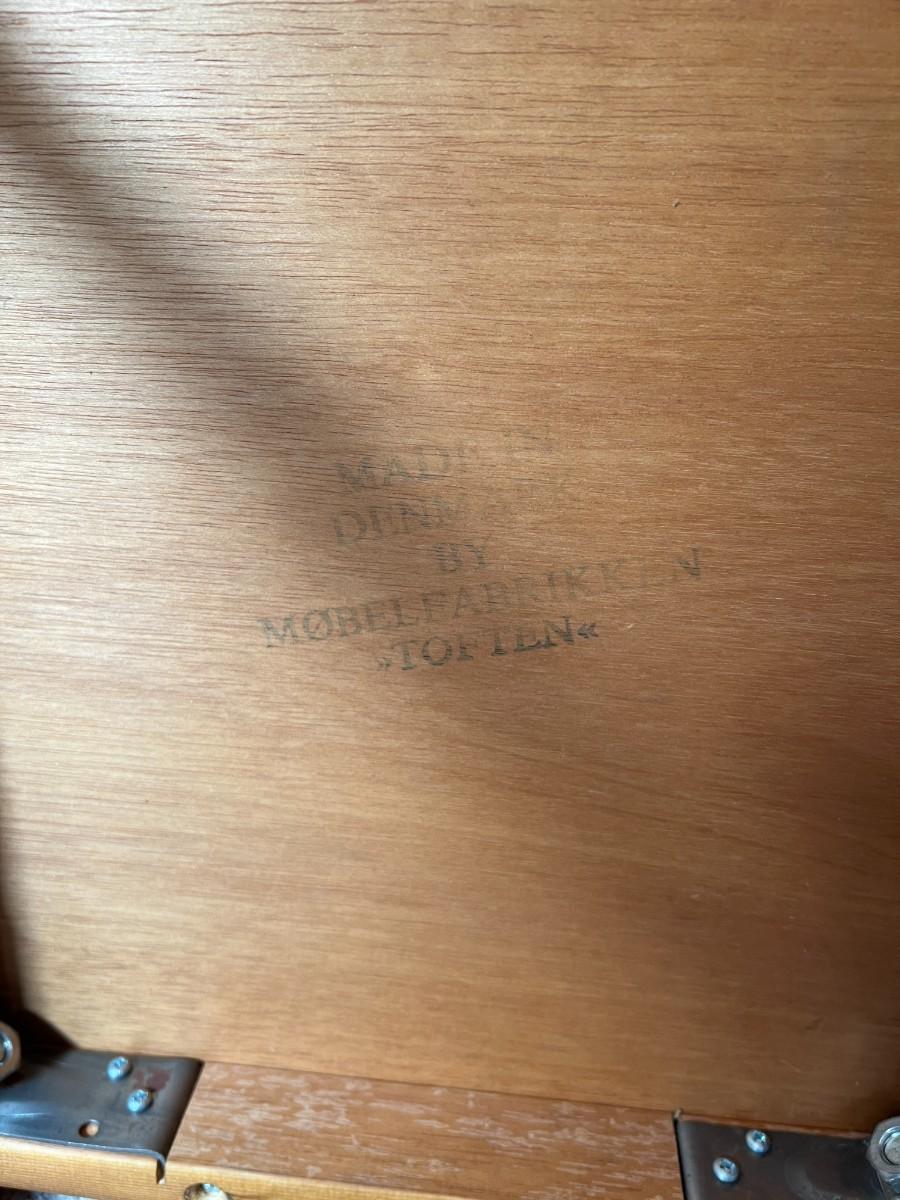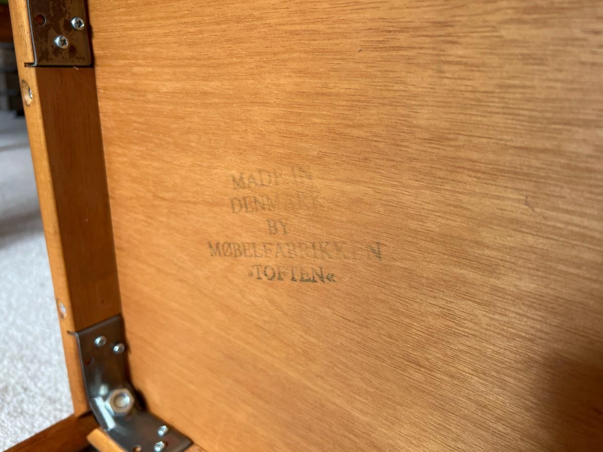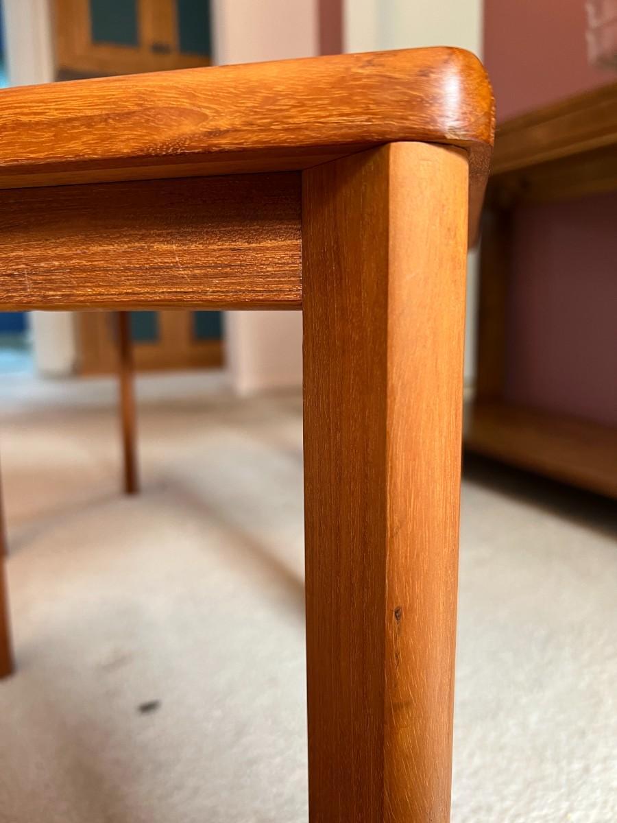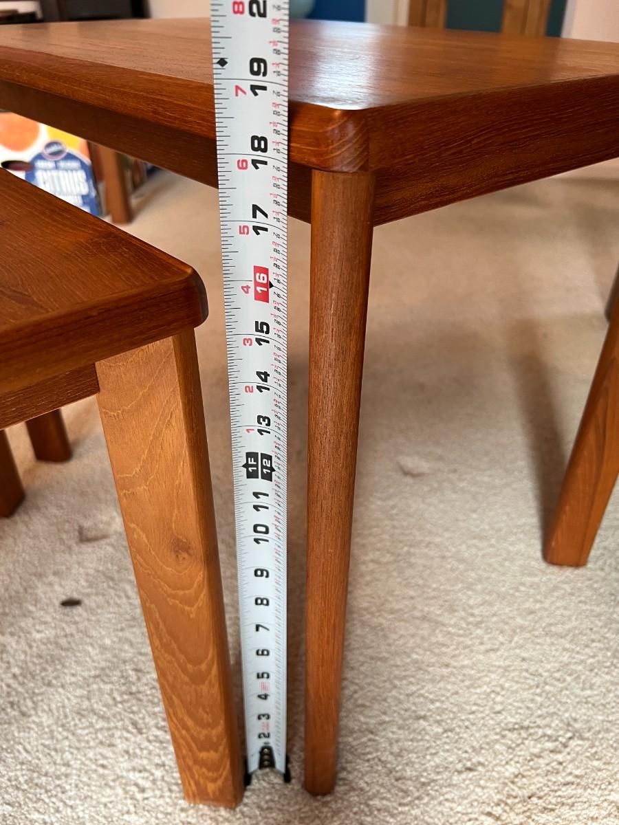 Gorgeous and rare set of wood nesting tables, Mid-Century Danish teak tables. Stamp on bottom of table says "Made in Denmark by Mobelfabrikken Toften". In good condition, as shown.