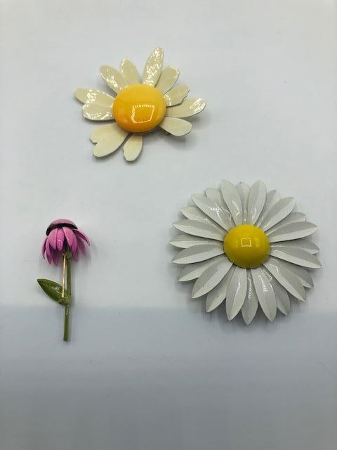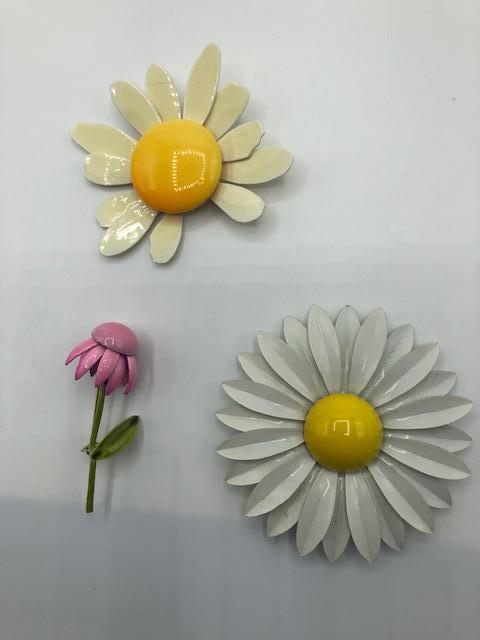 3 vintage enamel flower pins. The large daisy and purple one are enamels metal. The purple has a couple tiny chips along the edge from normal wear. The daisy is just over 3" and in very good condition. The top daisy flower is plastic. I believe the petal edges are suppose to look uneven, but there is two petals missing completely.