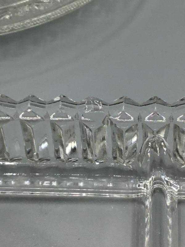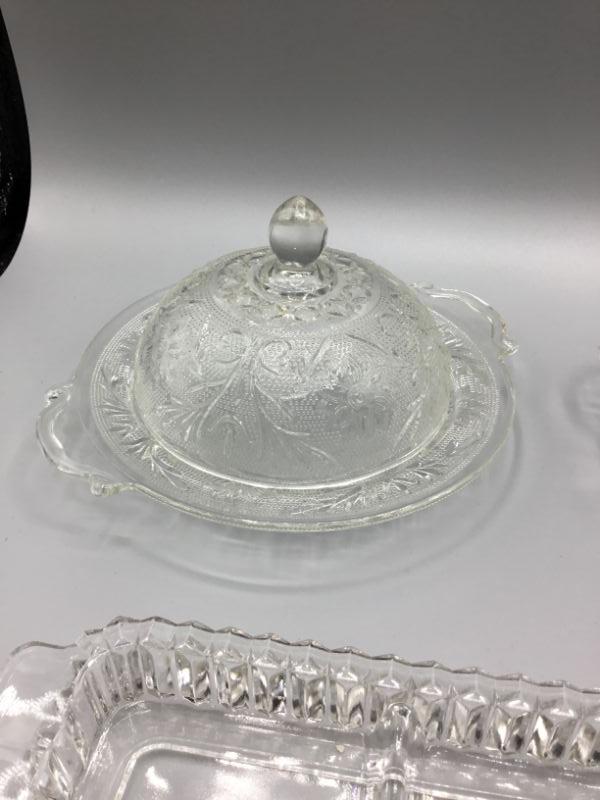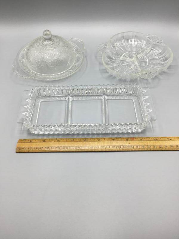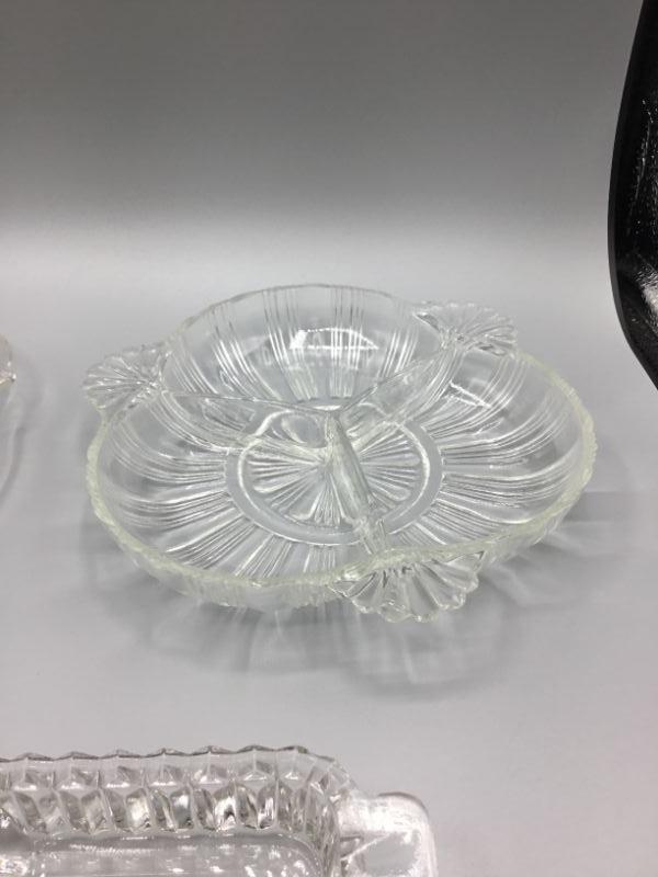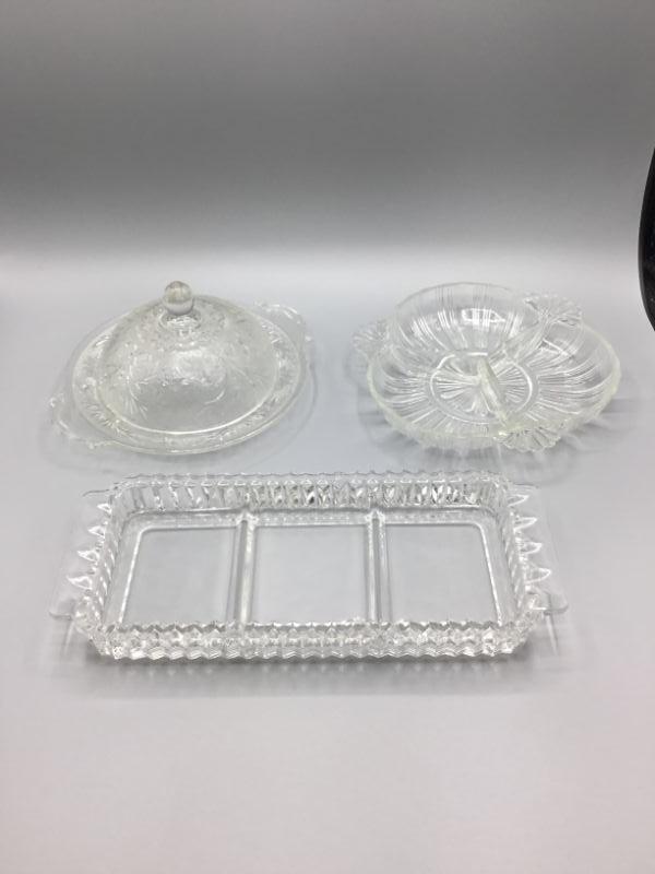 Vintage glass serving pieces. Includes a rectangle divided relish dish, a scalloped divided dish, and a covered butter/cheese dish. The sawtooth edge of the rectangle piece does have one chipped tooth edge.