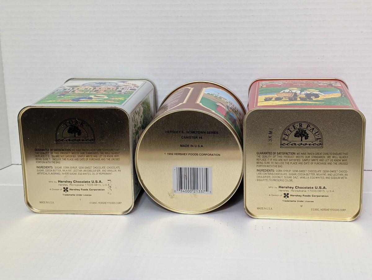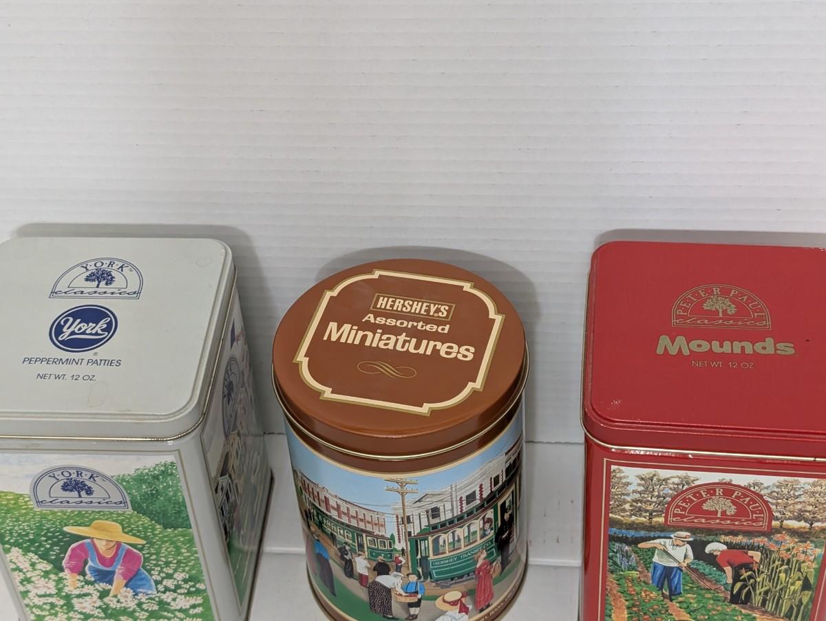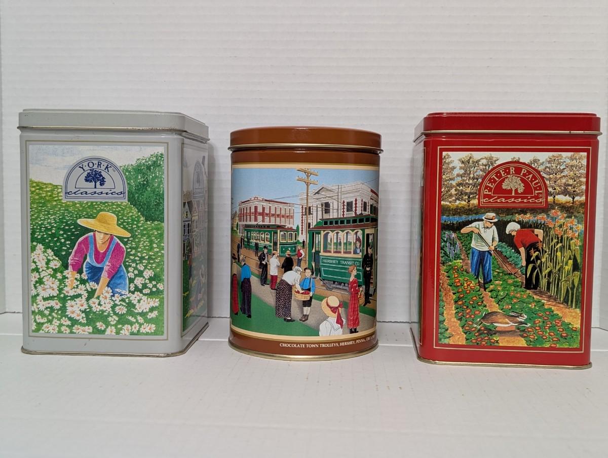 vintage Hershey tins, York Classics tin, Peter Paul Classics tin, Chocolate Town Trolley tin, Hershey advertising collectible, retro kitchen decor, vintage candy tins, food advertising tins, Hershey memorabilia, collectible storage tins