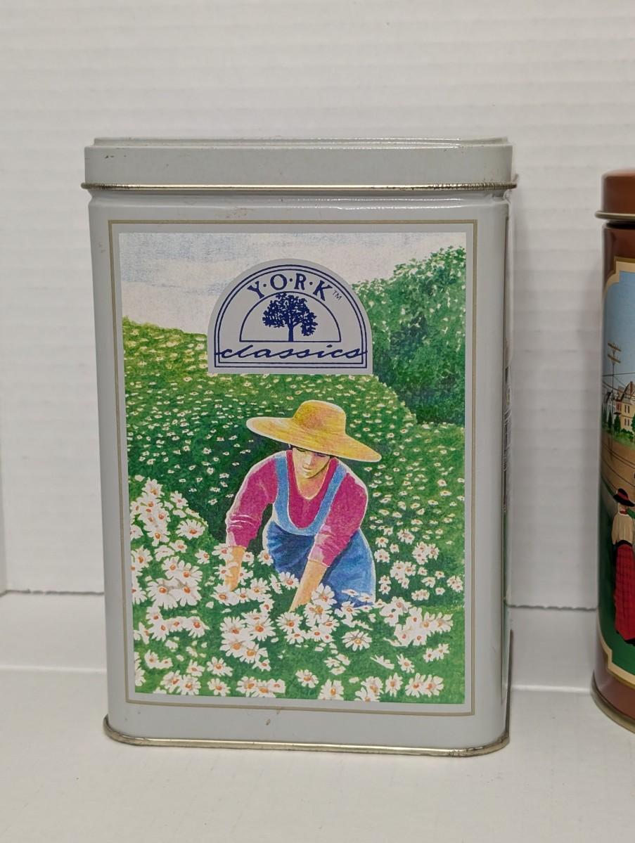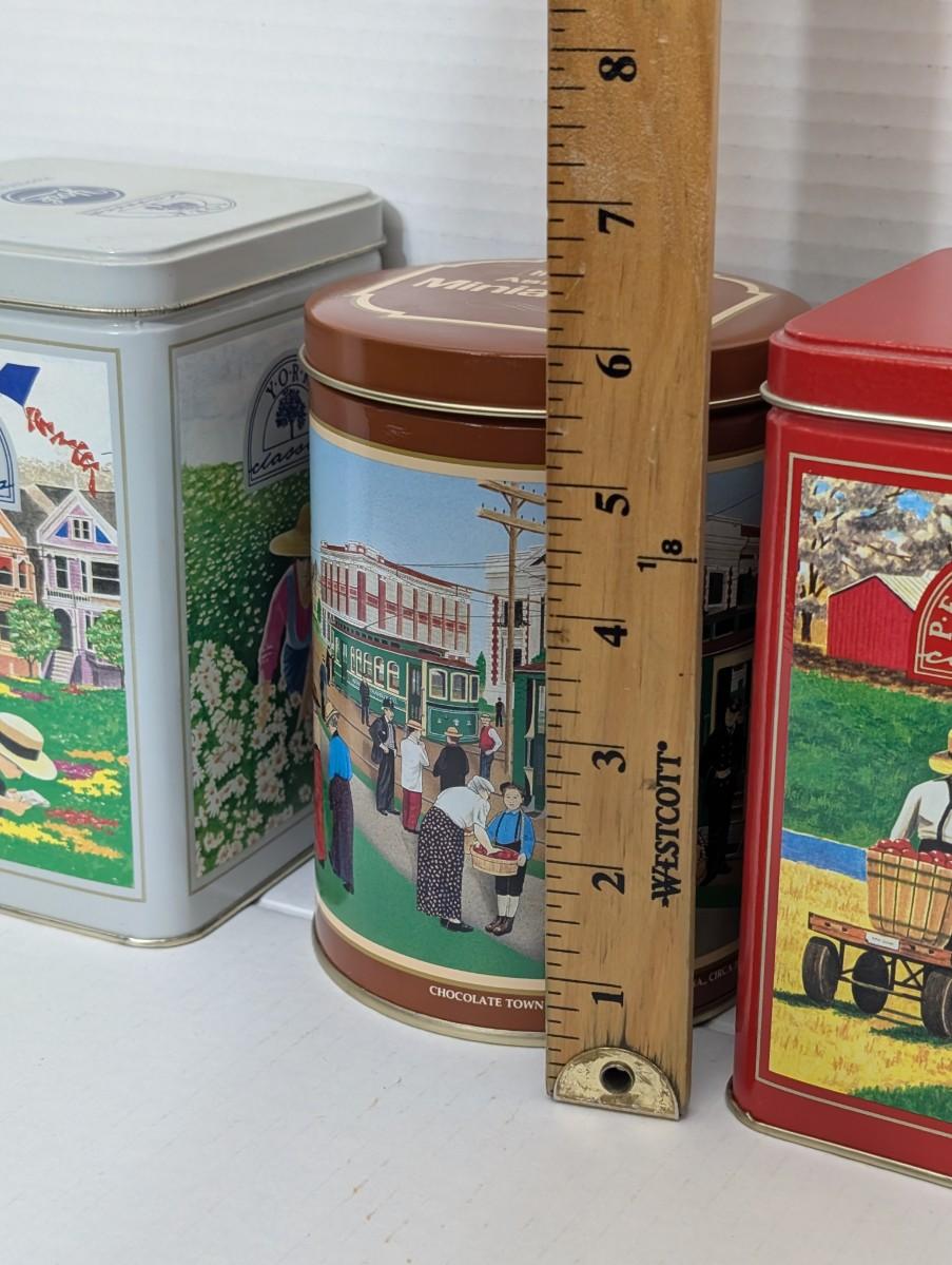 Collection of 3 vintage Hershey’s Classics tins, each featuring colorful artwork. Includes a York Classics tin with a floral field worker design, a Peter Paul Classics tin with farm scene artwork, and a round Hershey’s Chocolate Town Trolley tin depicting a busy streetcar scene in Hershey, Pennsylvania. Great for collectors of advertising tins, kitchen décor, or Hershey’s memorabilia.