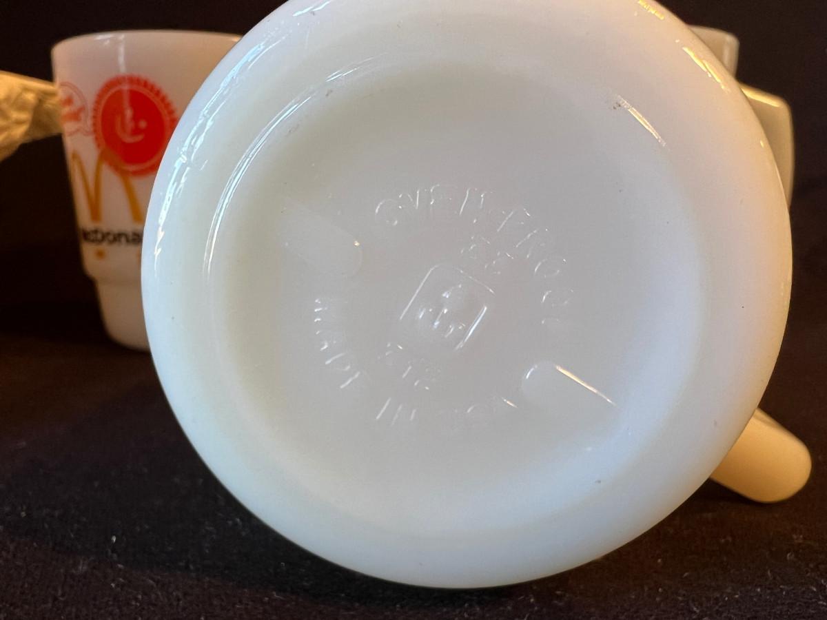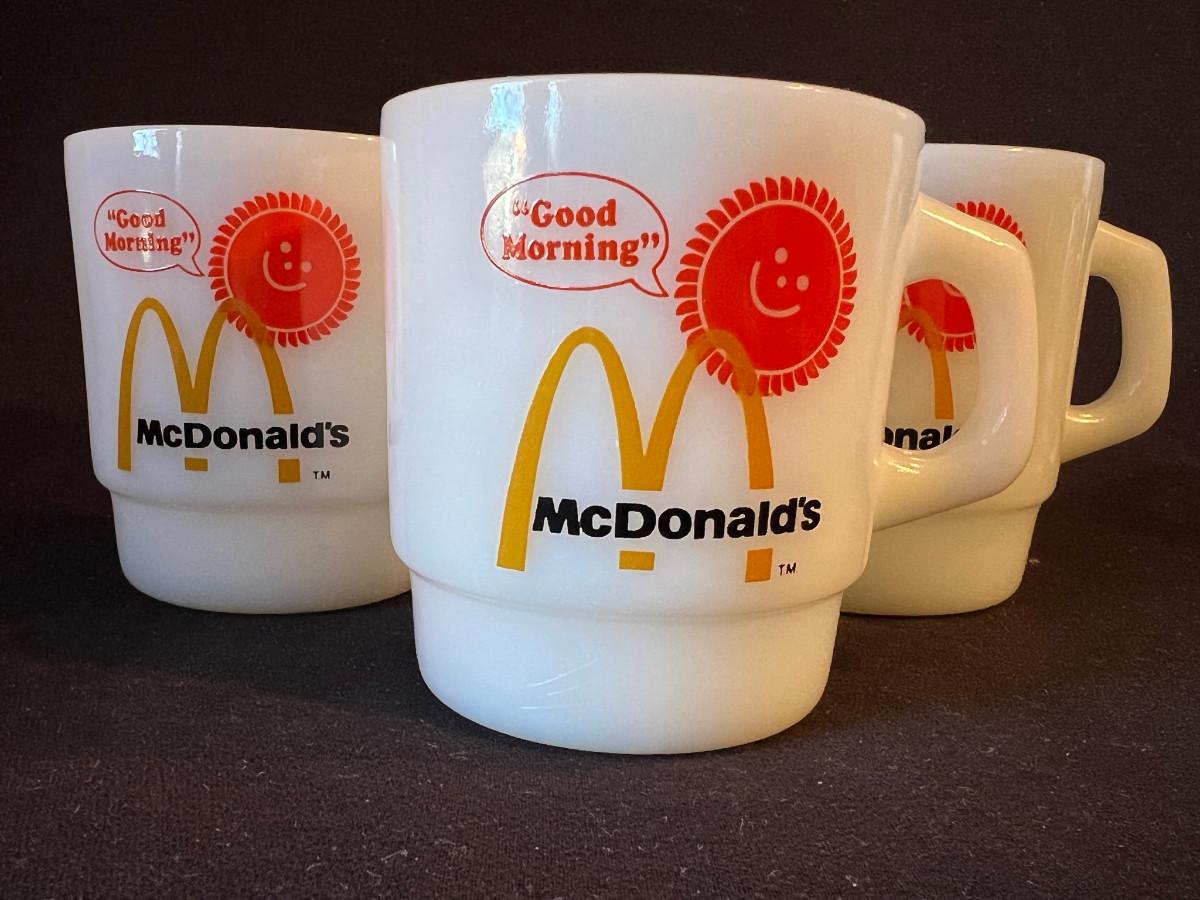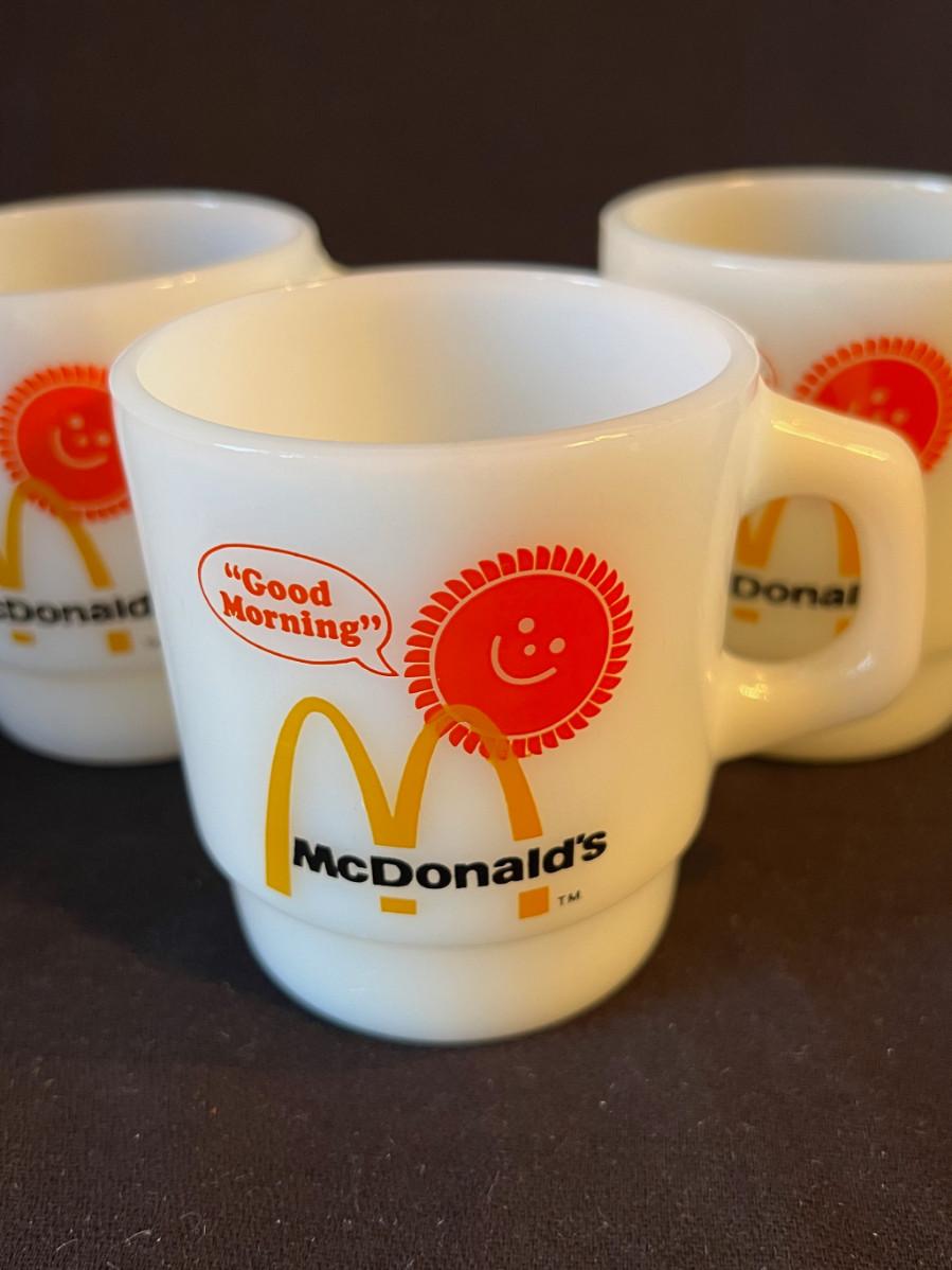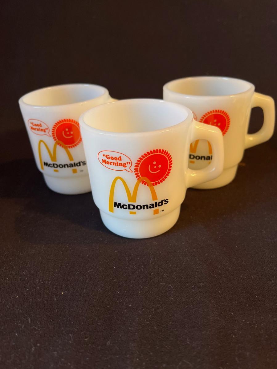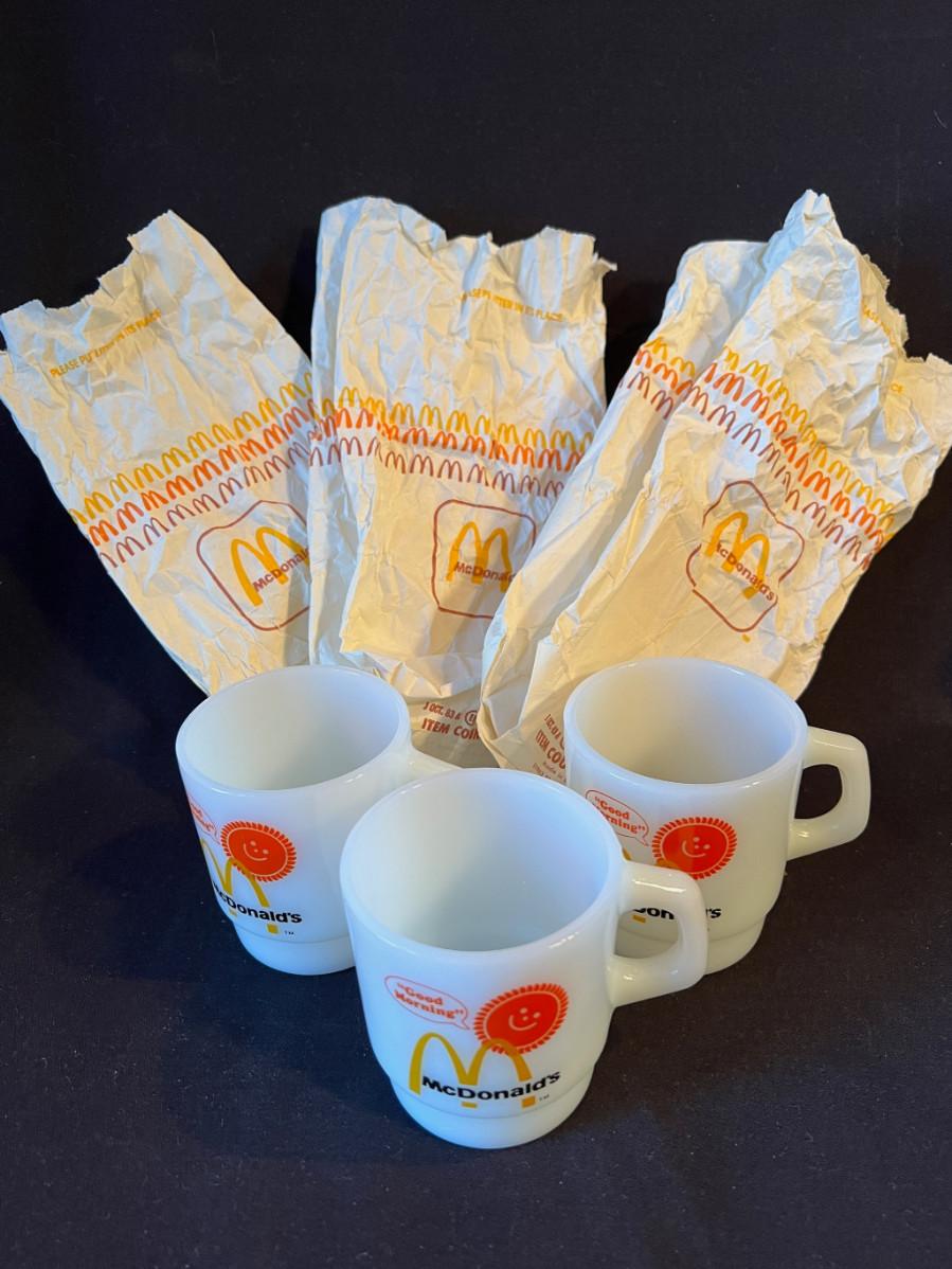 Set of 3 Vintage McDonald's White Milkglass Coffee Mugs and original McDonalds bags they came in! From Anchor Hocking. Good Morning!