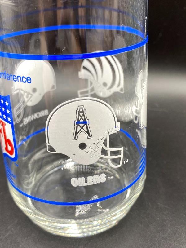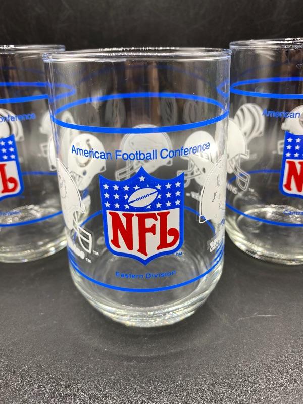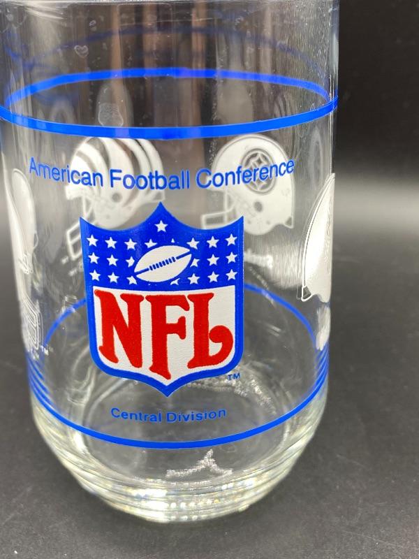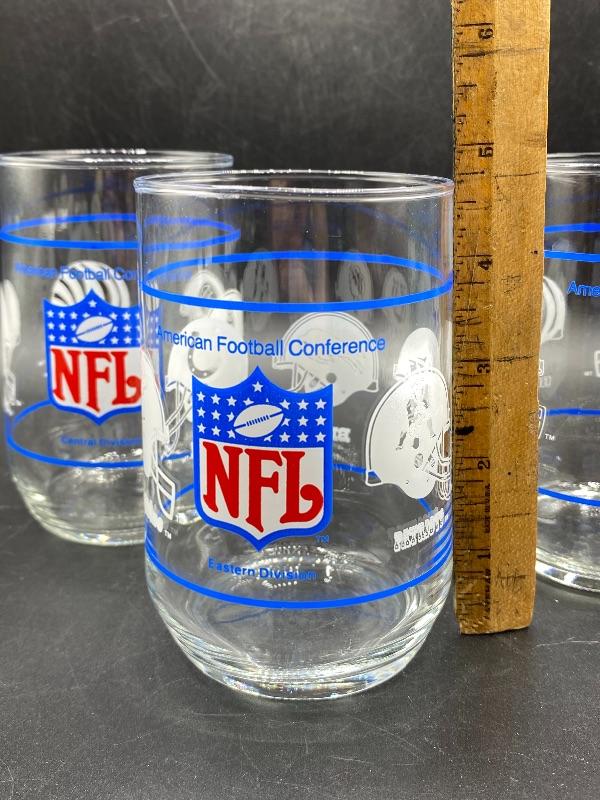 Set of 3 vintage NFL AFC division glasses. Tumbler size at 4.75". Feature helmets of the teams in the division. Two are AFC Central and the other is AFC Eastern. Definitely vintage Central Division has the Houston Oilers helmet on it. Excellent condition.
