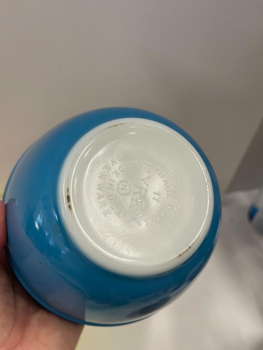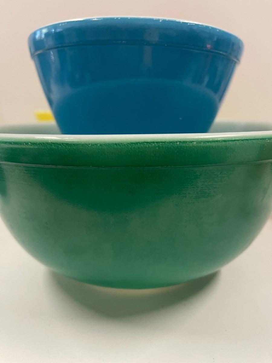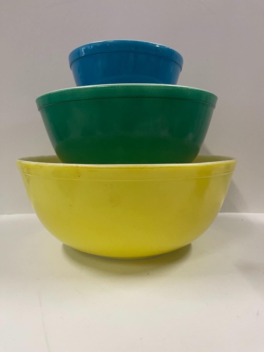 Set of 3 vintage Pyrex primary mixing bowls. Missing the red bowl. Good condition. shows some wear.
