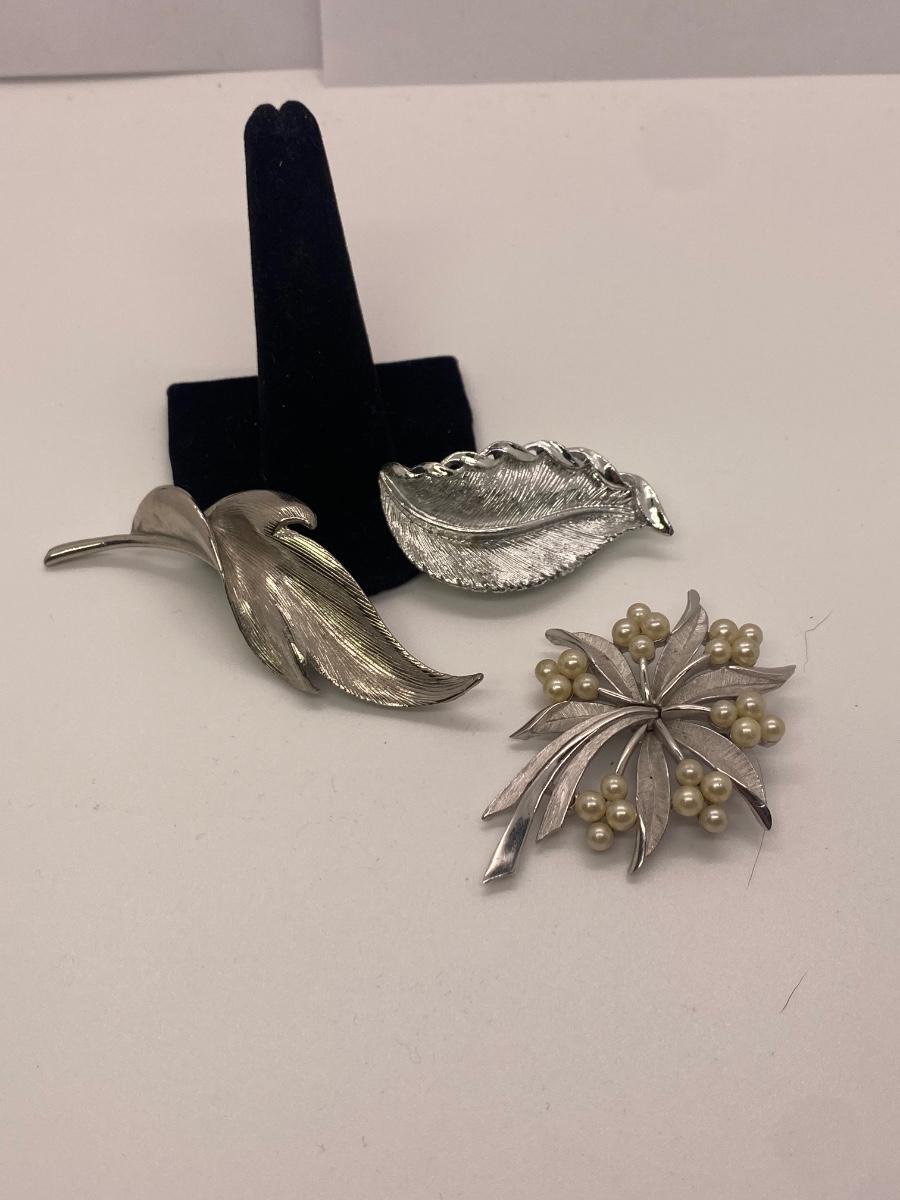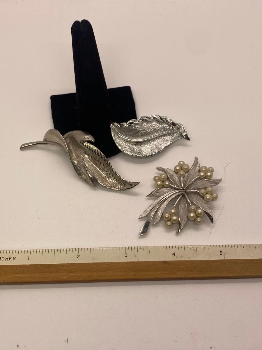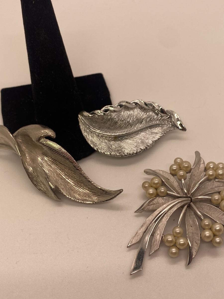 Set of 3 Vintage Silver Tone Pin Brooches. Good vintage condition. A couple are signed, Gerrys and Trifari. Can't tell if it is a crown Trifari by the stamp, looks like it might be.