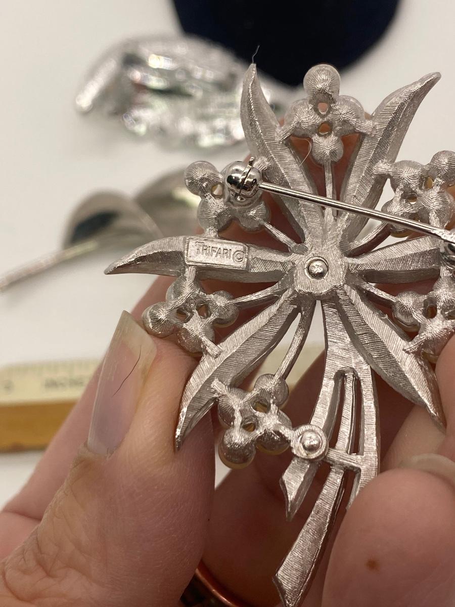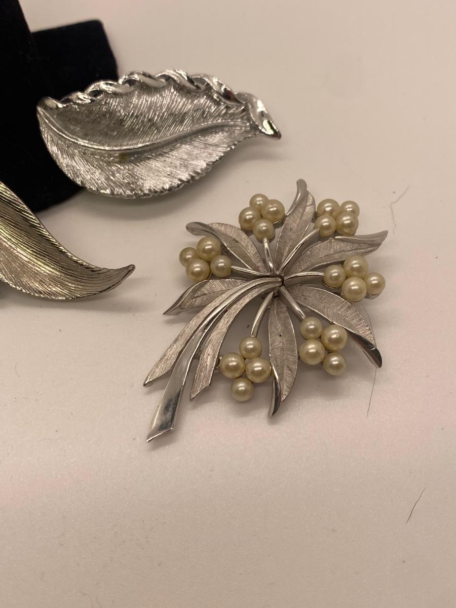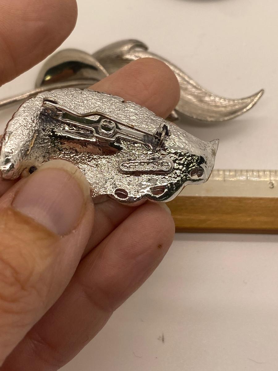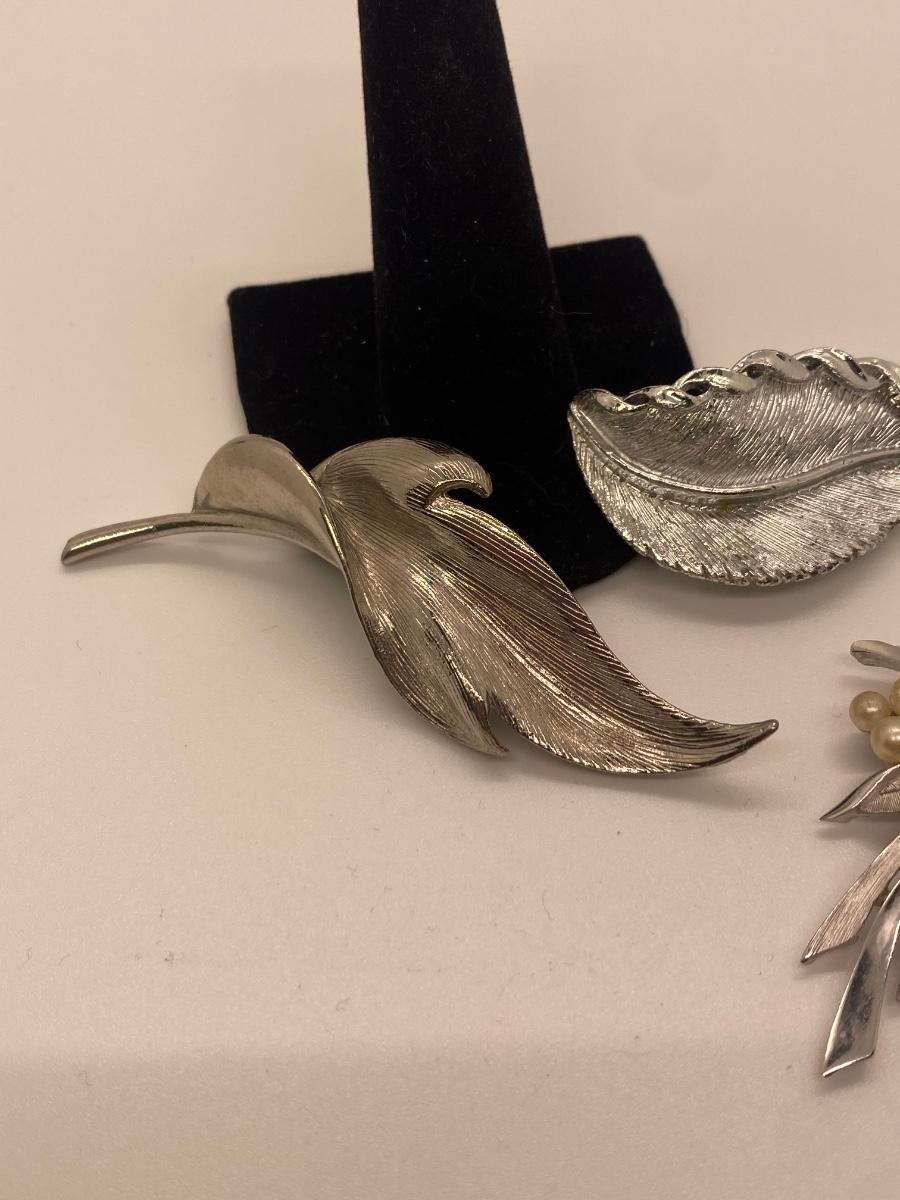 Set of 3 Vintage Silver Tone Pin Brooches. Good vintage condition. A couple are signed, Gerrys and Trifari. Can't tell if it is a crown Trifari by the stamp, looks like it might be.