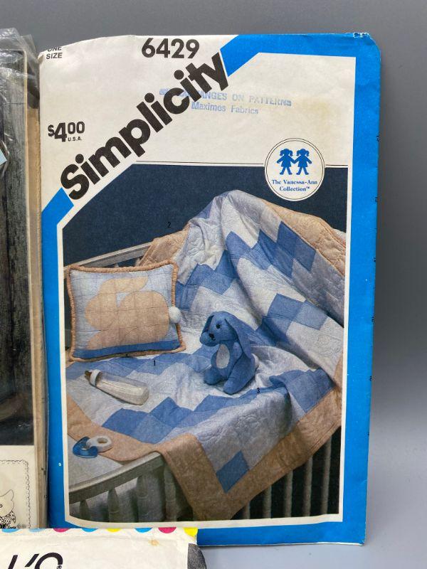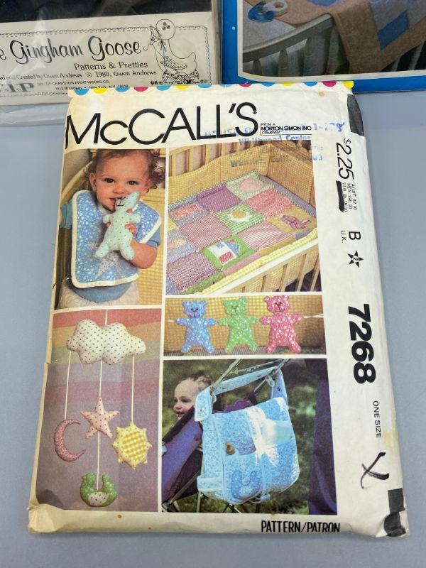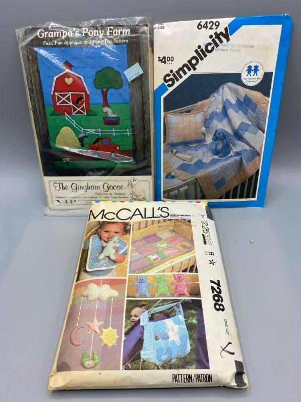 Set of 3 vintage child/ infant patterns. Simplicity, McCalls, and the Gingham Goose. Patterns are for blankets and crib accessories. Good condition, well kept.