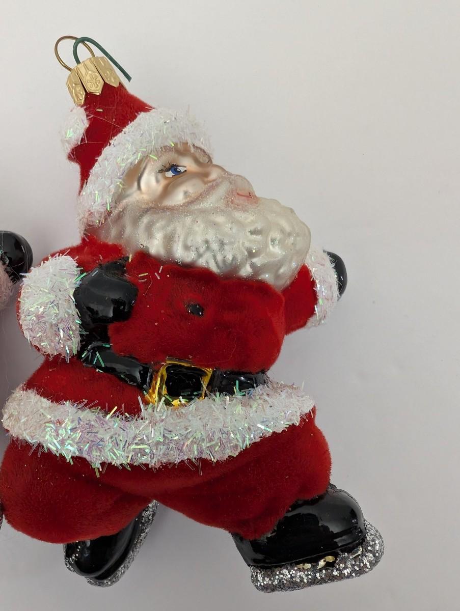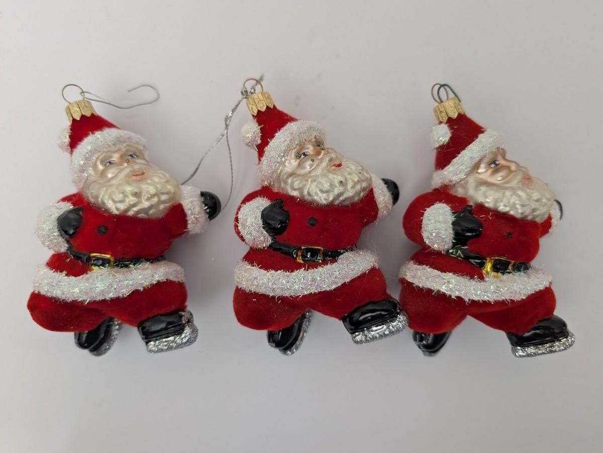 This festive set includes three vintage style Santa Claus ornaments, each with a jolly face, glittered trim, and plush red velvet suits. Detailed with shiny black boots and classic belts, these Santas bring nostalgic holiday cheer to your Christmas tree. A fun collectible set perfect for traditional décor or gifting.