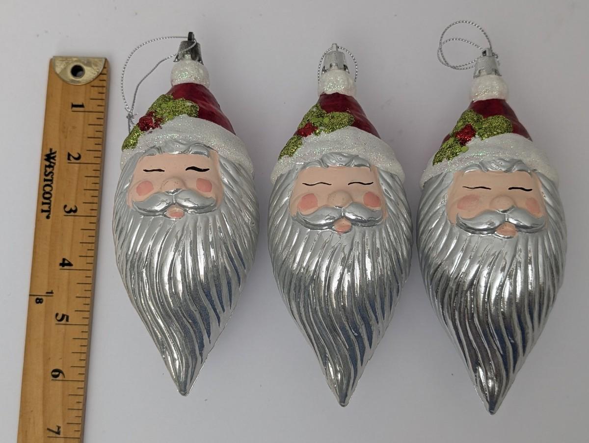This set of three plastic Santa head ornaments features a charming vintage inspired design with jolly faces framed by flowing silver beards and festive red hats accented with holly and glitter. Lightweight and durable these ornaments are perfect for decorating your Christmas tree without worry of breakage while still giving the look of classic glass ornaments. Their whimsical smiling faces add a cheerful holiday touch to any festive display.